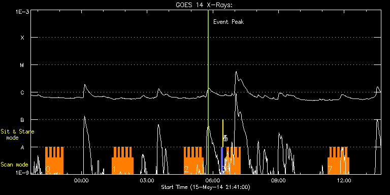 EIS Observation timeline overlay to GOES-Xray curve Code 1" 2" 40" 266" EIS Observations list for this event: STUDY ACRONYM ID DATE OBSERVED DESCRIPTION NOAA# TARGET 0 HH_Flare+AR_180x152 | 40508 | 2014/05/15 22:21:40 | Flare study | | Flare TIMELINE ID DATE OBSERVED FITS FILE XCEN (+W/-E) YCEN (+N/-S) DUR ----------------------------------------------------------------------------------------------------------------- 40508 | 2014/05/15 22:21:40.000 | eis_l0_20140515_222140.fits.gz | 703.28 | 90.10 | 5m18s 40508 | 2014/05/15 22:27:01.000 | eis_l0_20140515_222701.fits.gz | 703.90 | 89.87 | 5m17s 40508 | 2014/05/15 22:32:21.000 | eis_l0_20140515_223221.fits.gz | 704.44 | 89.87 | 5m19s 40508 | 2014/05/15 22:37:42.000 | eis_l0_20140515_223742.fits.gz | 704.98 | 90.10 | 5m18s 40508 | 2014/05/15 22:43:03.000 | eis_l0_20140515_224303.fits.gz | 705.45 | 89.80 | 5m17s 40508 | 2014/05/15 22:48:23.000 | eis_l0_20140515_224823.fits.gz | 705.99 | 89.80 | 5m18s 40508 | 2014/05/15 22:53:44.000 | eis_l0_20140515_225344.fits.gz | 706.53 | 89.80 | 5m18s 40508 | 2014/05/15 22:59:05.000 | eis_l0_20140515_225905.fits.gz | 707.14 | 89.80 | 5m18s 40508 | 2014/05/15 23:04:26.000 | eis_l0_20140515_230426.fits.gz | 707.76 | 89.72 | 5m18s 1 HH_Flare+AR_180x152 | 40510 | 2014/05/16 01:23:44 | Flare study | 2056 | Flare TIMELINE ID DATE OBSERVED FITS FILE XCEN (+W/-E) YCEN (+N/-S) DUR ----------------------------------------------------------------------------------------------------------------- 40510 | 2014/05/16 01:23:44.000 | eis_l0_20140516_012344.fits.gz | 721.67 | 88.95 | 5m18s 40510 | 2014/05/16 01:29:05.000 | eis_l0_20140516_012905.fits.gz | 722.21 | 88.95 | 5m18s 40510 | 2014/05/16 01:34:25.000 | eis_l0_20140516_013425.fits.gz | 722.83 | 88.87 | 5m18s 40510 | 2014/05/16 01:39:46.000 | eis_l0_20140516_013946.fits.gz | 723.29 | 88.79 | 5m18s 40510 | 2014/05/16 01:45:07.000 | eis_l0_20140516_014507.fits.gz | 723.83 | 88.79 | 5m17s 40510 | 2014/05/16 01:50:27.000 | eis_l0_20140516_015027.fits.gz | 724.37 | 88.79 | 5m18s 40510 | 2014/05/16 01:55:48.000 | eis_l0_20140516_015548.fits.gz | 724.91 | 88.71 | 5m19s 40510 | 2014/05/16 02:01:09.000 | eis_l0_20140516_020109.fits.gz | 725.38 | 88.71 | 5m18s 40510 | 2014/05/16 02:06:29.000 | eis_l0_20140516_020629.fits.gz | 725.91 | 88.64 | 5m19s 40510 | 2014/05/16 02:11:50.000 | eis_l0_20140516_021150.fits.gz | 726.46 | 88.71 | 5m18s 40510 | 2014/05/16 02:17:11.000 | eis_l0_20140516_021711.fits.gz | 727.00 | 88.64 | 5m18s 2 HH_Flare+AR_180x152 | 40512 | 2014/05/16 04:40:44 | Flare study | 2056 | Flare TIMELINE ID DATE OBSERVED FITS FILE XCEN (+W/-E) YCEN (+N/-S) DUR ----------------------------------------------------------------------------------------------------------------- 40512 | 2014/05/16 04:40:44.000 | eis_l0_20140516_044044.fits.gz | 730.51 | 87.79 | 5m17s 40512 | 2014/05/16 04:46:04.000 | eis_l0_20140516_044604.fits.gz | 731.13 | 87.63 | 5m18s 40512 | 2014/05/16 04:51:25.000 | eis_l0_20140516_045125.fits.gz | 731.67 | 87.71 | 5m18s 40512 | 2014/05/16 04:56:46.000 | eis_l0_20140516_045646.fits.gz | 732.21 | 87.56 | 5m18s 40512 | 2014/05/16 05:02:06.000 | eis_l0_20140516_050206.fits.gz | 732.68 | 87.56 | 5m19s 40512 | 2014/05/16 05:07:28.000 | eis_l0_20140516_050728.fits.gz | 733.22 | 87.40 | 5m17s 40512 | 2014/05/16 05:12:48.000 | eis_l0_20140516_051248.fits.gz | 733.60 | 87.48 | 5m18s 40512 | 2014/05/16 05:18:09.000 | eis_l0_20140516_051809.fits.gz | 734.14 | 87.40 | 5m18s 40512 | 2014/05/16 05:23:30.000 | eis_l0_20140516_052330.fits.gz | 734.68 | 87.32 | 5m18s 40512 | 2014/05/16 05:28:51.000 | eis_l0_20140516_052851.fits.gz | 735.22 | 87.32 | 5m18s 3 PRY_slot_contextLITE | 40520 | 2014/05/16 06:23:20 | PRY_slot_contextLITE | 2064 | Active Region TIMELINE ID DATE OBSERVED FITS FILE XCEN (+W/-E) YCEN (+N/-S) DUR ----------------------------------------------------------------------------------------------------------------- 40520 | 2014/05/16 06:23:20.000 | eis_l0_20140516_062320.fits.gz | -15.29 | -0.65 | 2m56s 4 Alignment_266 | 40521 | 2014/05/16 06:26:35 | Alignment_266 | 2064 | Quiet Sun TIMELINE ID DATE OBSERVED FITS FILE XCEN (+W/-E) YCEN (+N/-S) DUR ----------------------------------------------------------------------------------------------------------------- 40521 | 2014/05/16 06:26:35.000 | eis_l0_20140516_062635.fits.gz | -132.49 | -0.50 | 1m21s 5 XRT_synop_AIA | 40522 | 2014/05/16 06:28:42 | XRT_synop_AIA | 2064 | Quiet Sun TIMELINE ID DATE OBSERVED FITS FILE XCEN (+W/-E) YCEN (+N/-S) DUR ----------------------------------------------------------------------------------------------------------------- 40522 | 2014/05/16 06:28:42.000 | eis_l0_20140516_062842.fits.gz | -132.49 | -0.35 | 10s 6 HH_Flare+AR_180x152 | 40513 | 2014/05/16 06:33:21 | Flare study | 2056 | Flare TIMELINE ID DATE OBSERVED FITS FILE XCEN (+W/-E) YCEN (+N/-S) DUR ----------------------------------------------------------------------------------------------------------------- 40513 | 2014/05/16 06:33:21.000 | eis_l0_20140516_063321.fits.gz | 741.25 | 87.09 | 5m18s 40513 | 2014/05/16 06:38:41.000 | eis_l0_20140516_063841.fits.gz | 741.79 | 86.94 | 5m18s 40513 | 2014/05/16 06:44:02.000 | eis_l0_20140516_064402.fits.gz | 742.26 | 87.01 | 5m17s 40513 | 2014/05/16 06:49:22.000 | eis_l0_20140516_064922.fits.gz | 742.72 | 86.78 | 5m18s 40513 | 2014/05/16 06:54:43.000 | eis_l0_20140516_065443.fits.gz | 743.18 | 86.78 | 5m19s 40513 | 2014/05/16 07:00:05.000 | eis_l0_20140516_070005.fits.gz | 743.65 | 86.63 | 5m17s 40513 | 2014/05/16 07:05:25.000 | eis_l0_20140516_070525.fits.gz | 744.19 | 86.78 | 5m19s 40513 | 2014/05/16 07:10:46.000 | eis_l0_20140516_071046.fits.gz | 744.73 | 86.55 | 5m18s 7 HH_Flare+AR_180x152 | 40514 | 2014/05/16 11:14:40 | Flare study | 2056 | Flare TIMELINE ID DATE OBSERVED FITS FILE XCEN (+W/-E) YCEN (+N/-S) DUR ----------------------------------------------------------------------------------------------------------------- 40514 | 2014/05/16 11:14:40.000 | eis_l0_20