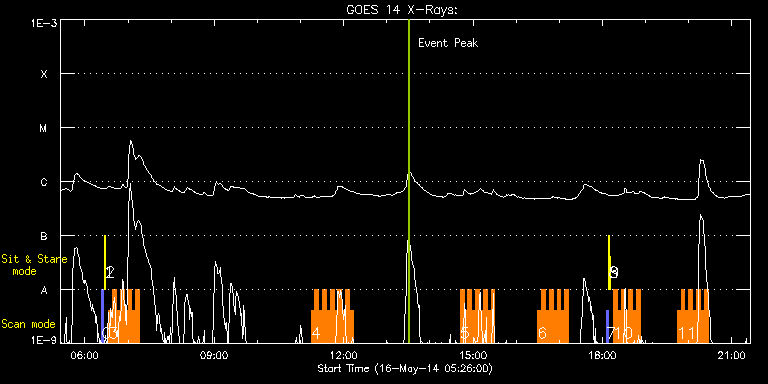 EIS Observation timeline overlay to GOES-Xray curve Code 1" 2" 40" 266" EIS Observations list for this event: STUDY ACRONYM ID DATE OBSERVED DESCRIPTION NOAA# TARGET 0 PRY_slot_contextLITE | 40520 | 2014/05/16 06:23:20 | PRY_slot_contextLITE | 2064 | Active Region TIMELINE ID DATE OBSERVED FITS FILE XCEN (+W/-E) YCEN (+N/-S) DUR ----------------------------------------------------------------------------------------------------------------- 40520 | 2014/05/16 06:23:20.000 | eis_l0_20140516_062320.fits.gz | -15.29 | -0.65 | 2m56s 1 Alignment_266 | 40521 | 2014/05/16 06:26:35 | Alignment_266 | 2064 | Quiet Sun TIMELINE ID DATE OBSERVED FITS FILE XCEN (+W/-E) YCEN (+N/-S) DUR ----------------------------------------------------------------------------------------------------------------- 40521 | 2014/05/16 06:26:35.000 | eis_l0_20140516_062635.fits.gz | -132.49 | -0.50 | 1m21s 2 XRT_synop_AIA | 40522 | 2014/05/16 06:28:42 | XRT_synop_AIA | 2064 | Quiet Sun TIMELINE ID DATE OBSERVED FITS FILE XCEN (+W/-E) YCEN (+N/-S) DUR ----------------------------------------------------------------------------------------------------------------- 40522 | 2014/05/16 06:28:42.000 | eis_l0_20140516_062842.fits.gz | -132.49 | -0.35 | 10s 3 HH_Flare+AR_180x152 | 40513 | 2014/05/16 06:33:21 | Flare study | 2056 | Flare TIMELINE ID DATE OBSERVED FITS FILE XCEN (+W/-E) YCEN (+N/-S) DUR ----------------------------------------------------------------------------------------------------------------- 40513 | 2014/05/16 06:33:21.000 | eis_l0_20140516_063321.fits.gz | 741.25 | 87.09 | 5m18s 40513 | 2014/05/16 06:38:41.000 | eis_l0_20140516_063841.fits.gz | 741.79 | 86.94 | 5m18s 40513 | 2014/05/16 06:44:02.000 | eis_l0_20140516_064402.fits.gz | 742.26 | 87.01 | 5m17s 40513 | 2014/05/16 06:49:22.000 | eis_l0_20140516_064922.fits.gz | 742.72 | 86.78 | 5m18s 40513 | 2014/05/16 06:54:43.000 | eis_l0_20140516_065443.fits.gz | 743.18 | 86.78 | 5m19s 40513 | 2014/05/16 07:00:05.000 | eis_l0_20140516_070005.fits.gz | 743.65 | 86.63 | 5m17s 40513 | 2014/05/16 07:05:25.000 | eis_l0_20140516_070525.fits.gz | 744.19 | 86.78 | 5m19s 40513 | 2014/05/16 07:10:46.000 | eis_l0_20140516_071046.fits.gz | 744.73 | 86.55 | 5m18s 4 HH_Flare+AR_180x152 | 40514 | 2014/05/16 11:14:40 | Flare study | 2056 | Flare TIMELINE ID DATE OBSERVED FITS FILE XCEN (+W/-E) YCEN (+N/-S) DUR ----------------------------------------------------------------------------------------------------------------- 40514 | 2014/05/16 11:14:40.000 | eis_l0_20140516_111440.fits.gz | 766.59 | 85.16 | 5m18s 40514 | 2014/05/16 11:20:01.000 | eis_l0_20140516_112001.fits.gz | 767.21 | 85.16 | 5m17s 40514 | 2014/05/16 11:25:21.000 | eis_l0_20140516_112521.fits.gz | 767.67 | 85.08 | 5m17s 40514 | 2014/05/16 11:30:41.000 | eis_l0_20140516_113041.fits.gz | 768.06 | 85.08 | 5m18s 40514 | 2014/05/16 11:36:02.000 | eis_l0_20140516_113602.fits.gz | 768.52 | 84.77 | 5m18s 40514 | 2014/05/16 11:41:23.000 | eis_l0_20140516_114123.fits.gz | 768.91 | 84.85 | 5m17s 40514 | 2014/05/16 11:46:43.000 | eis_l0_20140516_114643.fits.gz | 769.45 | 84.85 | 5m18s 40514 | 2014/05/16 11:52:04.000 | eis_l0_20140516_115204.fits.gz | 769.83 | 84.93 | 5m18s 40514 | 2014/05/16 11:57:25.000 | eis_l0_20140516_115725.fits.gz | 770.30 | 84.70 | 5m18s 40514 | 2014/05/16 12:02:46.000 | eis_l0_20140516_120246.fits.gz | 770.84 | 84.85 | 5m17s 40514 | 2014/05/16 12:08:06.000 | eis_l0_20140516_120806.fits.gz | 771.22 | 84.85 | 5m19s 5 HH_Flare+AR_180x152 | 40516 | 2014/05/16 14:42:13 | Flare study | 2056 | Flare TIMELINE ID DATE OBSERVED FITS FILE XCEN (+W/-E) YCEN (+N/-S) DUR ----------------------------------------------------------------------------------------------------------------- 40516 | 2014/05/16 14:42:13.000 | eis_l0_20140516_144213.fits.gz | 784.43 | 83.77 | 5m18s 40516 | 2014/05/16 14:47:34.000 | eis_l0_20140516_144734.fits.gz | 784.74 | 83.77 | 5m18s 40516 | 2014/05/16 14:52:55.000 | eis_l0_20140516_145255.fits.gz | 785.28 | 83.62 | 5m17s 40516 | 2014/05/16 14:58:15.000 | eis_l0_20140516_145815.fits.gz | 785.67 | 83.62 | 5m17s 40516 | 2014/05/16 15:03:35.000 | eis_l0_20140516_150335.fits.gz | 786.13 | 83.69 | 5m18s 40516 | 2014/05/16 15:08:56.000 | eis_l0_20140516_150856.fits.gz | 786.52 | 83.62 | 5m17s 40516 | 2014/05/16 15:14:16.000 | eis_l0_20140516_151416.fits.gz | 787.06 | 83.46 | 5m18s 40516 | 2014/05/16 15:19:37.000 | eis_l0_20140516_151937.fits.gz | 787.45 | 83.54 | 5m18s 40516 | 2014/05/16 15:24:58.000 | eis_l0_20140516_152458.fits.gz | 787.99 | 83.46 | 5m17s 6 HH_Flare+AR_180x152 | 40529 | 2014/05/16 16:30:13 | Flare study | 2056 | Flare TIMELINE ID DATE OBSERVED FITS FILE XCEN (+W/-E) YCEN (+N/-S) DUR ----------------------------------------------------------------------------------------------------------------- 40529 | 2014/05/16 16:30:13.000 | eis_l0_20140516_163013.fits.gz | 793.16 | 83.07 | 5m18s 40529 | 2014/05/16 16:35:34.000 | eis_l0_20140516_163534.fits.gz | 793.70 | 83.07 | 5m17s 40529 | 2014/05/16 16:40:54.000 | eis_l0_20140516_164054.fits.gz | 794.01 | 83.15 | 5m17s 40529 | 2014/05/16 16:46:14.000 | eis_l0_20140516_164614.fits.gz | 794.55 | 83.00 | 5m18s 40529 | 2014/05/16 16:51:35.000 | eis_l0_20140516_165135.fits.gz | 794.86 | 82.84 | 5m17s 40529 | 2014/05/16 16:56:55.000 | eis_l0_20140516_165655.fits.gz | 795.40 | 82.92 | 5m18s 40529 | 2014/05/16 17:02:16.000 | eis_l0_20140516_170216.fits.gz | 795.86 | 82.84 | 5m18s 40529 | 2014/05/16 17:07:37.000 | eis_l0_20140516_170737.fits.gz | 796.25 | 82.84 | 5m18s 7 PRY_slot_contextLITE | 40523 | 2014/05/16 18:05:20 | PRY_slot_contextLITE | 2064 | Active Region TIMELINE ID DATE OBSERVED FITS FILE XCEN (+W/-E) YCEN (+N/-S) DUR ----------------------------------------------------------------------------------------------------------------- 40523 | 2014/05/16 18:05:20.000 | eis_l0_20140516_180520.fits.gz | -15.21 | -0.65 | 2m57s 8 Alignment_266 | 40524 | 2014/05/16 18:08:35 | Alignment_266 | 2064 | Quiet Sun TIMELINE ID DATE OBSERVED FIT