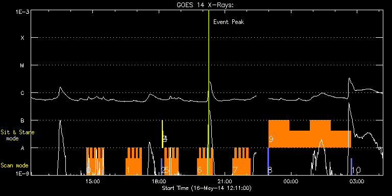 EIS Observation timeline overlay to GOES-Xray curve Code 1" 2" 40" 266" EIS Observations list for this event: STUDY ACRONYM ID DATE OBSERVED DESCRIPTION NOAA# TARGET 0 HH_Flare+AR_180x152 | 40516 | 2014/05/16 14:42:13 | Flare study | 2056 | Flare TIMELINE ID DATE OBSERVED FITS FILE XCEN (+W/-E) YCEN (+N/-S) DUR ----------------------------------------------------------------------------------------------------------------- 40516 | 2014/05/16 14:42:13.000 | eis_l0_20140516_144213.fits.gz | 784.43 | 83.77 | 5m18s 40516 | 2014/05/16 14:47:34.000 | eis_l0_20140516_144734.fits.gz | 784.74 | 83.77 | 5m18s 40516 | 2014/05/16 14:52:55.000 | eis_l0_20140516_145255.fits.gz | 785.28 | 83.62 | 5m17s 40516 | 2014/05/16 14:58:15.000 | eis_l0_20140516_145815.fits.gz | 785.67 | 83.62 | 5m17s 40516 | 2014/05/16 15:03:35.000 | eis_l0_20140516_150335.fits.gz | 786.13 | 83.69 | 5m18s 40516 | 2014/05/16 15:08:56.000 | eis_l0_20140516_150856.fits.gz | 786.52 | 83.62 | 5m17s 40516 | 2014/05/16 15:14:16.000 | eis_l0_20140516_151416.fits.gz | 787.06 | 83.46 | 5m18s 40516 | 2014/05/16 15:19:37.000 | eis_l0_20140516_151937.fits.gz | 787.45 | 83.54 | 5m18s 40516 | 2014/05/16 15:24:58.000 | eis_l0_20140516_152458.fits.gz | 787.99 | 83.46 | 5m17s 1 HH_Flare+AR_180x152 | 40529 | 2014/05/16 16:30:13 | Flare study | 2056 | Flare TIMELINE ID DATE OBSERVED FITS FILE XCEN (+W/-E) YCEN (+N/-S) DUR ----------------------------------------------------------------------------------------------------------------- 40529 | 2014/05/16 16:30:13.000 | eis_l0_20140516_163013.fits.gz | 793.16 | 83.07 | 5m18s 40529 | 2014/05/16 16:35:34.000 | eis_l0_20140516_163534.fits.gz | 793.70 | 83.07 | 5m17s 40529 | 2014/05/16 16:40:54.000 | eis_l0_20140516_164054.fits.gz | 794.01 | 83.15 | 5m17s 40529 | 2014/05/16 16:46:14.000 | eis_l0_20140516_164614.fits.gz | 794.55 | 83.00 | 5m18s 40529 | 2014/05/16 16:51:35.000 | eis_l0_20140516_165135.fits.gz | 794.86 | 82.84 | 5m17s 40529 | 2014/05/16 16:56:55.000 | eis_l0_20140516_165655.fits.gz | 795.40 | 82.92 | 5m18s 40529 | 2014/05/16 17:02:16.000 | eis_l0_20140516_170216.fits.gz | 795.86 | 82.84 | 5m18s 40529 | 2014/05/16 17:07:37.000 | eis_l0_20140516_170737.fits.gz | 796.25 | 82.84 | 5m18s 2 PRY_slot_contextLITE | 40523 | 2014/05/16 18:05:20 | PRY_slot_contextLITE | 2064 | Active Region TIMELINE ID DATE OBSERVED FITS FILE XCEN (+W/-E) YCEN (+N/-S) DUR ----------------------------------------------------------------------------------------------------------------- 40523 | 2014/05/16 18:05:20.000 | eis_l0_20140516_180520.fits.gz | -15.21 | -0.65 | 2m57s 3 Alignment_266 | 40524 | 2014/05/16 18:08:35 | Alignment_266 | 2064 | Quiet Sun TIMELINE ID DATE OBSERVED FITS FILE XCEN (+W/-E) YCEN (+N/-S) DUR ----------------------------------------------------------------------------------------------------------------- 40524 | 2014/05/16 18:08:35.000 | eis_l0_20140516_180835.fits.gz | -132.49 | -0.50 | 1m22s 4 XRT_synop_AIA | 40525 | 2014/05/16 18:10:42 | XRT_synop_AIA | 2064 | Quiet Sun TIMELINE ID DATE OBSERVED FITS FILE XCEN (+W/-E) YCEN (+N/-S) DUR ----------------------------------------------------------------------------------------------------------------- 40525 | 2014/05/16 18:10:42.000 | eis_l0_20140516_181042.fits.gz | -132.57 | -0.50 | 11s 5 HH_Flare+AR_180x152 | 40530 | 2014/05/16 18:15:20 | Flare study | 2056 | Flare TIMELINE ID DATE OBSERVED FITS FILE XCEN (+W/-E) YCEN (+N/-S) DUR ----------------------------------------------------------------------------------------------------------------- 40530 | 2014/05/16 18:15:20.000 | eis_l0_20140516_181520.fits.gz | 801.66 | 82.46 | 5m18s 40530 | 2014/05/16 18:20:40.000 | eis_l0_20140516_182040.fits.gz | 802.04 | 82.30 | 5m19s 40530 | 2014/05/16 18:26:02.000 | eis_l0_20140516_182602.fits.gz | 802.51 | 82.15 | 5m17s 40530 | 2014/05/16 18:31:22.000 | eis_l0_20140516_183122.fits.gz | 802.82 | 82.23 | 5m18s 40530 | 2014/05/16 18:36:43.000 | eis_l0_20140516_183643.fits.gz | 803.28 | 82.23 | 5m17s 40530 | 2014/05/16 18:42:03.000 | eis_l0_20140516_184203.fits.gz | 803.74 | 82.15 | 5m18s 40530 | 2014/05/16 18:47:24.000 | eis_l0_20140516_184724.fits.gz | 804.13 | 82.07 | 5m18s 6 HH_Flare+AR_180x152 | 40531 | 2014/05/16 19:44:10 | Flare study | 2056 | Flare TIMELINE ID DATE OBSERVED FITS FILE XCEN (+W/-E) YCEN (+N/-S) DUR ----------------------------------------------------------------------------------------------------------------- 40531 | 2014/05/16 19:44:10.000 | eis_l0_20140516_194410.fits.gz | 808.53 | 81.68 | 5m19s 40531 | 2014/05/16 19:49:31.000 | eis_l0_20140516_194931.fits.gz | 808.84 | 81.76 | 5m18s 40531 | 2014/05/16 19:54:52.000 | eis_l0_20140516_195452.fits.gz | 809.38 | 81.68 | 5m18s 40531 | 2014/05/16 20:00:12.000 | eis_l0_20140516_200012.fits.gz | 809.69 | 81.61 | 5m18s 40531 | 2014/05/16 20:05:33.000 | eis_l0_20140516_200533.fits.gz | 810.16 | 81.53 | 5m18s 40531 | 2014/05/16 20:10:53.000 | eis_l0_20140516_201053.fits.gz | 810.47 | 81.68 | 5m18s 40531 | 2014/05/16 20:16:14.000 | eis_l0_20140516_201614.fits.gz | 810.93 | 81.53 | 5m18s 40531 | 2014/05/16 20:21:35.000 | eis_l0_20140516_202135.fits.gz | 811.39 | 81.61 | 5m18s 7 HH_Flare+AR_180x152 | 40532 | 2014/05/16 21:21:13 | Flare study | 2056 | Flare TIMELINE ID DATE OBSERVED FITS FILE XCEN (+W/-E) YCEN (+N/-S) DUR ----------------------------------------------------------------------------------------------------------------- 40532 | 2014/05/16 21:21:13.000 | eis_l0_20140516_212113.fits.gz | 815.87 | 80.99 | 5m18s 40532 | 2014/05/16 21:26:34.000 | eis_l0_20140516_212634.fits.gz | 816.34 | 81.22 | 5m17s 40532 | 2014/05/16 21:31:54.000 | eis_l0_20140516_213154.fits.gz | 816.64 | 80.99 | 5m19s 40532 | 2014/05/16 21:37:15.000 | eis_l0_20140516_213715.fits.gz | 817.03 | 81.07 | 5m18s 40532 | 2014/05/16 21:42:36.000 | eis_l0_20140516_214236.fits.gz | 817.42 | 80.99 | 5m17s 40532 | 2014/05/16 21:47:56.000 | eis_l0_20140516_214756.fits.gz | 817.80 | 80.99 | 5m18s 40532 | 2014/05/16 21:53:17.000 | eis_