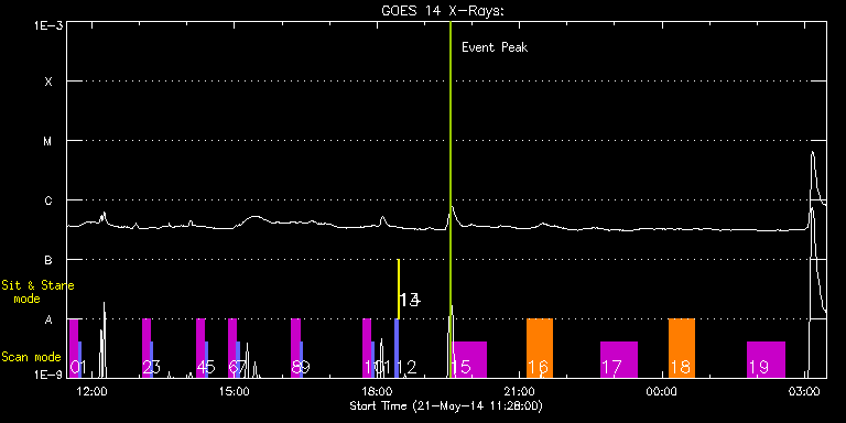 EIS Observation timeline overlay to GOES-Xray curve Code 1" 2" 40" 266" EIS Observations list for this event: STUDY ACRONYM ID DATE OBSERVED DESCRIPTION NOAA# TARGET 0 SK_DEEP_5x512_SLIT1 | 40620 | 2014/05/21 11:32:19 | HOP 79: solar irradiance scan (S-N). 1 | | Quiet Sun TIMELINE ID DATE OBSERVED FITS FILE XCEN (+W/-E) YCEN (+N/-S) DUR ----------------------------------------------------------------------------------------------------------------- 40620 | 2014/05/21 11:32:19.000 | eis_l0_20140521_113219.fits.gz | -11.88 | 404.59 | 10m8s 1 PRY_slot_contextLITE | 40621 | 2014/05/21 11:42:52 | HOP 79: solar irradiance scan (S-N). 1 | | Active Region TIMELINE ID DATE OBSERVED FITS FILE XCEN (+W/-E) YCEN (+N/-S) DUR ----------------------------------------------------------------------------------------------------------------- 40621 | 2014/05/21 11:42:52.000 | eis_l0_20140521_114252.fits.gz | -27.11 | 404.51 | 2m57s 2 SK_DEEP_5x512_SLIT1 | 40622 | 2014/05/21 13:03:19 | HOP 79: solar irradiance scan (S-N). 1 | | Quiet Sun TIMELINE ID DATE OBSERVED FITS FILE XCEN (+W/-E) YCEN (+N/-S) DUR ----------------------------------------------------------------------------------------------------------------- 40622 | 2014/05/21 13:03:19.000 | eis_l0_20140521_130319.fits.gz | -11.88 | 504.70 | 10m8s 3 PRY_slot_contextLITE | 40623 | 2014/05/21 13:13:53 | HOP 79: solar irradiance scan (S-N). 1 | | Active Region TIMELINE ID DATE OBSERVED FITS FILE XCEN (+W/-E) YCEN (+N/-S) DUR ----------------------------------------------------------------------------------------------------------------- 40623 | 2014/05/21 13:13:53.000 | eis_l0_20140521_131353.fits.gz | -27.11 | 504.55 | 2m56s 4 SK_DEEP_5x512_SLIT1 | 40624 | 2014/05/21 14:12:19 | HOP 79: solar irradiance scan (S-N). 1 | | Quiet Sun TIMELINE ID DATE OBSERVED FITS FILE XCEN (+W/-E) YCEN (+N/-S) DUR ----------------------------------------------------------------------------------------------------------------- 40624 | 2014/05/21 14:12:19.000 | eis_l0_20140521_141219.fits.gz | -11.88 | 604.66 | 10m8s 5 PRY_slot_contextLITE | 40625 | 2014/05/21 14:22:53 | HOP 79: solar irradiance scan (S-N). 1 | | Active Region TIMELINE ID DATE OBSERVED FITS FILE XCEN (+W/-E) YCEN (+N/-S) DUR ----------------------------------------------------------------------------------------------------------------- 40625 | 2014/05/21 14:22:53.000 | eis_l0_20140521_142253.fits.gz | -27.11 | 604.73 | 2m56s 6 SK_DEEP_5x512_SLIT1 | 40626 | 2014/05/21 14:52:19 | HOP 79: solar irradiance scan (S-N). 1 | | Quiet Sun TIMELINE ID DATE OBSERVED FITS FILE XCEN (+W/-E) YCEN (+N/-S) DUR ----------------------------------------------------------------------------------------------------------------- 40626 | 2014/05/21 14:52:19.000 | eis_l0_20140521_145219.fits.gz | -11.88 | 704.39 | 10m8s 7 PRY_slot_contextLITE | 40627 | 2014/05/21 15:02:53 | HOP 79: solar irradiance scan (S-N). 1 | | Active Region TIMELINE ID DATE OBSERVED FITS FILE XCEN (+W/-E) YCEN (+N/-S) DUR ----------------------------------------------------------------------------------------------------------------- 40627 | 2014/05/21 15:02:53.000 | eis_l0_20140521_150253.fits.gz | -27.19 | 704.62 | 2m56s 8 SK_DEEP_5x512_SLIT1 | 40628 | 2014/05/21 16:12:19 | HOP 79: solar irradiance scan (S-N). 1 | | Quiet Sun TIMELINE ID DATE OBSERVED FITS FILE XCEN (+W/-E) YCEN (+N/-S) DUR ----------------------------------------------------------------------------------------------------------------- 40628 | 2014/05/21 16:12:19.000 | eis_l0_20140521_161219.fits.gz | -11.88 | 804.65 | 10m8s 9 PRY_slot_contextLITE | 40629 | 2014/05/21 16:22:53 | HOP 79: solar irradiance scan (S-N). 1 | | Active Region TIMELINE ID DATE OBSERVED FITS FILE XCEN (+W/-E) YCEN (+N/-S) DUR ----------------------------------------------------------------------------------------------------------------- 40629 | 2014/05/21 16:22:53.000 | eis_l0_20140521_162253.fits.gz | -27.11 | 804.50 | 2m56s 10 SK_DEEP_5x512_SLIT1 | 40630 | 2014/05/21 17:42:19 | HOP 79: solar irradiance scan (S-N). 2 | | Quiet Sun TIMELINE ID DATE OBSERVED FITS FILE XCEN (+W/-E) YCEN (+N/-S) DUR ----------------------------------------------------------------------------------------------------------------- 40630 | 2014/05/21 17:42:19.000 | eis_l0_20140521_174219.fits.gz | -11.81 | 904.69 | 10m8s 11 PRY_slot_contextLITE | 40631 | 2014/05/21 17:52:52 | HOP 79: solar irradiance scan (S-N). 2 | | Active Region TIMELINE ID DATE OBSERVED FITS FILE XCEN (+W/-E) YCEN (+N/-S) DUR ----------------------------------------------------------------------------------------------------------------- 40631 | 2014/05/21 17:52:52.000 | eis_l0_20140521_175252.fits.gz | -27.11 | 904.61 | 2m57s 12 PRY_slot_contextLITE | 40635 | 2014/05/21 18:23:13 | EIS-AIA alignment | | Active Region TIMELINE ID DATE OBSERVED FITS FILE XCEN (+W/-E) YCEN (+N/-S) DUR ----------------------------------------------------------------------------------------------------------------- 40635 | 2014/05/21 18:23:13.000 | eis_l0_20140521_182313.fits.gz | -15.21 | -0.58 | 2m56s 13 Alignment_266 | 40636 | 2014/05/21 18:26:28 | EIS-AIA alignment | | Quiet Sun TIMELINE ID DATE OBSERVED FITS FILE XCEN (+W/-E) YCEN (+N/-S) DUR ----------------------------------------------------------------------------------------------------------------- 40636 | 2014/05/21 18:26:28.000 | eis_l0_20140521_182628.fits.gz | -132.41 | -0.42 | 1m22s 14 XRT_synop_AIA | 40637 | 2014/05/21 18:28:35 | EIS-AIA alignment | | Quiet Sun TIMELINE ID DATE OBSERVED FITS FILE XCEN (+W/-E) YCEN (+N/-S) DUR ----------------------------------------------------------------------------------------------------------------- 40637 | 2014/05/21 18:28:35.000 | eis_l0_20140521_182835.fits.gz | -132.41 | -0.42 | 10s 15 HPW021_VEL_120x512v2 | 40643 | 2014/05/21 19:31:33 | Active region 12063. Raster scan. | | Active Region TIMELINE ID DATE OBSERVED FITS FILE XCEN (+W/-E) YCEN (+N/-S) DUR ----------------------------