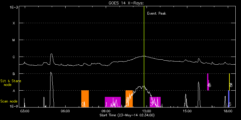 EIS Observation timeline overlay to GOES-Xray curve Code 1" 2" 40" 266" EIS Observations list for this event: STUDY ACRONYM ID DATE OBSERVED DESCRIPTION NOAA# TARGET 0 Atlas_30 | 40724 | 2014/05/23 07:10:33 | Active region 12071. Atlas. | 2071 | Quiet Sun TIMELINE ID DATE OBSERVED FITS FILE XCEN (+W/-E) YCEN (+N/-S) DUR ----------------------------------------------------------------------------------------------------------------- 40724 | 2014/05/23 07:10:33.000 | eis_l0_20140523_071033.fits.gz | -510.66 | -207.48 | 31m39s 1 prom_rast_v1 | 40716 | 2014/05/23 08:55:27 | HOP 255. Prominence, NW limb. | | Eruptive Filame TIMELINE ID DATE OBSERVED FITS FILE XCEN (+W/-E) YCEN (+N/-S) DUR ----------------------------------------------------------------------------------------------------------------- 40716 | 2014/05/23 08:55:27.000 | eis_l0_20140523_085527.fits.gz | 838.99 | 482.48 | 1h9m44s 2 madj_qs | 40717 | 2014/05/23 10:27:27 | HOP 255. Prominence, NW limb. | | Quiet Sun TIMELINE ID DATE OBSERVED FITS FILE XCEN (+W/-E) YCEN (+N/-S) DUR ----------------------------------------------------------------------------------------------------------------- 40717 | 2014/05/23 10:27:27.000 | eis_l0_20140523_102727.fits.gz | 838.43 | 482.48 | 30m7s 3 HPW021_VEL_120x512v2 | 40715 | 2014/05/23 12:14:27 | Active region 12071. Raster scan. | 2071 | Active Region TIMELINE ID DATE OBSERVED FITS FILE XCEN (+W/-E) YCEN (+N/-S) DUR ----------------------------------------------------------------------------------------------------------------- 40715 | 2014/05/23 12:14:27.000 | eis_l0_20140523_121427.fits.gz | -476.83 | -272.02 | 46m52s 4 regcal071 | 40710 | 2014/05/23 16:29:11 | Dark exposures, CCD bottom rows (100s | | Engineering TIMELINE ID DATE OBSERVED FITS FILE XCEN (+W/-E) YCEN (+N/-S) DUR ----------------------------------------------------------------------------------------------------------------- 40710 | 2014/05/23 16:29:11.000 | eis_l0_20140523_162911.fits.gz | 895.52 | -187.47 | 3m22s 5 regcal072 | 40711 | 2014/05/23 16:33:00 | Dark exposures, top CCD rows (100s exp | | Engineering TIMELINE ID DATE OBSERVED FITS FILE XCEN (+W/-E) YCEN (+N/-S) DUR ----------------------------------------------------------------------------------------------------------------- 40711 | 2014/05/23 16:33:00.000 | eis_l0_20140523_163300.fits.gz | 895.44 | 323.61 | 3m22s 6 PRY_slot_contextLITE | 40712 | 2014/05/23 18:02:33 | EIS-AIA alignment | | Active Region TIMELINE ID DATE OBSERVED FITS FILE XCEN (+W/-E) YCEN (+N/-S) DUR ----------------------------------------------------------------------------------------------------------------- 40712 | 2014/05/23 18:02:33.000 | eis_l0_20140523_180233.fits.gz | -15.21 | -0.42 | 2m56s 7 Alignment_266 | 40713 | 2014/05/23 18:05:48 | EIS-AIA alignment | | Quiet Sun TIMELINE ID DATE OBSERVED FITS FILE XCEN (+W/-E) YCEN (+N/-S) DUR ----------------------------------------------------------------------------------------------------------------- 40713 | 2014/05/23 18:05:48.000 | eis_l0_20140523_180548.fits.gz | -132.41 | -0.42 | 1m22s 8 XRT_synop_AIA | 40714 | 2014/05/23 18:07:55 | EIS-AIA alignment | | Quiet Sun TIMELINE ID DATE OBSERVED FITS FILE XCEN (+W/-E) YCEN (+N/-S) DUR ----------------------------------------------------------------------------------------------------------------- 40714 | 2014/05/23 18:07:55.000 | eis_l0_20140523_180755.fits.gz | -132.49 | -0.42 | 10s : Check study information : Download file : View thumbnails For this event, also check for:
