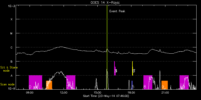 EIS Observation timeline overlay to GOES-Xray curve Code 1" 2" 40" 266" EIS Observations list for this event: STUDY ACRONYM ID DATE OBSERVED DESCRIPTION NOAA# TARGET 0 prom_rast_v1 | 40716 | 2014/05/23 08:55:27 | HOP 255. Prominence, NW limb. | | Eruptive Filame TIMELINE ID DATE OBSERVED FITS FILE XCEN (+W/-E) YCEN (+N/-S) DUR ----------------------------------------------------------------------------------------------------------------- 40716 | 2014/05/23 08:55:27.000 | eis_l0_20140523_085527.fits.gz | 838.99 | 482.48 | 1h9m44s 1 madj_qs | 40717 | 2014/05/23 10:27:27 | HOP 255. Prominence, NW limb. | | Quiet Sun TIMELINE ID DATE OBSERVED FITS FILE XCEN (+W/-E) YCEN (+N/-S) DUR ----------------------------------------------------------------------------------------------------------------- 40717 | 2014/05/23 10:27:27.000 | eis_l0_20140523_102727.fits.gz | 838.43 | 482.48 | 30m7s 2 HPW021_VEL_120x512v2 | 40715 | 2014/05/23 12:14:27 | Active region 12071. Raster scan. | 2071 | Active Region TIMELINE ID DATE OBSERVED FITS FILE XCEN (+W/-E) YCEN (+N/-S) DUR ----------------------------------------------------------------------------------------------------------------- 40715 | 2014/05/23 12:14:27.000 | eis_l0_20140523_121427.fits.gz | -476.83 | -272.02 | 46m52s 3 regcal071 | 40710 | 2014/05/23 16:29:11 | Dark exposures, CCD bottom rows (100s | | Engineering TIMELINE ID DATE OBSERVED FITS FILE XCEN (+W/-E) YCEN (+N/-S) DUR ----------------------------------------------------------------------------------------------------------------- 40710 | 2014/05/23 16:29:11.000 | eis_l0_20140523_162911.fits.gz | 895.52 | -187.47 | 3m22s 4 regcal072 | 40711 | 2014/05/23 16:33:00 | Dark exposures, top CCD rows (100s exp | | Engineering TIMELINE ID DATE OBSERVED FITS FILE XCEN (+W/-E) YCEN (+N/-S) DUR ----------------------------------------------------------------------------------------------------------------- 40711 | 2014/05/23 16:33:00.000 | eis_l0_20140523_163300.fits.gz | 895.44 | 323.61 | 3m22s 5 PRY_slot_contextLITE | 40712 | 2014/05/23 18:02:33 | EIS-AIA alignment | | Active Region TIMELINE ID DATE OBSERVED FITS FILE XCEN (+W/-E) YCEN (+N/-S) DUR ----------------------------------------------------------------------------------------------------------------- 40712 | 2014/05/23 18:02:33.000 | eis_l0_20140523_180233.fits.gz | -15.21 | -0.42 | 2m56s 6 Alignment_266 | 40713 | 2014/05/23 18:05:48 | EIS-AIA alignment | | Quiet Sun TIMELINE ID DATE OBSERVED FITS FILE XCEN (+W/-E) YCEN (+N/-S) DUR ----------------------------------------------------------------------------------------------------------------- 40713 | 2014/05/23 18:05:48.000 | eis_l0_20140523_180548.fits.gz | -132.41 | -0.42 | 1m22s 7 XRT_synop_AIA | 40714 | 2014/05/23 18:07:55 | EIS-AIA alignment | | Quiet Sun TIMELINE ID DATE OBSERVED FITS FILE XCEN (+W/-E) YCEN (+N/-S) DUR ----------------------------------------------------------------------------------------------------------------- 40714 | 2014/05/23 18:07:55.000 | eis_l0_20140523_180755.fits.gz | -132.49 | -0.42 | 10s 8 HPW021_VEL_120x512v2 | 40726 | 2014/05/23 19:04:33 | Active region 12071. Raster scan. | | Active Region TIMELINE ID DATE OBSERVED FITS FILE XCEN (+W/-E) YCEN (+N/-S) DUR ----------------------------------------------------------------------------------------------------------------- 40726 | 2014/05/23 19:04:33.000 | eis_l0_20140523_190433.fits.gz | -426.39 | -271.48 | 46m53s 9 Atlas_30 | 40727 | 2014/05/23 20:41:26 | Active region 12071. Atlas. | | Quiet Sun TIMELINE ID DATE OBSERVED FITS FILE XCEN (+W/-E) YCEN (+N/-S) DUR ----------------------------------------------------------------------------------------------------------------- 40727 | 2014/05/23 20:41:26.000 | eis_l0_20140523_204126.fits.gz | -412.25 | -206.48 | 31m40s 10 HPW021_VEL_120x512v2 | 40730 | 2014/05/23 22:17:26 | Active region 12071. Raster scan. | | Active Region TIMELINE ID DATE OBSERVED FITS FILE XCEN (+W/-E) YCEN (+N/-S) DUR ----------------------------------------------------------------------------------------------------------------- 40730 | 2014/05/23 22:17:26.000 | eis_l0_20140523_221726.fits.gz | -402.05 | -271.24 | 46m53s : Check study information : Download file : View thumbnails For this event, also check for: