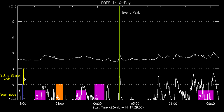 EIS Observation timeline overlay to GOES-Xray curve Code 1" 2" 40" 266" EIS Observations list for this event: STUDY ACRONYM ID DATE OBSERVED DESCRIPTION NOAA# TARGET 0 PRY_slot_contextLITE | 40712 | 2014/05/23 18:02:33 | EIS-AIA alignment | | Active Region TIMELINE ID DATE OBSERVED FITS FILE XCEN (+W/-E) YCEN (+N/-S) DUR ----------------------------------------------------------------------------------------------------------------- 40712 | 2014/05/23 18:02:33.000 | eis_l0_20140523_180233.fits.gz | -15.21 | -0.42 | 2m56s 1 Alignment_266 | 40713 | 2014/05/23 18:05:48 | EIS-AIA alignment | | Quiet Sun TIMELINE ID DATE OBSERVED FITS FILE XCEN (+W/-E) YCEN (+N/-S) DUR ----------------------------------------------------------------------------------------------------------------- 40713 | 2014/05/23 18:05:48.000 | eis_l0_20140523_180548.fits.gz | -132.41 | -0.42 | 1m22s 2 XRT_synop_AIA | 40714 | 2014/05/23 18:07:55 | EIS-AIA alignment | | Quiet Sun TIMELINE ID DATE OBSERVED FITS FILE XCEN (+W/-E) YCEN (+N/-S) DUR ----------------------------------------------------------------------------------------------------------------- 40714 | 2014/05/23 18:07:55.000 | eis_l0_20140523_180755.fits.gz | -132.49 | -0.42 | 10s 3 HPW021_VEL_120x512v2 | 40726 | 2014/05/23 19:04:33 | Active region 12071. Raster scan. | | Active Region TIMELINE ID DATE OBSERVED FITS FILE XCEN (+W/-E) YCEN (+N/-S) DUR ----------------------------------------------------------------------------------------------------------------- 40726 | 2014/05/23 19:04:33.000 | eis_l0_20140523_190433.fits.gz | -426.39 | -271.48 | 46m53s 4 Atlas_30 | 40727 | 2014/05/23 20:41:26 | Active region 12071. Atlas. | | Quiet Sun TIMELINE ID DATE OBSERVED FITS FILE XCEN (+W/-E) YCEN (+N/-S) DUR ----------------------------------------------------------------------------------------------------------------- 40727 | 2014/05/23 20:41:26.000 | eis_l0_20140523_204126.fits.gz | -412.25 | -206.48 | 31m40s 5 HPW021_VEL_120x512v2 | 40730 | 2014/05/23 22:17:26 | Active region 12071. Raster scan. | | Active Region TIMELINE ID DATE OBSERVED FITS FILE XCEN (+W/-E) YCEN (+N/-S) DUR ----------------------------------------------------------------------------------------------------------------- 40730 | 2014/05/23 22:17:26.000 | eis_l0_20140523_221726.fits.gz | -402.05 | -271.24 | 46m53s 6 HPW021_VEL_120x512v2 | 40732 | 2014/05/23 23:45:41 | Active region 12071. Raster scan. | | Active Region TIMELINE ID DATE OBSERVED FITS FILE XCEN (+W/-E) YCEN (+N/-S) DUR ----------------------------------------------------------------------------------------------------------------- 40732 | 2014/05/23 23:45:41.000 | eis_l0_20140523_234541.fits.gz | -390.70 | -271.09 | 46m53s 7 prom_rast_v1 | 40721 | 2014/05/24 08:02:13 | HOP 255. Prominence, NW limb. | | Eruptive Filame TIMELINE ID DATE OBSERVED FITS FILE XCEN (+W/-E) YCEN (+N/-S) DUR ----------------------------------------------------------------------------------------------------------------- 40721 | 2014/05/24 08:02:13.000 | eis_l0_20140524_080213.fits.gz | 890.22 | 338.68 | 1h9m44s : Check study information : Download file : View thumbnails For this event, also check for: