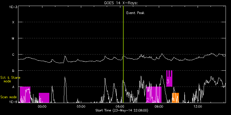 EIS Observation timeline overlay to GOES-Xray curve Code 1" 2" 40" 266" EIS Observations list for this event: STUDY ACRONYM ID DATE OBSERVED DESCRIPTION NOAA# TARGET 0 HPW021_VEL_120x512v2 | 40730 | 2014/05/23 22:17:26 | Active region 12071. Raster scan. | | Active Region TIMELINE ID DATE OBSERVED FITS FILE XCEN (+W/-E) YCEN (+N/-S) DUR ----------------------------------------------------------------------------------------------------------------- 40730 | 2014/05/23 22:17:26.000 | eis_l0_20140523_221726.fits.gz | -402.05 | -271.24 | 46m53s 1 HPW021_VEL_120x512v2 | 40732 | 2014/05/23 23:45:41 | Active region 12071. Raster scan. | | Active Region TIMELINE ID DATE OBSERVED FITS FILE XCEN (+W/-E) YCEN (+N/-S) DUR ----------------------------------------------------------------------------------------------------------------- 40732 | 2014/05/23 23:45:41.000 | eis_l0_20140523_234541.fits.gz | -390.70 | -271.09 | 46m53s 2 prom_rast_v1 | 40721 | 2014/05/24 08:02:13 | HOP 255. Prominence, NW limb. | | Eruptive Filame TIMELINE ID DATE OBSERVED FITS FILE XCEN (+W/-E) YCEN (+N/-S) DUR ----------------------------------------------------------------------------------------------------------------- 40721 | 2014/05/24 08:02:13.000 | eis_l0_20140524_080213.fits.gz | 890.22 | 338.68 | 1h9m44s 3 HPW023_FULLCCD_V2 | 40722 | 2014/05/24 09:34:13 | HOP 255. Prominence, NW limb. | | Quiet Sun TIMELINE ID DATE OBSERVED FITS FILE XCEN (+W/-E) YCEN (+N/-S) DUR ----------------------------------------------------------------------------------------------------------------- 40722 | 2014/05/24 09:34:13.000 | eis_l0_20140524_093413.fits.gz | 889.91 | 338.68 | 5m 40722 | 2014/05/24 09:39:40.000 | eis_l0_20140524_093940.fits.gz | 890.07 | 338.60 | 5m1s 40722 | 2014/05/24 09:45:08.000 | eis_l0_20140524_094508.fits.gz | 889.99 | 338.52 | 5m 40722 | 2014/05/24 09:50:35.000 | eis_l0_20140524_095035.fits.gz | 889.99 | 338.60 | 5m 40722 | 2014/05/24 09:56:02.000 | eis_l0_20140524_095602.fits.gz | 890.07 | 338.60 | 5m 4 madj_qs | 40723 | 2014/05/24 10:01:29 | HOP 255. Prominence, NW limb. | | Quiet Sun TIMELINE ID DATE OBSERVED FITS FILE XCEN (+W/-E) YCEN (+N/-S) DUR ----------------------------------------------------------------------------------------------------------------- 40723 | 2014/05/24 10:01:29.000 | eis_l0_20140524_100129.fits.gz | 889.51 | 338.60 | 30m8s : Check study information : Download file : View thumbnails For this event, also check for: