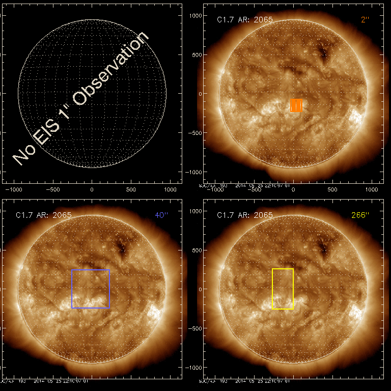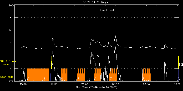 EIS Observation timeline overlay to GOES-Xray curve Code 1" 2" 40" 266" EIS Observations list for this event: STUDY ACRONYM ID DATE OBSERVED DESCRIPTION NOAA# TARGET 0 cam_ar_limb_lite_v2 | 40772 | 2014/05/25 15:23:13 | AR Temperature diagnostic | | Active Region TIMELINE ID DATE OBSERVED FITS FILE XCEN (+W/-E) YCEN (+N/-S) DUR ----------------------------------------------------------------------------------------------------------------- 40772 | 2014/05/25 15:23:13.000 | eis_l0_20140525_152313.fits.gz | -9869.70 | -9963.20 | 2h6m 1 PRY_slot_contextLITE | 40747 | 2014/05/25 17:39:51 | PRY_slot_contextLITE | 2071 | Active Region TIMELINE ID DATE OBSERVED FITS FILE XCEN (+W/-E) YCEN (+N/-S) DUR ----------------------------------------------------------------------------------------------------------------- 40747 | 2014/05/25 17:39:51.000 | eis_l0_20140525_173951.fits.gz | -15.21 | -0.35 | 2m56s 2 Alignment_266 | 40748 | 2014/05/25 17:43:05 | Alignment_266 | 2071 | Quiet Sun TIMELINE ID DATE OBSERVED FITS FILE XCEN (+W/-E) YCEN (+N/-S) DUR ----------------------------------------------------------------------------------------------------------------- 40748 | 2014/05/25 17:43:05.000 | eis_l0_20140525_174305.fits.gz | -132.49 | -0.42 | 1m22s 3 XRT_synop_AIA | 40749 | 2014/05/25 17:45:12 | | 2071 | Quiet Sun TIMELINE ID DATE OBSERVED FITS FILE XCEN (+W/-E) YCEN (+N/-S) DUR ----------------------------------------------------------------------------------------------------------------- 40749 | 2014/05/25 17:45:12.000 | eis_l0_20140525_174512.fits.gz | -132.57 | -0.27 | 10s 4 HH_Flare+AR_180x152 | 40776 | 2014/05/25 18:39:49 | Flare study | | Flare TIMELINE ID DATE OBSERVED FITS FILE XCEN (+W/-E) YCEN (+N/-S) DUR ----------------------------------------------------------------------------------------------------------------- 40776 | 2014/05/25 18:39:49.000 | eis_l0_20140525_183949.fits.gz | -5.61 | -154.28 | 5m19s 40776 | 2014/05/25 18:45:11.000 | eis_l0_20140525_184511.fits.gz | -4.83 | -154.28 | 5m18s 40776 | 2014/05/25 18:50:32.000 | eis_l0_20140525_185032.fits.gz | -3.91 | -154.36 | 5m18s 40776 | 2014/05/25 18:55:52.000 | eis_l0_20140525_185552.fits.gz | -3.21 | -154.43 | 5m18s 40776 | 2014/05/25 19:01:13.000 | eis_l0_20140525_190113.fits.gz | -2.36 | -154.36 | 5m17s 40776 | 2014/05/25 19:06:32.000 | eis_l0_20140525_190632.fits.gz | -1.51 | -154.43 | 5m19s 40776 | 2014/05/25 19:11:53.000 | eis_l0_20140525_191153.fits.gz | -0.82 | -154.43 | 5m18s 5 HH_Flare+AR_180x152 | 40781 | 2014/05/25 20:16:43 | Flare study | | Flare TIMELINE ID DATE OBSERVED FITS FILE XCEN (+W/-E) YCEN (+N/-S) DUR ----------------------------------------------------------------------------------------------------------------- 40781 | 2014/05/25 20:16:43.000 | eis_l0_20140525_201643.fits.gz | 18.33 | -154.51 | 5m17s 40781 | 2014/05/25 20:22:03.000 | eis_l0_20140525_202203.fits.gz | 19.10 | -154.43 | 5m17s 40781 | 2014/05/25 20:27:23.000 | eis_l0_20140525_202723.fits.gz | 19.87 | -154.51 | 5m17s 40781 | 2014/05/25 20:32:43.000 | eis_l0_20140525_203243.fits.gz | 20.64 | -154.51 | 5m17s 40781 | 2014/05/25 20:38:03.000 | eis_l0_20140525_203803.fits.gz | 21.41 | -154.59 | 5m18s 40781 | 2014/05/25 20:43:24.000 | eis_l0_20140525_204324.fits.gz | 22.19 | -154.66 | 5m18s 40781 | 2014/05/25 20:48:45.000 | eis_l0_20140525_204845.fits.gz | 23.04 | -154.43 | 5m18s 40781 | 2014/05/25 20:54:05.000 | eis_l0_20140525_205405.fits.gz | 23.81 | -154.51 | 5m18s 6 HH_Flare+AR_180x152 | 40789 | 2014/05/25 21:53:13 | Flare study | | Flare TIMELINE ID DATE OBSERVED FITS FILE XCEN (+W/-E) YCEN (+N/-S) DUR ----------------------------------------------------------------------------------------------------------------- 40789 | 2014/05/25 21:53:13.000 | eis_l0_20140525_215313.fits.gz | 32.29 | -154.66 | 5m17s 40789 | 2014/05/25 21:58:33.000 | eis_l0_20140525_215833.fits.gz | 33.14 | -154.51 | 5m18s 40789 | 2014/05/25 22:03:54.000 | eis_l0_20140525_220354.fits.gz | 33.83 | -154.51 | 5m19s 40789 | 2014/05/25 22:09:15.000 | eis_l0_20140525_220915.fits.gz | 34.61 | -154.66 | 5m18s 40789 | 2014/05/25 22:14:36.000 | eis_l0_20140525_221436.fits.gz | 35.46 | -154.74 | 5m18s 40789 | 2014/05/25 22:19:57.000 | eis_l0_20140525_221957.fits.gz | 36.23 | -154.66 | 5m17s 40789 | 2014/05/25 22:25:17.000 | eis_l0_20140525_222517.fits.gz | 37.00 | -154.90 | 5m18s 40789 | 2014/05/25 22:30:37.000 | eis_l0_20140525_223037.fits.gz | 37.85 | -154.66 | 5m18s 7 HH_Flare+AR_180x152 | 40790 | 2014/05/25 23:24:43 | Flare study | | Flare TIMELINE ID DATE OBSERVED FITS FILE XCEN (+W/-E) YCEN (+N/-S) DUR ----------------------------------------------------------------------------------------------------------------- 40790 | 2014/05/25 23:24:43.000 | eis_l0_20140525_232443.fits.gz | 46.38 | -154.74 | 5m17s 40790 | 2014/05/25 23:30:03.000 | eis_l0_20140525_233003.fits.gz | 47.16 | -154.66 | 5m17s 40790 | 2014/05/25 23:35:23.000 | eis_l0_20140525_233523.fits.gz | 48.01 | -154.82 | 5m18s 40790 | 2014/05/25 23:40:44.000 | eis_l0_20140525_234044.fits.gz | 48.70 | -154.90 | 5m17s 40790 | 2014/05/25 23:46:04.000 | eis_l0_20140525_234604.fits.gz | 49.55 | -154.82 | 5m17s 40790 | 2014/05/25 23:51:24.000 | eis_l0_20140525_235124.fits.gz | 50.32 | -154.97 | 5m17s 40790 | 2014/05/25 23:56:44.000 | eis_l0_20140525_235644.fits.gz | 51.02 | -154.97 | 5m17s 40790 | 2014/05/26 00:02:04.000 | eis_l0_20140526_000204.fits.gz | 51.79 | -154.90 | 5m18s 8 HH_Flare+AR_180x152 | 40798 | 2014/05/26 02:35:13 | Flare study | 2071 | Flare TIMELINE ID DATE OBSERVED FITS FILE XCEN (+W/-E) YCEN (+N/-S) DUR ----------------------------------------------------------------------------------------------------------------- 40798 | 2014/05/26 02:35:13.000 | eis_l0_20140526_023513.fits.gz | 74.08 | -154.97 | 5m18s 40798 | 2014/05/26 02:40:34.000 | eis_l0_20140526_024034.fits.gz | 74.78 | -154.97 | 5m17s 40798 | 2014/05/26 02:45:54.000 | eis_l0_20140526_024554.fits.gz | 75.62 | -154.90 | 5m18s 40798 | 2014/05/26 02:51:1