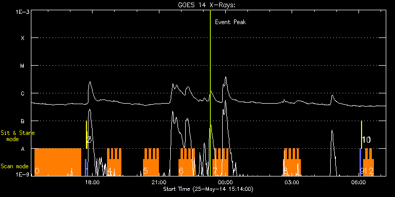 EIS Observation timeline overlay to GOES-Xray curve Code 1" 2" 40" 266" EIS Observations list for this event: STUDY ACRONYM ID DATE OBSERVED DESCRIPTION NOAA# TARGET 0 cam_ar_limb_lite_v2 | 40772 | 2014/05/25 15:23:13 | AR Temperature diagnostic | | Active Region TIMELINE ID DATE OBSERVED FITS FILE XCEN (+W/-E) YCEN (+N/-S) DUR ----------------------------------------------------------------------------------------------------------------- 40772 | 2014/05/25 15:23:13.000 | eis_l0_20140525_152313.fits.gz | -9869.70 | -9963.20 | 2h6m 1 PRY_slot_contextLITE | 40747 | 2014/05/25 17:39:51 | PRY_slot_contextLITE | 2071 | Active Region TIMELINE ID DATE OBSERVED FITS FILE XCEN (+W/-E) YCEN (+N/-S) DUR ----------------------------------------------------------------------------------------------------------------- 40747 | 2014/05/25 17:39:51.000 | eis_l0_20140525_173951.fits.gz | -15.21 | -0.35 | 2m56s 2 Alignment_266 | 40748 | 2014/05/25 17:43:05 | Alignment_266 | 2071 | Quiet Sun TIMELINE ID DATE OBSERVED FITS FILE XCEN (+W/-E) YCEN (+N/-S) DUR ----------------------------------------------------------------------------------------------------------------- 40748 | 2014/05/25 17:43:05.000 | eis_l0_20140525_174305.fits.gz | -132.49 | -0.42 | 1m22s 3 XRT_synop_AIA | 40749 | 2014/05/25 17:45:12 | | 2071 | Quiet Sun TIMELINE ID DATE OBSERVED FITS FILE XCEN (+W/-E) YCEN (+N/-S) DUR ----------------------------------------------------------------------------------------------------------------- 40749 | 2014/05/25 17:45:12.000 | eis_l0_20140525_174512.fits.gz | -132.57 | -0.27 | 10s 4 HH_Flare+AR_180x152 | 40776 | 2014/05/25 18:39:49 | Flare study | | Flare TIMELINE ID DATE OBSERVED FITS FILE XCEN (+W/-E) YCEN (+N/-S) DUR ----------------------------------------------------------------------------------------------------------------- 40776 | 2014/05/25 18:39:49.000 | eis_l0_20140525_183949.fits.gz | -5.61 | -154.28 | 5m19s 40776 | 2014/05/25 18:45:11.000 | eis_l0_20140525_184511.fits.gz | -4.83 | -154.28 | 5m18s 40776 | 2014/05/25 18:50:32.000 | eis_l0_20140525_185032.fits.gz | -3.91 | -154.36 | 5m18s 40776 | 2014/05/25 18:55:52.000 | eis_l0_20140525_185552.fits.gz | -3.21 | -154.43 | 5m18s 40776 | 2014/05/25 19:01:13.000 | eis_l0_20140525_190113.fits.gz | -2.36 | -154.36 | 5m17s 40776 | 2014/05/25 19:06:32.000 | eis_l0_20140525_190632.fits.gz | -1.51 | -154.43 | 5m19s 40776 | 2014/05/25 19:11:53.000 | eis_l0_20140525_191153.fits.gz | -0.82 | -154.43 | 5m18s 5 HH_Flare+AR_180x152 | 40781 | 2014/05/25 20:16:43 | Flare study | | Flare TIMELINE ID DATE OBSERVED FITS FILE XCEN (+W/-E) YCEN (+N/-S) DUR ----------------------------------------------------------------------------------------------------------------- 40781 | 2014/05/25 20:16:43.000 | eis_l0_20140525_201643.fits.gz | 18.33 | -154.51 | 5m17s 40781 | 2014/05/25 20:22:03.000 | eis_l0_20140525_202203.fits.gz | 19.10 | -154.43 | 5m17s 40781 | 2014/05/25 20:27:23.000 | eis_l0_20140525_202723.fits.gz | 19.87 | -154.51 | 5m17s 40781 | 2014/05/25 20:32:43.000 | eis_l0_20140525_203243.fits.gz | 20.64 | -154.51 | 5m17s 40781 | 2014/05/25 20:38:03.000 | eis_l0_20140525_203803.fits.gz | 21.41 | -154.59 | 5m18s 40781 | 2014/05/25 20:43:24.000 | eis_l0_20140525_204324.fits.gz | 22.19 | -154.66 | 5m18s 40781 | 2014/05/25 20:48:45.000 | eis_l0_20140525_204845.fits.gz | 23.04 | -154.43 | 5m18s 40781 | 2014/05/25 20:54:05.000 | eis_l0_20140525_205405.fits.gz | 23.81 | -154.51 | 5m18s 6 HH_Flare+AR_180x152 | 40789 | 2014/05/25 21:53:13 | Flare study | | Flare TIMELINE ID DATE OBSERVED FITS FILE XCEN (+W/-E) YCEN (+N/-S) DUR ----------------------------------------------------------------------------------------------------------------- 40789 | 2014/05/25 21:53:13.000 | eis_l0_20140525_215313.fits.gz | 32.29 | -154.66 | 5m17s 40789 | 2014/05/25 21:58:33.000 | eis_l0_20140525_215833.fits.gz | 33.14 | -154.51 | 5m18s 40789 | 2014/05/25 22:03:54.000 | eis_l0_20140525_220354.fits.gz | 33.83 | -154.51 | 5m19s 40789 | 2014/05/25 22:09:15.000 | eis_l0_20140525_220915.fits.gz | 34.61 | -154.66 | 5m18s 40789 | 2014/05/25 22:14:36.000 | eis_l0_20140525_221436.fits.gz | 35.46 | -154.74 | 5m18s 40789 | 2014/05/25 22:19:57.000 | eis_l0_20140525_221957.fits.gz | 36.23 | -154.66 | 5m17s 40789 | 2014/05/25 22:25:17.000 | eis_l0_20140525_222517.fits.gz | 37.00 | -154.90 | 5m18s 40789 | 2014/05/25 22:30:37.000 | eis_l0_20140525_223037.fits.gz | 37.85 | -154.66 | 5m18s 7 HH_Flare+AR_180x152 | 40790 | 2014/05/25 23:24:43 | Flare study | | Flare TIMELINE ID DATE OBSERVED FITS FILE XCEN (+W/-E) YCEN (+N/-S) DUR ----------------------------------------------------------------------------------------------------------------- 40790 | 2014/05/25 23:24:43.000 | eis_l0_20140525_232443.fits.gz | 46.38 | -154.74 | 5m17s 40790 | 2014/05/25 23:30:03.000 | eis_l0_20140525_233003.fits.gz | 47.16 | -154.66 | 5m17s 40790 | 2014/05/25 23:35:23.000 | eis_l0_20140525_233523.fits.gz | 48.01 | -154.82 | 5m18s 40790 | 2014/05/25 23:40:44.000 | eis_l0_20140525_234044.fits.gz | 48.70 | -154.90 | 5m17s 40790 | 2014/05/25 23:46:04.000 | eis_l0_20140525_234604.fits.gz | 49.55 | -154.82 | 5m17s 40790 | 2014/05/25 23:51:24.000 | eis_l0_20140525_235124.fits.gz | 50.32 | -154.97 | 5m17s 40790 | 2014/05/25 23:56:44.000 | eis_l0_20140525_235644.fits.gz | 51.02 | -154.97 | 5m17s 40790 | 2014/05/26 00:02:04.000 | eis_l0_20140526_000204.fits.gz | 51.79 | -154.90 | 5m18s 8 HH_Flare+AR_180x152 | 40798 | 2014/05/26 02:35:13 | Flare study | 2071 | Flare TIMELINE ID DATE OBSERVED FITS FILE XCEN (+W/-E) YCEN (+N/-S) DUR ----------------------------------------------------------------------------------------------------------------- 40798 | 2014/05/26 02:35:13.000 | eis_l0_20140526_023513.fits.gz | 74.08 | -154.97 | 5m18s 40798 | 2014/05/26 02:40:34.000 | eis_l0_20140526_024034.fits.gz | 74.78 | -154.97 | 5m17s 40798 | 2014/05/26 02:45:54.000 | eis_l0_20140526_024554.fits.gz | 75.62 | -154.90 | 5m18s 40798 | 2014/05/26 02:51:1