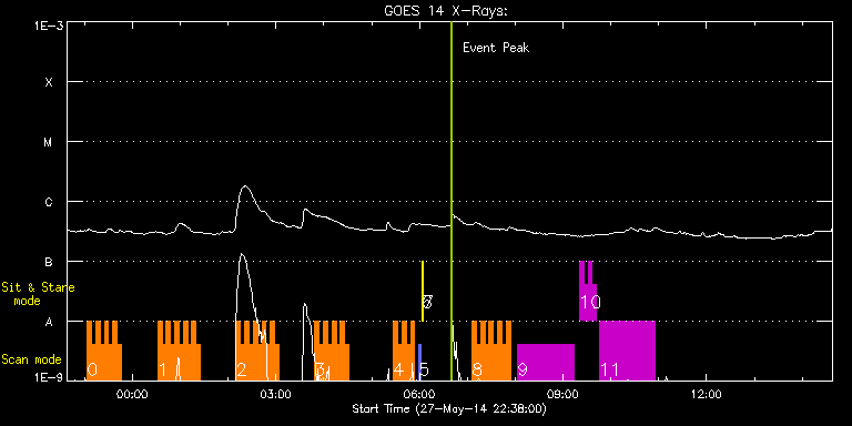 EIS Observation timeline overlay to GOES-Xray curve Code 1" 2" 40" 266" EIS Observations list for this event: STUDY ACRONYM ID DATE OBSERVED DESCRIPTION NOAA# TARGET 0 HH_Flare+AR_180x152 | 40817 | 2014/05/27 23:03:14 | Flare study | | Flare TIMELINE ID DATE OBSERVED FITS FILE XCEN (+W/-E) YCEN (+N/-S) DUR ----------------------------------------------------------------------------------------------------------------- 40817 | 2014/05/27 23:03:14.000 | eis_l0_20140527_230314.fits.gz | 169.63 | -199.42 | 5m18s 40817 | 2014/05/27 23:08:35.000 | eis_l0_20140527_230835.fits.gz | 170.41 | -199.50 | 5m19s 40817 | 2014/05/27 23:13:56.000 | eis_l0_20140527_231356.fits.gz | 171.18 | -199.66 | 5m18s 40817 | 2014/05/27 23:19:17.000 | eis_l0_20140527_231917.fits.gz | 172.03 | -199.58 | 5m18s 40817 | 2014/05/27 23:24:38.000 | eis_l0_20140527_232438.fits.gz | 172.80 | -199.73 | 5m18s 40817 | 2014/05/27 23:29:59.000 | eis_l0_20140527_232959.fits.gz | 173.57 | -199.81 | 5m18s 40817 | 2014/05/27 23:35:20.000 | eis_l0_20140527_233520.fits.gz | 174.27 | -199.66 | 5m18s 40817 | 2014/05/27 23:40:41.000 | eis_l0_20140527_234041.fits.gz | 175.04 | -199.58 | 5m17s 1 HH_Flare+AR_180x152 | 40822 | 2014/05/28 00:31:44 | Flare study | 2073 | Flare TIMELINE ID DATE OBSERVED FITS FILE XCEN (+W/-E) YCEN (+N/-S) DUR ----------------------------------------------------------------------------------------------------------------- 40822 | 2014/05/28 00:31:44.000 | eis_l0_20140528_003144.fits.gz | 181.54 | -200.66 | 5m18s 40822 | 2014/05/28 00:37:05.000 | eis_l0_20140528_003705.fits.gz | 182.15 | -200.73 | 5m17s 40822 | 2014/05/28 00:42:25.000 | eis_l0_20140528_004225.fits.gz | 183.01 | -200.73 | 5m18s 40822 | 2014/05/28 00:47:46.000 | eis_l0_20140528_004746.fits.gz | 183.85 | -200.73 | 5m17s 40822 | 2014/05/28 00:53:06.000 | eis_l0_20140528_005306.fits.gz | 184.55 | -200.73 | 5m18s 40822 | 2014/05/28 00:58:27.000 | eis_l0_20140528_005827.fits.gz | 185.32 | -200.73 | 5m18s 40822 | 2014/05/28 01:03:48.000 | eis_l0_20140528_010348.fits.gz | 186.09 | -200.73 | 5m18s 40822 | 2014/05/28 01:09:09.000 | eis_l0_20140528_010909.fits.gz | 186.94 | -200.81 | 5m17s 40822 | 2014/05/28 01:14:29.000 | eis_l0_20140528_011429.fits.gz | 187.64 | -200.81 | 5m18s 40822 | 2014/05/28 01:19:50.000 | eis_l0_20140528_011950.fits.gz | 188.41 | -200.89 | 5m18s 2 HH_Flare+AR_180x152 | 40823 | 2014/05/28 02:10:14 | Flare study | 2073 | Flare TIMELINE ID DATE OBSERVED FITS FILE XCEN (+W/-E) YCEN (+N/-S) DUR ----------------------------------------------------------------------------------------------------------------- 40823 | 2014/05/28 02:10:14.000 | eis_l0_20140528_021014.fits.gz | 196.50 | -201.73 | 5m18s 40823 | 2014/05/28 02:15:35.000 | eis_l0_20140528_021535.fits.gz | 197.27 | -201.81 | 5m17s 40823 | 2014/05/28 02:20:55.000 | eis_l0_20140528_022055.fits.gz | 198.12 | -201.89 | 5m18s 40823 | 2014/05/28 02:26:16.000 | eis_l0_20140528_022616.fits.gz | 198.82 | -201.81 | 5m18s 40823 | 2014/05/28 02:31:37.000 | eis_l0_20140528_023137.fits.gz | 199.59 | -201.81 | 5m17s 40823 | 2014/05/28 02:36:57.000 | eis_l0_20140528_023657.fits.gz | 200.44 | -201.96 | 5m17s 40823 | 2014/05/28 02:42:17.000 | eis_l0_20140528_024217.fits.gz | 201.13 | -202.04 | 5m17s 40823 | 2014/05/28 02:47:37.000 | eis_l0_20140528_024737.fits.gz | 201.98 | -202.04 | 5m17s 40823 | 2014/05/28 02:52:57.000 | eis_l0_20140528_025257.fits.gz | 202.60 | -202.04 | 5m18s 40823 | 2014/05/28 02:58:18.000 | eis_l0_20140528_025818.fits.gz | 203.45 | -202.12 | 5m19s 3 HH_Flare+AR_180x152 | 40824 | 2014/05/28 03:48:44 | Flare study | 2073 | Flare TIMELINE ID DATE OBSERVED FITS FILE XCEN (+W/-E) YCEN (+N/-S) DUR ----------------------------------------------------------------------------------------------------------------- 40824 | 2014/05/28 03:48:44.000 | eis_l0_20140528_034844.fits.gz | 211.54 | -202.04 | 5m18s 40824 | 2014/05/28 03:54:05.000 | eis_l0_20140528_035405.fits.gz | 212.31 | -202.12 | 5m18s 40824 | 2014/05/28 03:59:26.000 | eis_l0_20140528_035926.fits.gz | 213.01 | -202.04 | 5m18s 40824 | 2014/05/28 04:04:47.000 | eis_l0_20140528_040447.fits.gz | 213.86 | -202.12 | 5m18s 40824 | 2014/05/28 04:10:07.000 | eis_l0_20140528_041007.fits.gz | 214.63 | -202.12 | 5m19s 40824 | 2014/05/28 04:15:29.000 | eis_l0_20140528_041529.fits.gz | 215.32 | -202.12 | 5m17s 40824 | 2014/05/28 04:20:49.000 | eis_l0_20140528_042049.fits.gz | 216.17 | -202.12 | 5m17s 40824 | 2014/05/28 04:26:09.000 | eis_l0_20140528_042609.fits.gz | 216.87 | -202.20 | 5m18s 4 HH_Flare+AR_180x152 | 40832 | 2014/05/28 05:27:14 | Flare study | 2073 | Flare TIMELINE ID DATE OBSERVED FITS FILE XCEN (+W/-E) YCEN (+N/-S) DUR ----------------------------------------------------------------------------------------------------------------- 40832 | 2014/05/28 05:27:14.000 | eis_l0_20140528_052714.fits.gz | 226.67 | -201.12 | 5m18s 40832 | 2014/05/28 05:32:35.000 | eis_l0_20140528_053235.fits.gz | 227.45 | -201.27 | 5m18s 40832 | 2014/05/28 05:37:55.000 | eis_l0_20140528_053755.fits.gz | 228.22 | -201.12 | 5m19s 40832 | 2014/05/28 05:43:17.000 | eis_l0_20140528_054317.fits.gz | 228.99 | -201.27 | 5m18s 40832 | 2014/05/28 05:48:38.000 | eis_l0_20140528_054838.fits.gz | 229.76 | -201.27 | 5m17s 5 PRY_slot_contextLITE | 40807 | 2014/05/28 05:59:21 | PRY_slot_contextLITE | | Active Region TIMELINE ID DATE OBSERVED FITS FILE XCEN (+W/-E) YCEN (+N/-S) DUR ----------------------------------------------------------------------------------------------------------------- 40807 | 2014/05/28 05:59:21.000 | eis_l0_20140528_055921.fits.gz | -15.29 | -0.58 | 2m56s 6 Alignment_266 | 40808 | 2014/05/28 06:02:36 | Alignment_266 | | Quiet Sun TIMELINE ID DATE OBSERVED FITS FILE XCEN (+W/-E) YCEN (+N/-S) DUR ----------------------------------------------------------------------------------------------------------------- 40808 | 2014/05/28 06:02:36.000 | eis_l0_20140528_060236.fits.gz | -132.57 | -0.42 | 1m22s 7 XRT_synop_AIA | 40809 | 2014/05/28 06:04:43 | XRT