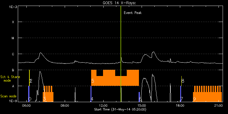 EIS Observation timeline overlay to GOES-Xray curve Code 1" 2" 40" 266" EIS Observations list for this event: STUDY ACRONYM ID DATE OBSERVED DESCRIPTION NOAA# TARGET 0 PRY_slot_contextLITE | 40852 | 2014/05/31 06:09:20 | synoptic | | Active Region TIMELINE ID DATE OBSERVED FITS FILE XCEN (+W/-E) YCEN (+N/-S) DUR ----------------------------------------------------------------------------------------------------------------- 40852 | 2014/05/31 06:09:20.000 | eis_l0_20140531_060920.fits.gz | -15.29 | -0.42 | 2m56s 1 Alignment_266 | 40853 | 2014/05/31 06:12:34 | synoptic | | Quiet Sun TIMELINE ID DATE OBSERVED FITS FILE XCEN (+W/-E) YCEN (+N/-S) DUR ----------------------------------------------------------------------------------------------------------------- 40853 | 2014/05/31 06:12:34.000 | eis_l0_20140531_061234.fits.gz | -132.57 | -0.35 | 1m22s 2 XRT_synop_AIA | 40854 | 2014/05/31 06:14:41 | synoptic | | Quiet Sun TIMELINE ID DATE OBSERVED FITS FILE XCEN (+W/-E) YCEN (+N/-S) DUR ----------------------------------------------------------------------------------------------------------------- 40854 | 2014/05/31 06:14:41.000 | eis_l0_20140531_061441.fits.gz | -132.57 | -0.27 | 10s 3 HH_Flare+AR_180x152 | 40861 | 2014/05/31 07:16:50 | AR tracking NOAA 12073 | 2073 | Flare TIMELINE ID DATE OBSERVED FITS FILE XCEN (+W/-E) YCEN (+N/-S) DUR ----------------------------------------------------------------------------------------------------------------- 40861 | 2014/05/31 07:16:50.000 | eis_l0_20140531_071650.fits.gz | 762.85 | -214.83 | 5m17s 40861 | 2014/05/31 07:22:31.000 | eis_l0_20140531_072231.fits.gz | 763.39 | -214.90 | 4m57s 40861 | 2014/05/31 07:27:31.000 | eis_l0_20140531_072731.fits.gz | 763.78 | -215.06 | 5m18s 40861 | 2014/05/31 07:32:52.000 | eis_l0_20140531_073252.fits.gz | 764.17 | -215.06 | 5m18s 40861 | 2014/05/31 07:38:13.000 | eis_l0_20140531_073813.fits.gz | 764.63 | -214.98 | 5m18s 40861 | 2014/05/31 07:43:34.000 | eis_l0_20140531_074334.fits.gz | 765.09 | -214.98 | 5m18s 40861 | 2014/05/31 07:48:55.000 | eis_l0_20140531_074855.fits.gz | 765.48 | -215.13 | 5m17s 40861 | 2014/05/31 07:54:15.000 | eis_l0_20140531_075415.fits.gz | 765.94 | -214.90 | 5m17s 40861 | 2014/05/31 07:59:35.000 | eis_l0_20140531_075935.fits.gz | 766.41 | -215.13 | 5m19s 4 PRY_slot_context_v3 | 40932 | 2014/05/31 11:00:21 | HOP241 | 2073 | Active Region TIMELINE ID DATE OBSERVED FITS FILE XCEN (+W/-E) YCEN (+N/-S) DUR ----------------------------------------------------------------------------------------------------------------- 40932 | 2014/05/31 11:00:21.000 | eis_l0_20140531_110021.fits.gz | 756.80 | -243.60 | 2m56s 5 FLAREDOP_EIS | 40933 | 2014/05/31 11:03:42 | HOP241 | | Flare TIMELINE ID DATE OBSERVED FITS FILE XCEN (+W/-E) YCEN (+N/-S) DUR ----------------------------------------------------------------------------------------------------------------- 40933 | 2014/05/31 11:03:42.000 | eis_l0_20140531_110342.fits.gz | 288.64 | -245.85 | 23m2s 40933 | 2014/05/31 11:18:46.000 | eis_l0_20140531_111846.fits.gz | 290.80 | -245.85 | 40m40s 40933 | 2014/05/31 11:59:28.000 | eis_l0_20140531_115928.fits.gz | 296.59 | -245.69 | 55m46s 40933 | 2014/05/31 12:55:16.000 | eis_l0_20140531_125516.fits.gz | 304.40 | -246.00 | 55m43s 40933 | 2014/05/31 13:51:01.000 | eis_l0_20140531_135101.fits.gz | 312.20 | -246.00 | 55m42s 6 PRY_slot_context_v3 | 40934 | 2014/05/31 14:46:54 | HOP241 | 2075 | Active Region TIMELINE ID DATE OBSERVED FITS FILE XCEN (+W/-E) YCEN (+N/-S) DUR ----------------------------------------------------------------------------------------------------------------- 40934 | 2014/05/31 14:46:54.000 | eis_l0_20140531_144654.fits.gz | 311.66 | -211.23 | 2m56s 7 PRY_slot_contextLITE | 40878 | 2014/05/31 18:00:45 | PRY_slot_contextLITE | | Active Region TIMELINE ID DATE OBSERVED FITS FILE XCEN (+W/-E) YCEN (+N/-S) DUR ----------------------------------------------------------------------------------------------------------------- 40878 | 2014/05/31 18:00:45.000 | eis_l0_20140531_180045.fits.gz | -15.29 | -0.50 | 2m56s 8 XRT_synop_AIA | 40883 | 2014/05/31 18:06:06 | XRT_synop_AIA | | Quiet Sun TIMELINE ID DATE OBSERVED FITS FILE XCEN (+W/-E) YCEN (+N/-S) DUR ----------------------------------------------------------------------------------------------------------------- 40883 | 2014/05/31 18:06:06.000 | eis_l0_20140531_180606.fits.gz | -132.57 | -0.35 | 11s 9 HH_Flare+AR_180x152 | 40935 | 2014/05/31 19:01:20 | Flare study | | Flare TIMELINE ID DATE OBSERVED FITS FILE XCEN (+W/-E) YCEN (+N/-S) DUR ----------------------------------------------------------------------------------------------------------------- 40935 | 2014/05/31 19:01:20.000 | eis_l0_20140531_190120.fits.gz | 345.49 | -155.70 | 5m18s 40935 | 2014/05/31 19:06:41.000 | eis_l0_20140531_190641.fits.gz | 346.34 | -155.70 | 5m18s 40935 | 2014/05/31 19:12:02.000 | eis_l0_20140531_191202.fits.gz | 347.11 | -155.77 | 5m18s 40935 | 2014/05/31 19:17:22.000 | eis_l0_20140531_191722.fits.gz | 347.81 | -155.85 | 5m19s 40935 | 2014/05/31 19:22:44.000 | eis_l0_20140531_192244.fits.gz | 348.51 | -155.85 | 5m18s 40935 | 2014/05/31 19:28:05.000 | eis_l0_20140531_192805.fits.gz | 349.28 | -155.70 | 5m18s 40935 | 2014/05/31 19:33:26.000 | eis_l0_20140531_193326.fits.gz | 349.97 | -155.93 | 5m18s 40935 | 2014/05/31 19:38:47.000 | eis_l0_20140531_193847.fits.gz | 350.74 | -155.85 | 5m18s 40935 | 2014/05/31 19:44:08.000 | eis_l0_20140531_194408.fits.gz | 351.52 | -155.85 | 5m17s 40935 | 2014/05/31 19:49:28.000 | eis_l0_20140531_194928.fits.gz | 352.21 | -155.93 | 5m17s 40935 | 2014/05/31 19:54:48.000 | eis_l0_20140531_195448.fits.gz | 352.98 | -155.93 | 5m17s 40935 | 2014/05/31 20:00:08.000 | eis_l0_20140531_200008.fits.gz | 353.60 | -155.85 | 5m18s 40935 | 2014/05/31 20:05:29.000 | eis_l0_20140531_200529.fits.gz | 354.30 | -155.77 | 5m18s 40935 | 2014/05/31 20:10:49.000 | eis_l0_20140531_201049.fits.gz | 355.07 | -155.85 | 5m18s 40935 | 2014/05/31 20:16:10