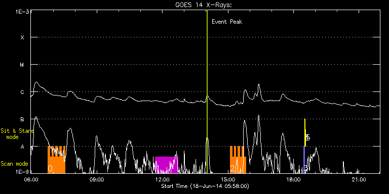 EIS Observation timeline overlay to GOES-Xray curve Code 1" 2" 40" 266" EIS Observations list for this event: STUDY ACRONYM ID DATE OBSERVED DESCRIPTION NOAA# TARGET 0 HH_Flare+AR_180x152H | 41169 | 2014/06/18 06:45:13 | Flare watch AR 12087 | 2087 | Flare TIMELINE ID DATE OBSERVED FITS FILE XCEN (+W/-E) YCEN (+N/-S) DUR ----------------------------------------------------------------------------------------------------------------- 41169 | 2014/06/18 06:45:13.000 | eis_l0_20140618_064513.fits.gz | 365.13 | -295.73 | 5m18s 41169 | 2014/06/18 06:50:34.000 | eis_l0_20140618_065034.fits.gz | 365.83 | -295.65 | 5m17s 41169 | 2014/06/18 06:55:54.000 | eis_l0_20140618_065554.fits.gz | 366.52 | -295.80 | 5m18s 41169 | 2014/06/18 07:01:15.000 | eis_l0_20140618_070115.fits.gz | 367.22 | -295.88 | 5m19s 41169 | 2014/06/18 07:06:36.000 | eis_l0_20140618_070636.fits.gz | 367.91 | -295.96 | 5m18s 41169 | 2014/06/18 07:11:57.000 | eis_l0_20140618_071157.fits.gz | 368.53 | -295.88 | 5m18s 41169 | 2014/06/18 07:17:17.000 | eis_l0_20140618_071717.fits.gz | 369.22 | -295.96 | 5m18s 41169 | 2014/06/18 07:22:38.000 | eis_l0_20140618_072238.fits.gz | 369.92 | -295.80 | 5m17s 41169 | 2014/06/18 07:27:58.000 | eis_l0_20140618_072758.fits.gz | 370.61 | -295.88 | 5m18s 1 HPW021_VEL_120x512v1 | 41189 | 2014/06/18 11:40:56 | Active Region Studies | | Active Region TIMELINE ID DATE OBSERVED FITS FILE XCEN (+W/-E) YCEN (+N/-S) DUR ----------------------------------------------------------------------------------------------------------------- 41189 | 2014/06/18 11:40:56.000 | eis_l0_20140618_114056.fits.gz | 404.58 | -295.57 | 1h1m54s 2 HH_Flare+AR_180x152H | 41177 | 2014/06/18 15:05:56 | Flare watch AR 12087 | | Flare TIMELINE ID DATE OBSERVED FITS FILE XCEN (+W/-E) YCEN (+N/-S) DUR ----------------------------------------------------------------------------------------------------------------- 41177 | 2014/06/18 15:05:56.000 | eis_l0_20140618_150556.fits.gz | 428.01 | -295.80 | 5m18s 41177 | 2014/06/18 15:11:17.000 | eis_l0_20140618_151117.fits.gz | 428.63 | -295.80 | 5m18s 41177 | 2014/06/18 15:16:38.000 | eis_l0_20140618_151638.fits.gz | 429.32 | -295.80 | 5m17s 41177 | 2014/06/18 15:21:58.000 | eis_l0_20140618_152158.fits.gz | 430.02 | -295.65 | 5m18s 41177 | 2014/06/18 15:27:18.000 | eis_l0_20140618_152718.fits.gz | 430.71 | -295.73 | 5m18s 41177 | 2014/06/18 15:32:38.000 | eis_l0_20140618_153238.fits.gz | 431.25 | -295.65 | 5m18s 41177 | 2014/06/18 15:37:59.000 | eis_l0_20140618_153759.fits.gz | 432.03 | -295.73 | 5m18s 41177 | 2014/06/18 15:43:20.000 | eis_l0_20140618_154320.fits.gz | 432.64 | -295.49 | 5m19s 3 PRY_slot_contextLITE | 41117 | 2014/06/18 18:27:20 | synoptic | | Active Region TIMELINE ID DATE OBSERVED FITS FILE XCEN (+W/-E) YCEN (+N/-S) DUR ----------------------------------------------------------------------------------------------------------------- 41117 | 2014/06/18 18:27:20.000 | eis_l0_20140618_182720.fits.gz | -15.29 | -0.42 | 2m56s 4 Alignment_266 | 41118 | 2014/06/18 18:30:35 | synoptic | | Quiet Sun TIMELINE ID DATE OBSERVED FITS FILE XCEN (+W/-E) YCEN (+N/-S) DUR ----------------------------------------------------------------------------------------------------------------- 41118 | 2014/06/18 18:30:35.000 | eis_l0_20140618_183035.fits.gz | -132.57 | -0.50 | 1m22s 5 XRT_synop_AIA | 41119 | 2014/06/18 18:32:42 | synoptic | | Quiet Sun TIMELINE ID DATE OBSERVED FITS FILE XCEN (+W/-E) YCEN (+N/-S) DUR ----------------------------------------------------------------------------------------------------------------- 41119 | 2014/06/18 18:32:42.000 | eis_l0_20140618_183242.fits.gz | -132.57 | -0.50 | 10s : Check study information : Download file : View thumbnails For this event, also check for:
