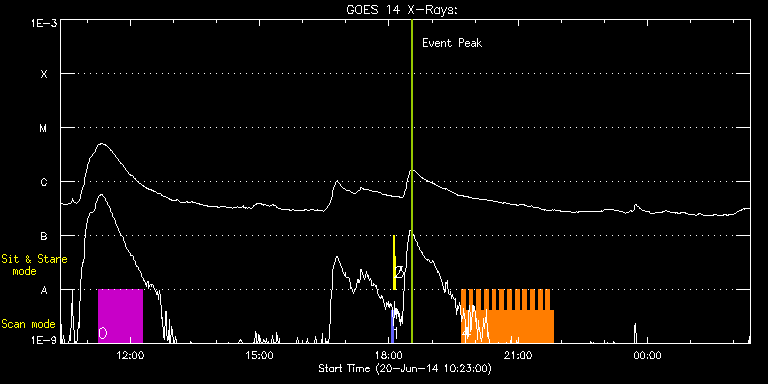 EIS Observation timeline overlay to GOES-Xray curve Code 1" 2" 40" 266" EIS Observations list for this event: STUDY ACRONYM ID DATE OBSERVED DESCRIPTION NOAA# TARGET 0 HPW021_VEL_120x512v1 | 41191 | 2014/06/20 11:15:25 | Active Region Studies | 2087 | Active Region TIMELINE ID DATE OBSERVED FITS FILE XCEN (+W/-E) YCEN (+N/-S) DUR ----------------------------------------------------------------------------------------------------------------- 41191 | 2014/06/20 11:15:25.000 | eis_l0_20140620_111525.fits.gz | 721.00 | -291.48 | 1h1m53s 1 PRY_slot_contextLITE | 41123 | 2014/06/20 18:03:33 | synoptic | | Active Region TIMELINE ID DATE OBSERVED FITS FILE XCEN (+W/-E) YCEN (+N/-S) DUR ----------------------------------------------------------------------------------------------------------------- 41123 | 2014/06/20 18:03:33.000 | eis_l0_20140620_180333.fits.gz | -15.29 | -0.42 | 2m56s 2 Alignment_266 | 41124 | 2014/06/20 18:06:47 | synoptic | | Quiet Sun TIMELINE ID DATE OBSERVED FITS FILE XCEN (+W/-E) YCEN (+N/-S) DUR ----------------------------------------------------------------------------------------------------------------- 41124 | 2014/06/20 18:06:47.000 | eis_l0_20140620_180647.fits.gz | -132.64 | -0.35 | 1m22s 3 XRT_synop_AIA | 41125 | 2014/06/20 18:08:55 | synoptic | | Quiet Sun TIMELINE ID DATE OBSERVED FITS FILE XCEN (+W/-E) YCEN (+N/-S) DUR ----------------------------------------------------------------------------------------------------------------- 41125 | 2014/06/20 18:08:55.000 | eis_l0_20140620_180855.fits.gz | -132.57 | -0.58 | 10s 4 HH_Flare+AR_180x152H | 41173 | 2014/06/20 19:40:48 | Flare watch AR 12087 | 2087 | Flare TIMELINE ID DATE OBSERVED FITS FILE XCEN (+W/-E) YCEN (+N/-S) DUR ----------------------------------------------------------------------------------------------------------------- 41173 | 2014/06/20 19:40:48.000 | eis_l0_20140620_194048.fits.gz | 760.19 | -290.40 | 5m18s 41173 | 2014/06/20 19:46:09.000 | eis_l0_20140620_194609.fits.gz | 760.66 | -290.24 | 5m18s 41173 | 2014/06/20 19:51:30.000 | eis_l0_20140620_195130.fits.gz | 761.04 | -290.32 | 5m18s 41173 | 2014/06/20 19:56:50.000 | eis_l0_20140620_195650.fits.gz | 761.43 | -290.24 | 5m18s 41173 | 2014/06/20 20:02:11.000 | eis_l0_20140620_200211.fits.gz | 761.89 | -290.24 | 5m17s 41173 | 2014/06/20 20:07:31.000 | eis_l0_20140620_200731.fits.gz | 762.28 | -290.17 | 5m18s 41173 | 2014/06/20 20:12:52.000 | eis_l0_20140620_201252.fits.gz | 762.59 | -290.09 | 5m18s 41173 | 2014/06/20 20:18:12.000 | eis_l0_20140620_201812.fits.gz | 763.13 | -290.24 | 5m19s 41173 | 2014/06/20 20:23:34.000 | eis_l0_20140620_202334.fits.gz | 763.52 | -290.09 | 5m17s 41173 | 2014/06/20 20:28:54.000 | eis_l0_20140620_202854.fits.gz | 763.82 | -290.32 | 5m17s 41173 | 2014/06/20 20:34:14.000 | eis_l0_20140620_203414.fits.gz | 764.29 | -290.09 | 5m18s 41173 | 2014/06/20 20:39:35.000 | eis_l0_20140620_203935.fits.gz | 764.67 | -290.09 | 5m19s 41173 | 2014/06/20 20:44:56.000 | eis_l0_20140620_204456.fits.gz | 765.14 | -289.93 | 5m19s 41173 | 2014/06/20 20:50:18.000 | eis_l0_20140620_205018.fits.gz | 765.52 | -290.01 | 5m17s 41173 | 2014/06/20 20:55:38.000 | eis_l0_20140620_205538.fits.gz | 765.91 | -289.86 | 5m18s 41173 | 2014/06/20 21:00:59.000 | eis_l0_20140620_210059.fits.gz | 766.37 | -289.78 | 5m17s 41173 | 2014/06/20 21:06:19.000 | eis_l0_20140620_210619.fits.gz | 766.76 | -289.93 | 5m18s 41173 | 2014/06/20 21:11:39.000 | eis_l0_20140620_211139.fits.gz | 767.15 | -290.01 | 5m18s 41173 | 2014/06/20 21:17:00.000 | eis_l0_20140620_211700.fits.gz | 767.53 | -290.09 | 5m19s 41173 | 2014/06/20 21:22:22.000 | eis_l0_20140620_212222.fits.gz | 767.92 | -289.93 | 5m17s 41173 | 2014/06/20 21:27:42.000 | eis_l0_20140620_212742.fits.gz | 768.38 | -290.01 | 5m18s 41173 | 2014/06/20 21:33:02.000 | eis_l0_20140620_213302.fits.gz | 768.69 | -290.09 | 5m18s 41173 | 2014/06/20 21:38:23.000 | eis_l0_20140620_213823.fits.gz | 769.15 | -290.09 | 5m19s 41173 | 2014/06/20 21:43:45.000 | eis_l0_20140620_214345.fits.gz | 769.46 | -289.93 | 5m18s : Check study information : Download file : View thumbnails For this event, also check for: