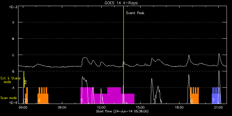 EIS Observation timeline overlay to GOES-Xray curve Code 1" 2" 40" 266" EIS Observations list for this event: STUDY ACRONYM ID DATE OBSERVED DESCRIPTION NOAA# TARGET 0 PRY_slot_contextLITE | 41219 | 2014/06/24 05:59:50 | PRY_slot_contextLITE | | Active Region TIMELINE ID DATE OBSERVED FITS FILE XCEN (+W/-E) YCEN (+N/-S) DUR ----------------------------------------------------------------------------------------------------------------- 41219 | 2014/06/24 05:59:50.000 | eis_l0_20140624_055950.fits.gz | -15.29 | -0.35 | 2m56s 1 Alignment_266 | 41220 | 2014/06/24 06:03:05 | Alignment_266 | | Quiet Sun TIMELINE ID DATE OBSERVED FITS FILE XCEN (+W/-E) YCEN (+N/-S) DUR ----------------------------------------------------------------------------------------------------------------- 41220 | 2014/06/24 06:03:05.000 | eis_l0_20140624_060305.fits.gz | -132.64 | -0.42 | 1m22s 2 XRT_synop_AIA | 41221 | 2014/06/24 06:05:39 | XRT_synop_AIA | | Quiet Sun TIMELINE ID DATE OBSERVED FITS FILE XCEN (+W/-E) YCEN (+N/-S) DUR ----------------------------------------------------------------------------------------------------------------- 41221 | 2014/06/24 06:05:39.000 | eis_l0_20140624_060539.fits.gz | -132.57 | -0.27 | 10s 3 HH_Flare+AR_180x152 | 41249 | 2014/06/24 06:09:51 | Flare study | 2093 | Flare TIMELINE ID DATE OBSERVED FITS FILE XCEN (+W/-E) YCEN (+N/-S) DUR ----------------------------------------------------------------------------------------------------------------- 41249 | 2014/06/24 06:09:51.000 | eis_l0_20140624_060951.fits.gz | 564.75 | -238.14 | 5m17s 41249 | 2014/06/24 06:15:11.000 | eis_l0_20140624_061511.fits.gz | 565.37 | -238.21 | 5m18s 4 HH_Flare+AR_180x152 | 41250 | 2014/06/24 07:07:41 | Flare study | 2093 | Flare TIMELINE ID DATE OBSERVED FITS FILE XCEN (+W/-E) YCEN (+N/-S) DUR ----------------------------------------------------------------------------------------------------------------- 41250 | 2014/06/24 07:07:41.000 | eis_l0_20140624_070741.fits.gz | 576.87 | -198.75 | 5m18s 41250 | 2014/06/24 07:13:02.000 | eis_l0_20140624_071302.fits.gz | 577.56 | -198.90 | 5m18s 41250 | 2014/06/24 07:18:22.000 | eis_l0_20140624_071822.fits.gz | 578.18 | -198.83 | 5m19s 41250 | 2014/06/24 07:23:44.000 | eis_l0_20140624_072344.fits.gz | 578.72 | -198.90 | 5m18s 41250 | 2014/06/24 07:29:05.000 | eis_l0_20140624_072905.fits.gz | 579.34 | -198.98 | 5m18s 41250 | 2014/06/24 07:34:26.000 | eis_l0_20140624_073426.fits.gz | 580.03 | -199.06 | 5m18s 41250 | 2014/06/24 07:39:46.000 | eis_l0_20140624_073946.fits.gz | 580.57 | -198.90 | 5m18s 41250 | 2014/06/24 07:45:07.000 | eis_l0_20140624_074507.fits.gz | 581.27 | -198.90 | 5m19s 41250 | 2014/06/24 07:50:28.000 | eis_l0_20140624_075028.fits.gz | 581.89 | -198.90 | 5m18s 5 HPW021_VEL_120x512v1 | 41251 | 2014/06/24 10:23:57 | Flare study | | Active Region TIMELINE ID DATE OBSERVED FITS FILE XCEN (+W/-E) YCEN (+N/-S) DUR ----------------------------------------------------------------------------------------------------------------- 41251 | 2014/06/24 10:23:57.000 | eis_l0_20140624_102357.fits.gz | 576.51 | -264.29 | 1h1m53s 41251 | 2014/06/24 11:25:57.000 | eis_l0_20140624_112557.fits.gz | 583.69 | -264.36 | 1h1m52s 41251 | 2014/06/24 12:27:55.000 | eis_l0_20140624_122755.fits.gz | 590.72 | -264.21 | 1h1m53s 41251 | 2014/06/24 13:29:55.000 | eis_l0_20140624_132955.fits.gz | 597.75 | -264.05 | 1h1m53s 6 HH_Flare+AR_180x152 | 41254 | 2014/06/24 18:50:56 | Flare study | | Flare TIMELINE ID DATE OBSERVED FITS FILE XCEN (+W/-E) YCEN (+N/-S) DUR ----------------------------------------------------------------------------------------------------------------- 41254 | 2014/06/24 18:50:56.000 | eis_l0_20140624_185056.fits.gz | 651.28 | -237.13 | 5m18s 41254 | 2014/06/24 18:56:17.000 | eis_l0_20140624_185617.fits.gz | 651.83 | -237.13 | 5m18s 41254 | 2014/06/24 19:01:37.000 | eis_l0_20140624_190137.fits.gz | 652.37 | -237.21 | 5m18s 41254 | 2014/06/24 19:06:58.000 | eis_l0_20140624_190658.fits.gz | 652.98 | -237.05 | 5m18s 41254 | 2014/06/24 19:12:19.000 | eis_l0_20140624_191219.fits.gz | 653.60 | -237.13 | 5m18s 41254 | 2014/06/24 19:17:40.000 | eis_l0_20140624_191740.fits.gz | 654.14 | -237.21 | 5m18s 41254 | 2014/06/24 19:23:01.000 | eis_l0_20140624_192301.fits.gz | 654.68 | -236.82 | 5m17s 7 Alignment_modify_v2 | 41205 | 2014/06/24 20:29:22 | coalignment at N limb | | Quiet Sun TIMELINE ID DATE OBSERVED FITS FILE XCEN (+W/-E) YCEN (+N/-S) DUR ----------------------------------------------------------------------------------------------------------------- 41205 | 2014/06/24 20:29:22.000 | eis_l0_20140624_202922.fits.gz | -9.55 | 944.41 | 2m33s 41205 | 2014/06/24 20:32:29.000 | eis_l0_20140624_203229.fits.gz | -9.55 | 944.48 | 2m34s 41205 | 2014/06/24 20:35:36.000 | eis_l0_20140624_203536.fits.gz | -9.47 | 944.25 | 2m34s 41205 | 2014/06/24 20:38:44.000 | eis_l0_20140624_203844.fits.gz | -9.47 | 944.48 | 2m34s 41205 | 2014/06/24 20:41:51.000 | eis_l0_20140624_204151.fits.gz | -9.55 | 944.33 | 2m34s 41205 | 2014/06/24 20:44:59.000 | eis_l0_20140624_204459.fits.gz | -9.55 | 944.41 | 2m34s 41205 | 2014/06/24 20:48:06.000 | eis_l0_20140624_204806.fits.gz | -9.55 | 944.48 | 2m34s 41205 | 2014/06/24 20:51:14.000 | eis_l0_20140624_205114.fits.gz | -9.47 | 944.41 | 2m34s 41205 | 2014/06/24 20:54:21.000 | eis_l0_20140624_205421.fits.gz | -9.55 | 944.41 | 2m34s 41205 | 2014/06/24 20:57:29.000 | eis_l0_20140624_205729.fits.gz | -9.55 | 944.25 | 2m34s 41205 | 2014/06/24 21:00:36.000 | eis_l0_20140624_210036.fits.gz | -9.47 | 944.48 | 2m34s 41205 | 2014/06/24 21:03:44.000 | eis_l0_20140624_210344.fits.gz | -9.55 | 944.41 | 2m34s 41205 | 2014/06/24 21:06:51.000 | eis_l0_20140624_210651.fits.gz | -9.39 | 944.48 | 2m34s : Check study information : Download file : View thumbnails For this event, also check for: