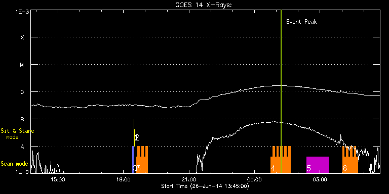EIS Observation timeline overlay to GOES-Xray curve Code 1" 2" 40" 266" EIS Observations list for this event: STUDY ACRONYM ID DATE OBSERVED DESCRIPTION NOAA# TARGET 0 PRY_slot_contextLITE | 41225 | 2014/06/26 18:24:54 | PRY_slot_contextLITE | 2098 | Active Region TIMELINE ID DATE OBSERVED FITS FILE XCEN (+W/-E) YCEN (+N/-S) DUR ----------------------------------------------------------------------------------------------------------------- 41225 | 2014/06/26 18:24:54.000 | eis_l0_20140626_182454.fits.gz | -15.29 | -0.50 | 2m56s 1 Alignment_266 | 41226 | 2014/06/26 18:28:08 | Alignment_266 | 2098 | Quiet Sun TIMELINE ID DATE OBSERVED FITS FILE XCEN (+W/-E) YCEN (+N/-S) DUR ----------------------------------------------------------------------------------------------------------------- 41226 | 2014/06/26 18:28:08.000 | eis_l0_20140626_182808.fits.gz | -132.57 | -0.50 | 1m22s 2 XRT_synop_AIA | 41227 | 2014/06/26 18:30:16 | XRT_synop_AIA | 2098 | Quiet Sun TIMELINE ID DATE OBSERVED FITS FILE XCEN (+W/-E) YCEN (+N/-S) DUR ----------------------------------------------------------------------------------------------------------------- 41227 | 2014/06/26 18:30:16.000 | eis_l0_20140626_183016.fits.gz | -132.57 | -0.42 | 10s 3 HH_Flare+AR_180x152 | 41257 | 2014/06/26 18:33:50 | Flare study | | Flare TIMELINE ID DATE OBSERVED FITS FILE XCEN (+W/-E) YCEN (+N/-S) DUR ----------------------------------------------------------------------------------------------------------------- 41257 | 2014/06/26 18:33:50.000 | eis_l0_20140626_183350.fits.gz | 881.84 | -225.00 | 5m19s 41257 | 2014/06/26 18:39:11.000 | eis_l0_20140626_183911.fits.gz | 882.08 | -225.08 | 5m19s 41257 | 2014/06/26 18:44:33.000 | eis_l0_20140626_184433.fits.gz | 882.31 | -225.00 | 5m18s 41257 | 2014/06/26 18:49:54.000 | eis_l0_20140626_184954.fits.gz | 882.54 | -224.85 | 5m18s 41257 | 2014/06/26 18:55:15.000 | eis_l0_20140626_185515.fits.gz | 882.85 | -224.92 | 5m18s 41257 | 2014/06/26 19:00:36.000 | eis_l0_20140626_190036.fits.gz | 883.00 | -224.92 | 5m18s 4 HH_Flare+AR_180x152 | 41273 | 2014/06/27 00:44:41 | Flare study | | Flare TIMELINE ID DATE OBSERVED FITS FILE XCEN (+W/-E) YCEN (+N/-S) DUR ----------------------------------------------------------------------------------------------------------------- 41273 | 2014/06/27 00:44:41.000 | eis_l0_20140627_004441.fits.gz | 894.17 | -222.91 | 5m18s 41273 | 2014/06/27 00:50:02.000 | eis_l0_20140627_005002.fits.gz | 894.41 | -222.91 | 5m19s 41273 | 2014/06/27 00:55:23.000 | eis_l0_20140627_005523.fits.gz | 894.56 | -222.91 | 5m18s 41273 | 2014/06/27 01:00:44.000 | eis_l0_20140627_010044.fits.gz | 894.79 | -222.91 | 5m17s 41273 | 2014/06/27 01:06:04.000 | eis_l0_20140627_010604.fits.gz | 895.02 | -222.99 | 5m17s 41273 | 2014/06/27 01:11:24.000 | eis_l0_20140627_011124.fits.gz | 895.26 | -222.84 | 5m18s 41273 | 2014/06/27 01:16:45.000 | eis_l0_20140627_011645.fits.gz | 895.41 | -222.91 | 5m17s 41273 | 2014/06/27 01:22:05.000 | eis_l0_20140627_012205.fits.gz | 895.72 | -222.91 | 5m19s 41273 | 2014/06/27 01:27:27.000 | eis_l0_20140627_012727.fits.gz | 895.87 | -222.68 | 5m18s 41273 | 2014/06/27 01:32:47.000 | eis_l0_20140627_013247.fits.gz | 896.10 | -222.60 | 5m19s 5 HPW021_VEL_120x512v1 | 41274 | 2014/06/27 02:22:57 | Flare study | 2093 | Active Region TIMELINE ID DATE OBSERVED FITS FILE XCEN (+W/-E) YCEN (+N/-S) DUR ----------------------------------------------------------------------------------------------------------------- 41274 | 2014/06/27 02:22:57.000 | eis_l0_20140627_022257.fits.gz | 885.20 | -248.45 | 1h1m53s 6 HH_Flare+AR_180x152 | 41291 | 2014/06/27 04:01:27 | Flare study | | Flare TIMELINE ID DATE OBSERVED FITS FILE XCEN (+W/-E) YCEN (+N/-S) DUR ----------------------------------------------------------------------------------------------------------------- 41291 | 2014/06/27 04:01:27.000 | eis_l0_20140627_040127.fits.gz | 894.99 | -221.76 | 5m18s 41291 | 2014/06/27 04:06:48.000 | eis_l0_20140627_040648.fits.gz | 895.14 | -221.83 | 5m18s 41291 | 2014/06/27 04:12:09.000 | eis_l0_20140627_041209.fits.gz | 895.37 | -221.83 | 5m18s 41291 | 2014/06/27 04:17:30.000 | eis_l0_20140627_041730.fits.gz | 895.60 | -221.76 | 5m18s 41291 | 2014/06/27 04:22:51.000 | eis_l0_20140627_042251.fits.gz | 895.76 | -221.83 | 5m19s 41291 | 2014/06/27 04:28:12.000 | eis_l0_20140627_042812.fits.gz | 895.99 | -221.91 | 5m18s 41291 | 2014/06/27 04:33:33.000 | eis_l0_20140627_043333.fits.gz | 896.07 | -221.68 | 5m19s 41291 | 2014/06/27 04:38:55.000 | eis_l0_20140627_043855.fits.gz | 896.30 | -221.83 | 5m17s : Check study information : Download file : View thumbnails For this event, also check for: