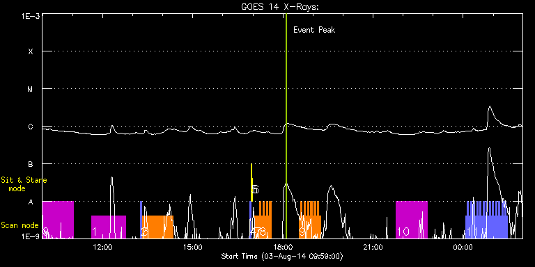 EIS Observation timeline overlay to GOES-Xray curve Code 1" 2" 40" 266" EIS Observations list for this event: STUDY ACRONYM ID DATE OBSERVED DESCRIPTION NOAA# TARGET 0 HPW021_VEL_120x512v1 | 41953 | 2014/08/03 09:59:03 | AR studies | | Active Region TIMELINE ID DATE OBSERVED FITS FILE XCEN (+W/-E) YCEN (+N/-S) DUR ----------------------------------------------------------------------------------------------------------------- 41953 | 2014/08/03 09:59:03.000 | eis_l0_20140803_095903.fits.gz | -199.51 | -285.61 | 1h1m53s 1 HPW022_VEL_480x512v1 | 41954 | 2014/08/03 11:37:41 | AR studies | 2130 | Active Region TIMELINE ID DATE OBSERVED FITS FILE XCEN (+W/-E) YCEN (+N/-S) DUR ----------------------------------------------------------------------------------------------------------------- 41954 | 2014/08/03 11:37:41.000 | eis_l0_20140803_113741.fits.gz | -184.74 | -285.92 | 1h7m38s 2 PRY_slot_context_v3 | 41956 | 2014/08/03 13:15:33 | AR studies | 2130 | Active Region TIMELINE ID DATE OBSERVED FITS FILE XCEN (+W/-E) YCEN (+N/-S) DUR ----------------------------------------------------------------------------------------------------------------- 41956 | 2014/08/03 13:15:33.000 | eis_l0_20140803_131533.fits.gz | -185.27 | -286.23 | 2m56s 3 Atlas_60 | 41957 | 2014/08/03 13:18:55 | AR studies | 2130 | Quiet Sun TIMELINE ID DATE OBSERVED FITS FILE XCEN (+W/-E) YCEN (+N/-S) DUR ----------------------------------------------------------------------------------------------------------------- 41957 | 2014/08/03 13:18:55.000 | eis_l0_20140803_131855.fits.gz | -199.94 | -276.23 | 1h1m39s 4 PRY_slot_contextLITE | 41933 | 2014/08/03 16:53:20 | PRY_slot_contextLITE | 2127 | Active Region TIMELINE ID DATE OBSERVED FITS FILE XCEN (+W/-E) YCEN (+N/-S) DUR ----------------------------------------------------------------------------------------------------------------- 41933 | 2014/08/03 16:53:20.000 | eis_l0_20140803_165320.fits.gz | -26.44 | -21.04 | 2m57s 5 Alignment_266 | 41934 | 2014/08/03 16:56:35 | Alignment_266 | 2130 | Quiet Sun TIMELINE ID DATE OBSERVED FITS FILE XCEN (+W/-E) YCEN (+N/-S) DUR ----------------------------------------------------------------------------------------------------------------- 41934 | 2014/08/03 16:56:35.000 | eis_l0_20140803_165635.fits.gz | -144.05 | -21.35 | 1m23s 6 XRT_synop_AIA | 41935 | 2014/08/03 16:59:10 | XRT_synop_AIA | 2130 | Quiet Sun TIMELINE ID DATE OBSERVED FITS FILE XCEN (+W/-E) YCEN (+N/-S) DUR ----------------------------------------------------------------------------------------------------------------- 41935 | 2014/08/03 16:59:10.000 | eis_l0_20140803_165910.fits.gz | -143.97 | -21.35 | 10s 7 madj_ar | 41942 | 2014/08/03 17:03:20 | HOP259 | | Active Region TIMELINE ID DATE OBSERVED FITS FILE XCEN (+W/-E) YCEN (+N/-S) DUR ----------------------------------------------------------------------------------------------------------------- 41942 | 2014/08/03 17:03:20.000 | eis_l0_20140803_170320.fits.gz | 240.19 | -213.28 | 9m42s 8 madj_ar_small | 41943 | 2014/08/03 17:13:06 | HOP259 | | Active Region TIMELINE ID DATE OBSERVED FITS FILE XCEN (+W/-E) YCEN (+N/-S) DUR ----------------------------------------------------------------------------------------------------------------- 41943 | 2014/08/03 17:13:06.000 | eis_l0_20140803_171306.fits.gz | 251.56 | -213.20 | 3m18s 41943 | 2014/08/03 17:16:27.000 | eis_l0_20140803_171627.fits.gz | 252.02 | -213.12 | 3m19s 41943 | 2014/08/03 17:19:49.000 | eis_l0_20140803_171949.fits.gz | 252.57 | -213.20 | 3m18s 41943 | 2014/08/03 17:23:10.000 | eis_l0_20140803_172310.fits.gz | 253.03 | -212.97 | 3m19s 41943 | 2014/08/03 17:26:32.000 | eis_l0_20140803_172632.fits.gz | 253.49 | -213.12 | 3m18s 41943 | 2014/08/03 17:29:53.000 | eis_l0_20140803_172953.fits.gz | 253.96 | -213.12 | 3m19s 41943 | 2014/08/03 17:33:15.000 | eis_l0_20140803_173315.fits.gz | 254.50 | -213.05 | 3m18s 9 madj_ar_small | 41949 | 2014/08/03 18:31:43 | HOP259 | | Active Region TIMELINE ID DATE OBSERVED FITS FILE XCEN (+W/-E) YCEN (+N/-S) DUR ----------------------------------------------------------------------------------------------------------------- 41949 | 2014/08/03 18:31:43.000 | eis_l0_20140803_183143.fits.gz | 262.92 | -212.82 | 3m19s 41949 | 2014/08/03 18:35:05.000 | eis_l0_20140803_183505.fits.gz | 263.53 | -212.89 | 3m18s 41949 | 2014/08/03 18:38:26.000 | eis_l0_20140803_183826.fits.gz | 264.00 | -212.74 | 3m18s 41949 | 2014/08/03 18:41:47.000 | eis_l0_20140803_184147.fits.gz | 264.54 | -213.05 | 3m19s 41949 | 2014/08/03 18:45:09.000 | eis_l0_20140803_184509.fits.gz | 265.00 | -212.82 | 3m18s 41949 | 2014/08/03 18:48:30.000 | eis_l0_20140803_184830.fits.gz | 265.39 | -212.97 | 3m19s 41949 | 2014/08/03 18:51:52.000 | eis_l0_20140803_185152.fits.gz | 265.93 | -212.89 | 3m18s 41949 | 2014/08/03 18:55:13.000 | eis_l0_20140803_185513.fits.gz | 266.39 | -212.82 | 3m19s 41949 | 2014/08/03 18:58:35.000 | eis_l0_20140803_185835.fits.gz | 266.93 | -212.82 | 3m18s 41949 | 2014/08/03 19:01:56.000 | eis_l0_20140803_190156.fits.gz | 267.40 | -212.82 | 3m19s 41949 | 2014/08/03 19:05:18.000 | eis_l0_20140803_190518.fits.gz | 267.86 | -212.82 | 3m18s 41949 | 2014/08/03 19:08:39.000 | eis_l0_20140803_190839.fits.gz | 268.48 | -212.74 | 3m18s 41949 | 2014/08/03 19:12:00.000 | eis_l0_20140803_191200.fits.gz | 268.86 | -212.89 | 3m19s 10 HPW021_VEL_120x512v1 | 41962 | 2014/08/03 21:45:56 | AR studies | 2131 | Active Region TIMELINE ID DATE OBSERVED FITS FILE XCEN (+W/-E) YCEN (+N/-S) DUR ----------------------------------------------------------------------------------------------------------------- 41962 | 2014/08/03 21:45:56.000 | eis_l0_20140803_214556.fits.gz | -94.70 | -287.77 | 1h1m53s 11 Alignment_modify_v2 | 41951 | 2014/08/04 00:05:06 | coalignment at the north limb | | Quiet Sun TIMELINE ID DATE OBSERVED FITS FILE XCEN (+W/-E) YCEN (+N/-S) DUR ----------------------------------------------------------------------------------------------------------------- 