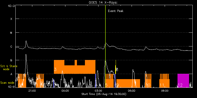 EIS Observation timeline overlay to GOES-Xray curve Code 1" 2" 40" 266" EIS Observations list for this event: STUDY ACRONYM ID DATE OBSERVED DESCRIPTION NOAA# TARGET 0 madj_ar_small | 41980 | 2014/08/05 19:43:13 | HOP259 | | Active Region TIMELINE ID DATE OBSERVED FITS FILE XCEN (+W/-E) YCEN (+N/-S) DUR ----------------------------------------------------------------------------------------------------------------- 41980 | 2014/08/05 19:43:13.000 | eis_l0_20140805_194313.fits.gz | 125.87 | -384.23 | 3m19s 41980 | 2014/08/05 19:46:35.000 | eis_l0_20140805_194635.fits.gz | 126.41 | -384.23 | 3m18s 41980 | 2014/08/05 19:49:56.000 | eis_l0_20140805_194956.fits.gz | 126.79 | -384.39 | 3m18s 41980 | 2014/08/05 19:53:17.000 | eis_l0_20140805_195317.fits.gz | 127.33 | -384.54 | 3m19s 41980 | 2014/08/05 19:56:39.000 | eis_l0_20140805_195639.fits.gz | 127.80 | -384.31 | 3m18s 41980 | 2014/08/05 20:00:01.000 | eis_l0_20140805_200001.fits.gz | 128.18 | -384.39 | 3m18s 41980 | 2014/08/05 20:03:22.000 | eis_l0_20140805_200322.fits.gz | 128.65 | -384.15 | 3m18s 41980 | 2014/08/05 20:06:43.000 | eis_l0_20140805_200643.fits.gz | 129.11 | -384.23 | 3m19s 41980 | 2014/08/05 20:10:05.000 | eis_l0_20140805_201005.fits.gz | 129.57 | -384.15 | 3m19s 41980 | 2014/08/05 20:13:27.000 | eis_l0_20140805_201327.fits.gz | 130.04 | -384.23 | 3m18s 41980 | 2014/08/05 20:16:48.000 | eis_l0_20140805_201648.fits.gz | 130.58 | -384.31 | 3m19s 41980 | 2014/08/05 20:20:10.000 | eis_l0_20140805_202010.fits.gz | 131.04 | -384.15 | 3m18s 41980 | 2014/08/05 20:23:31.000 | eis_l0_20140805_202331.fits.gz | 131.51 | -384.31 | 3m19s 1 HH_Flare_raster_v6 | 41993 | 2014/08/05 21:20:43 | Flare study | | Flare TIMELINE ID DATE OBSERVED FITS FILE XCEN (+W/-E) YCEN (+N/-S) DUR ----------------------------------------------------------------------------------------------------------------- 41993 | 2014/08/05 21:20:43.000 | eis_l0_20140805_212043.fits.gz | 172.45 | -333.68 | 3m32s 41993 | 2014/08/05 21:24:18.000 | eis_l0_20140805_212418.fits.gz | 173.07 | -333.68 | 3m31s 41993 | 2014/08/05 21:27:52.000 | eis_l0_20140805_212752.fits.gz | 173.46 | -333.68 | 3m31s 41993 | 2014/08/05 21:31:25.000 | eis_l0_20140805_213125.fits.gz | 174.00 | -333.68 | 3m32s 41993 | 2014/08/05 21:34:59.000 | eis_l0_20140805_213459.fits.gz | 174.54 | -333.61 | 3m32s 41993 | 2014/08/05 21:38:34.000 | eis_l0_20140805_213834.fits.gz | 175.00 | -333.61 | 3m31s 41993 | 2014/08/05 21:42:08.000 | eis_l0_20140805_214208.fits.gz | 175.54 | -333.68 | 3m31s 41993 | 2014/08/05 21:45:42.000 | eis_l0_20140805_214542.fits.gz | 176.00 | -333.61 | 3m32s 41993 | 2014/08/05 21:49:17.000 | eis_l0_20140805_214917.fits.gz | 176.54 | -333.76 | 3m31s 41993 | 2014/08/05 21:52:51.000 | eis_l0_20140805_215251.fits.gz | 176.93 | -333.61 | 3m32s 41993 | 2014/08/05 21:56:26.000 | eis_l0_20140805_215626.fits.gz | 177.47 | -333.53 | 3m32s 41993 | 2014/08/05 22:00:00.000 | eis_l0_20140805_220000.fits.gz | 178.09 | -333.53 | 3m32s 2 PRY_slot_context_v3 | 42020 | 2014/08/05 22:55:50 | Flare study | 2130 | Active Region TIMELINE ID DATE OBSERVED FITS FILE XCEN (+W/-E) YCEN (+N/-S) DUR ----------------------------------------------------------------------------------------------------------------- 42020 | 2014/08/05 22:55:50.000 | eis_l0_20140805_225550.fits.gz | 43.86 | -446.68 | 2m57s 3 FLAREDOP_EIS | 42021 | 2014/08/05 22:59:12 | Flare study | | Flare TIMELINE ID DATE OBSERVED FITS FILE XCEN (+W/-E) YCEN (+N/-S) DUR ----------------------------------------------------------------------------------------------------------------- 42021 | 2014/08/05 22:59:12.000 | eis_l0_20140805_225912.fits.gz | 56.06 | -419.61 | 55m50s 42021 | 2014/08/05 23:55:04.000 | eis_l0_20140805_235504.fits.gz | 63.79 | -419.53 | 55m50s 42021 | 2014/08/06 00:50:56.000 | eis_l0_20140806_005056.fits.gz | 71.67 | -419.53 | 11m32s 42021 | 2014/08/06 01:01:56.000 | eis_l0_20140806_010156.fits.gz | 73.21 | -419.53 | 44m50s 42021 | 2014/08/06 01:46:48.000 | eis_l0_20140806_014648.fits.gz | 79.47 | -419.53 | 55m50s 4 PRY_slot_context_v3 | 42022 | 2014/08/06 02:42:49 | Flare study | 2132 | Active Region TIMELINE ID DATE OBSERVED FITS FILE XCEN (+W/-E) YCEN (+N/-S) DUR ----------------------------------------------------------------------------------------------------------------- 42022 | 2014/08/06 02:42:49.000 | eis_l0_20140806_024249.fits.gz | 75.61 | -445.45 | 2m57s 5 HH_Flare_raster_v6 | 41997 | 2014/08/06 03:35:34 | Flare study | 2132 | Flare TIMELINE ID DATE OBSERVED FITS FILE XCEN (+W/-E) YCEN (+N/-S) DUR ----------------------------------------------------------------------------------------------------------------- 41997 | 2014/08/06 03:35:34.000 | eis_l0_20140806_033534.fits.gz | 75.89 | -445.30 | 3m32s 41997 | 2014/08/06 03:39:09.000 | eis_l0_20140806_033909.fits.gz | 76.43 | -445.14 | 3m31s 41997 | 2014/08/06 03:42:43.000 | eis_l0_20140806_034243.fits.gz | 76.89 | -445.22 | 3m31s 41997 | 2014/08/06 03:46:17.000 | eis_l0_20140806_034617.fits.gz | 77.51 | -445.38 | 3m32s 41997 | 2014/08/06 03:49:52.000 | eis_l0_20140806_034952.fits.gz | 77.98 | -445.22 | 3m31s 41997 | 2014/08/06 03:53:26.000 | eis_l0_20140806_035326.fits.gz | 78.44 | -445.45 | 3m31s 41997 | 2014/08/06 03:57:00.000 | eis_l0_20140806_035700.fits.gz | 78.98 | -445.45 | 3m31s 41997 | 2014/08/06 04:00:34.000 | eis_l0_20140806_040034.fits.gz | 79.37 | -445.38 | 3m32s 41997 | 2014/08/06 04:04:08.000 | eis_l0_20140806_040408.fits.gz | 79.91 | -445.45 | 3m32s 41997 | 2014/08/06 04:07:43.000 | eis_l0_20140806_040743.fits.gz | 80.37 | -445.38 | 3m31s 41997 | 2014/08/06 04:11:17.000 | eis_l0_20140806_041117.fits.gz | 80.91 | -445.30 | 3m31s 41997 | 2014/08/06 04:14:51.000 | eis_l0_20140806_041451.fits.gz | 81.45 | -445.38 | 3m31s 41997 | 2014/08/06 04:18:25.000 | eis_l0_20140806_041825.fits.gz | 81.84 | -445.30 | 3m32s 6 PRY_slot_contextLITE | 41981 | 2014/08/06 04:28:20 | PRY_slot_contextLITE | | Active Region TIMELINE ID DATE OBSERVED FITS FILE XCEN (+W/-E) YCEN (+N/-S
