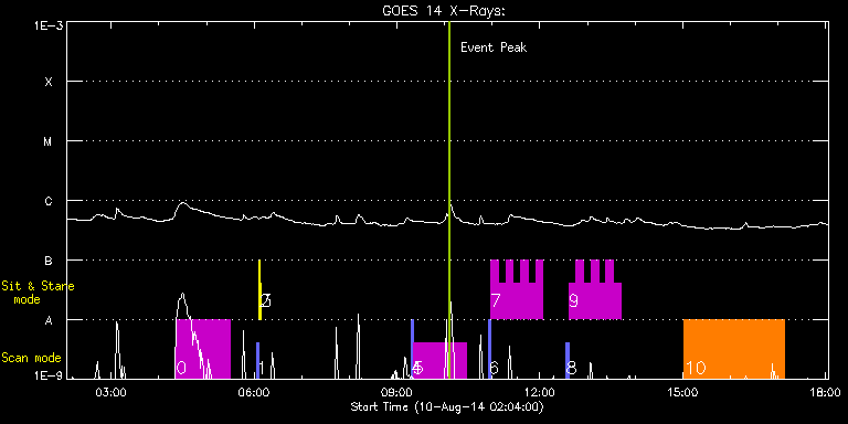 EIS Observation timeline overlay to GOES-Xray curve Code 1" 2" 40" 266" EIS Observations list for this event: STUDY ACRONYM ID DATE OBSERVED DESCRIPTION NOAA# TARGET 0 HPW022_VEL_480x512v1 | 42098 | 2014/08/10 04:22:12 | Active region 12135. Large scan. | 2135 | Active Region TIMELINE ID DATE OBSERVED FITS FILE XCEN (+W/-E) YCEN (+N/-S) DUR ----------------------------------------------------------------------------------------------------------------- 42098 | 2014/08/10 04:22:12.000 | eis_l0_20140810_042212.fits.gz | -319.62 | 122.75 | 1h7m39s 1 PRY_slot_contextLITE | 42099 | 2014/08/10 06:03:31 | EIS-AIA alignment | | Active Region TIMELINE ID DATE OBSERVED FITS FILE XCEN (+W/-E) YCEN (+N/-S) DUR ----------------------------------------------------------------------------------------------------------------- 42099 | 2014/08/10 06:03:31.000 | eis_l0_20140810_060331.fits.gz | -15.21 | -0.50 | 2m56s 2 Alignment_266 | 42100 | 2014/08/10 06:06:45 | EIS-AIA alignment | | Quiet Sun TIMELINE ID DATE OBSERVED FITS FILE XCEN (+W/-E) YCEN (+N/-S) DUR ----------------------------------------------------------------------------------------------------------------- 42100 | 2014/08/10 06:06:45.000 | eis_l0_20140810_060645.fits.gz | -132.49 | -0.50 | 1m22s 3 XRT_synop_AIA | 42101 | 2014/08/10 06:09:18 | EIS-AIA alignment | | Quiet Sun TIMELINE ID DATE OBSERVED FITS FILE XCEN (+W/-E) YCEN (+N/-S) DUR ----------------------------------------------------------------------------------------------------------------- 42101 | 2014/08/10 06:09:18.000 | eis_l0_20140810_060918.fits.gz | -132.49 | -0.35 | 10s 4 PRY_slot_contextLITE | 42102 | 2014/08/10 09:17:25 | Filament. Slot context. | 2137 | Active Region TIMELINE ID DATE OBSERVED FITS FILE XCEN (+W/-E) YCEN (+N/-S) DUR ----------------------------------------------------------------------------------------------------------------- 42102 | 2014/08/10 09:17:25.000 | eis_l0_20140810_091725.fits.gz | 345.86 | -434.05 | 2m56s 5 HPW022_VEL_480x512v1 | 42117 | 2014/08/10 09:20:32 | Filament. Large scan. | 2137 | Active Region TIMELINE ID DATE OBSERVED FITS FILE XCEN (+W/-E) YCEN (+N/-S) DUR ----------------------------------------------------------------------------------------------------------------- 42117 | 2014/08/10 09:20:32.000 | eis_l0_20140810_092032.fits.gz | 361.14 | -433.98 | 1h7m40s 6 PRY_slot_context_v3 | 42118 | 2014/08/10 10:55:32 | Filament. Slot context. | 2137 | Active Region TIMELINE ID DATE OBSERVED FITS FILE XCEN (+W/-E) YCEN (+N/-S) DUR ----------------------------------------------------------------------------------------------------------------- 42118 | 2014/08/10 10:55:32.000 | eis_l0_20140810_105532.fits.gz | 357.91 | -433.59 | 2m56s 7 HPW016_DETAILED_SAS | 42119 | 2014/08/10 10:58:39 | Filament sit-and-stare. | | Active Region TIMELINE ID DATE OBSERVED FITS FILE XCEN (+W/-E) YCEN (+N/-S) DUR ----------------------------------------------------------------------------------------------------------------- 42119 | 2014/08/10 10:58:39.000 | eis_l0_20140810_105839.fits.gz | 373.27 | -433.51 | 9m17s 42119 | 2014/08/10 11:08:01.000 | eis_l0_20140810_110801.fits.gz | 374.51 | -433.51 | 9m17s 42119 | 2014/08/10 11:17:23.000 | eis_l0_20140810_111723.fits.gz | 375.67 | -433.44 | 9m17s 42119 | 2014/08/10 11:26:45.000 | eis_l0_20140810_112645.fits.gz | 376.75 | -433.36 | 9m17s 42119 | 2014/08/10 11:36:07.000 | eis_l0_20140810_113607.fits.gz | 378.06 | -433.51 | 9m17s 42119 | 2014/08/10 11:45:29.000 | eis_l0_20140810_114529.fits.gz | 379.14 | -433.20 | 9m17s 42119 | 2014/08/10 11:54:51.000 | eis_l0_20140810_115451.fits.gz | 380.46 | -433.20 | 9m17s 8 PRY_slot_context_v3 | 42120 | 2014/08/10 12:33:32 | Filament. Slot context. | 2137 | Active Region TIMELINE ID DATE OBSERVED FITS FILE XCEN (+W/-E) YCEN (+N/-S) DUR ----------------------------------------------------------------------------------------------------------------- 42120 | 2014/08/10 12:33:32.000 | eis_l0_20140810_123332.fits.gz | 370.04 | -432.82 | 2m56s 9 HPW016_DETAILED_SAS | 42121 | 2014/08/10 12:36:40 | Filament sit-and-stare. | | Active Region TIMELINE ID DATE OBSERVED FITS FILE XCEN (+W/-E) YCEN (+N/-S) DUR ----------------------------------------------------------------------------------------------------------------- 42121 | 2014/08/10 12:36:40.000 | eis_l0_20140810_123640.fits.gz | 385.48 | -432.90 | 9m17s 42121 | 2014/08/10 12:46:02.000 | eis_l0_20140810_124602.fits.gz | 386.64 | -432.82 | 9m17s 42121 | 2014/08/10 12:55:24.000 | eis_l0_20140810_125524.fits.gz | 387.80 | -432.82 | 9m17s 42121 | 2014/08/10 13:04:46.000 | eis_l0_20140810_130446.fits.gz | 388.88 | -432.74 | 9m17s 42121 | 2014/08/10 13:14:07.000 | eis_l0_20140810_131407.fits.gz | 390.04 | -432.66 | 9m18s 42121 | 2014/08/10 13:23:30.000 | eis_l0_20140810_132330.fits.gz | 391.19 | -432.66 | 9m17s 42121 | 2014/08/10 13:32:52.000 | eis_l0_20140810_133252.fits.gz | 392.27 | -432.59 | 9m17s 10 cam_ar_limb_lite_v2 | 42108 | 2014/08/10 15:02:24 | AR Temperature Diagnostic. NE limb. | | Active Region TIMELINE ID DATE OBSERVED FITS FILE XCEN (+W/-E) YCEN (+N/-S) DUR ----------------------------------------------------------------------------------------------------------------- 42108 | 2014/08/10 15:02:24.000 | eis_l0_20140810_150224.fits.gz | -9914.88 | -9970.20 | 2h6m1s : Check study information : Download file : View thumbnails For this event, also check for: