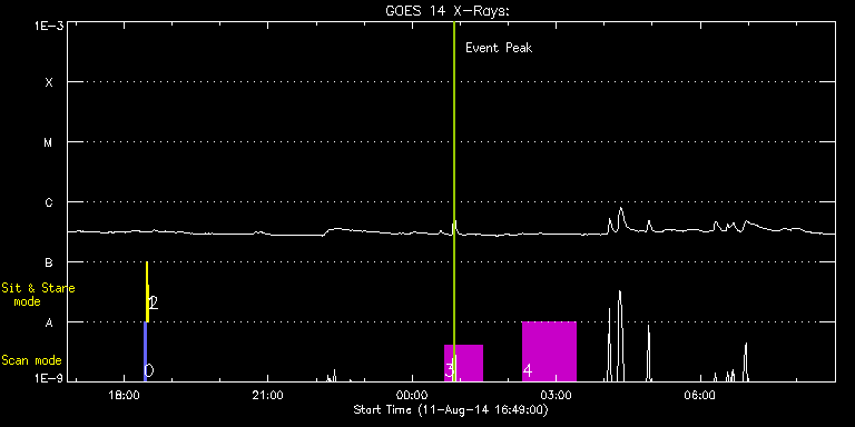 EIS Observation timeline overlay to GOES-Xray curve Code 1" 2" 40" 266" EIS Observations list for this event: STUDY ACRONYM ID DATE OBSERVED DESCRIPTION NOAA# TARGET 0 PRY_slot_contextLITE | 42103 | 2014/08/11 18:24:30 | EIS-AIA alignment | 2135 | Active Region TIMELINE ID DATE OBSERVED FITS FILE XCEN (+W/-E) YCEN (+N/-S) DUR ----------------------------------------------------------------------------------------------------------------- 42103 | 2014/08/11 18:24:30.000 | eis_l0_20140811_182430.fits.gz | -15.37 | -0.58 | 2m56s 1 Alignment_266 | 42104 | 2014/08/11 18:27:44 | EIS-AIA alignment | 2135 | Quiet Sun TIMELINE ID DATE OBSERVED FITS FILE XCEN (+W/-E) YCEN (+N/-S) DUR ----------------------------------------------------------------------------------------------------------------- 42104 | 2014/08/11 18:27:44.000 | eis_l0_20140811_182744.fits.gz | -132.57 | -0.50 | 1m22s 2 XRT_synop_AIA | 42105 | 2014/08/11 18:30:17 | EIS-AIA alignment | 2135 | Quiet Sun TIMELINE ID DATE OBSERVED FITS FILE XCEN (+W/-E) YCEN (+N/-S) DUR ----------------------------------------------------------------------------------------------------------------- 42105 | 2014/08/11 18:30:17.000 | eis_l0_20140811_183017.fits.gz | -132.57 | -0.42 | 10s 3 HPW021_VEL_120x512v2 | 42111 | 2014/08/12 00:40:30 | Active region 12135. Scan. | 2135 | Active Region TIMELINE ID DATE OBSERVED FITS FILE XCEN (+W/-E) YCEN (+N/-S) DUR ----------------------------------------------------------------------------------------------------------------- 42111 | 2014/08/12 00:40:30.000 | eis_l0_20140812_004030.fits.gz | 69.68 | 98.26 | 46m53s 4 HPW022_VEL_480x512v1 | 42114 | 2014/08/12 02:17:37 | Active region 12135. Large scan. | 2135 | Active Region TIMELINE ID DATE OBSERVED FITS FILE XCEN (+W/-E) YCEN (+N/-S) DUR ----------------------------------------------------------------------------------------------------------------- 42114 | 2014/08/12 02:17:37.000 | eis_l0_20140812_021737.fits.gz | 84.37 | 118.26 | 1h7m40s : Check study information : Download file : View thumbnails For this event, also check for: