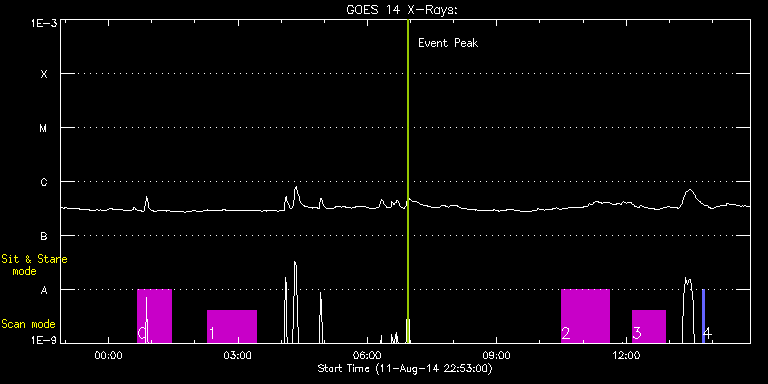 EIS Observation timeline overlay to GOES-Xray curve Code 1" 2" 40" 266" EIS Observations list for this event: STUDY ACRONYM ID DATE OBSERVED DESCRIPTION NOAA# TARGET 0 HPW021_VEL_120x512v2 | 42111 | 2014/08/12 00:40:30 | Active region 12135. Scan. | 2135 | Active Region TIMELINE ID DATE OBSERVED FITS FILE XCEN (+W/-E) YCEN (+N/-S) DUR ----------------------------------------------------------------------------------------------------------------- 42111 | 2014/08/12 00:40:30.000 | eis_l0_20140812_004030.fits.gz | 69.68 | 98.26 | 46m53s 1 HPW022_VEL_480x512v1 | 42114 | 2014/08/12 02:17:37 | Active region 12135. Large scan. | 2135 | Active Region TIMELINE ID DATE OBSERVED FITS FILE XCEN (+W/-E) YCEN (+N/-S) DUR ----------------------------------------------------------------------------------------------------------------- 42114 | 2014/08/12 02:17:37.000 | eis_l0_20140812_021737.fits.gz | 84.37 | 118.26 | 1h7m40s 2 HPW022_VEL_480x512v1 | 42122 | 2014/08/12 10:29:40 | Active region 12135. Large scan. | 2135 | Active Region TIMELINE ID DATE OBSERVED FITS FILE XCEN (+W/-E) YCEN (+N/-S) DUR ----------------------------------------------------------------------------------------------------------------- 42122 | 2014/08/12 10:29:40.000 | eis_l0_20140812_102940.fits.gz | 177.22 | 95.00 | 1h7m39s 3 HPW021_VEL_120x512v2 | 42123 | 2014/08/12 12:08:14 | Active region 12135. Scan. | | Active Region TIMELINE ID DATE OBSERVED FITS FILE XCEN (+W/-E) YCEN (+N/-S) DUR ----------------------------------------------------------------------------------------------------------------- 42123 | 2014/08/12 12:08:14.000 | eis_l0_20140812_120814.fits.gz | 190.93 | 95.31 | 46m53s 4 PRY_slot_contextLITE | 42124 | 2014/08/12 13:46:33 | Active region 12135. Slot context. | 2135 | Active Region TIMELINE ID DATE OBSERVED FITS FILE XCEN (+W/-E) YCEN (+N/-S) DUR ----------------------------------------------------------------------------------------------------------------- 42124 | 2014/08/12 13:46:33.000 | eis_l0_20140812_134633.fits.gz | 190.73 | 95.39 | 2m56s : Check study information : Download file : View thumbnails For this event, also check for: