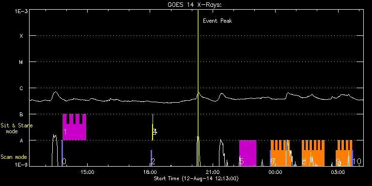 EIS Observation timeline overlay to GOES-Xray curve Code 1" 2" 40" 266" EIS Observations list for this event: STUDY ACRONYM ID DATE OBSERVED DESCRIPTION NOAA# TARGET 0 PRY_slot_contextLITE | 42124 | 2014/08/12 13:46:33 | Active region 12135. Slot context. | 2135 | Active Region TIMELINE ID DATE OBSERVED FITS FILE XCEN (+W/-E) YCEN (+N/-S) DUR ----------------------------------------------------------------------------------------------------------------- 42124 | 2014/08/12 13:46:33.000 | eis_l0_20140812_134633.fits.gz | 190.73 | 95.39 | 2m56s 1 HPW016_DETAILED_SAS | 42125 | 2014/08/12 13:49:41 | Active region 12135. Sit-and-stare. | | Active Region TIMELINE ID DATE OBSERVED FITS FILE XCEN (+W/-E) YCEN (+N/-S) DUR ----------------------------------------------------------------------------------------------------------------- 42125 | 2014/08/12 13:49:41.000 | eis_l0_20140812_134941.fits.gz | 248.10 | 59.46 | 9m17s 42125 | 2014/08/12 13:59:03.000 | eis_l0_20140812_135903.fits.gz | 249.41 | 59.39 | 9m17s 42125 | 2014/08/12 14:08:24.000 | eis_l0_20140812_140824.fits.gz | 250.73 | 59.54 | 9m18s 42125 | 2014/08/12 14:17:46.000 | eis_l0_20140812_141746.fits.gz | 252.04 | 59.54 | 9m17s 42125 | 2014/08/12 14:27:08.000 | eis_l0_20140812_142708.fits.gz | 253.35 | 59.46 | 9m17s 42125 | 2014/08/12 14:36:30.000 | eis_l0_20140812_143630.fits.gz | 254.74 | 59.54 | 9m17s 42125 | 2014/08/12 14:45:52.000 | eis_l0_20140812_144552.fits.gz | 256.13 | 59.69 | 9m17s 2 PRY_slot_contextLITE | 42126 | 2014/08/12 18:02:33 | EIS-AIA alignment | 2135 | Active Region TIMELINE ID DATE OBSERVED FITS FILE XCEN (+W/-E) YCEN (+N/-S) DUR ----------------------------------------------------------------------------------------------------------------- 42126 | 2014/08/12 18:02:33.000 | eis_l0_20140812_180233.fits.gz | -31.51 | -5.58 | 2m57s 3 Alignment_266 | 42127 | 2014/08/12 18:05:47 | EIS-AIA alignment | | Quiet Sun TIMELINE ID DATE OBSERVED FITS FILE XCEN (+W/-E) YCEN (+N/-S) DUR ----------------------------------------------------------------------------------------------------------------- 42127 | 2014/08/12 18:05:47.000 | eis_l0_20140812_180547.fits.gz | -132.49 | -0.50 | 1m22s 4 XRT_synop_AIA | 42128 | 2014/08/12 18:07:54 | EIS-AIA alignment | | Quiet Sun TIMELINE ID DATE OBSERVED FITS FILE XCEN (+W/-E) YCEN (+N/-S) DUR ----------------------------------------------------------------------------------------------------------------- 42128 | 2014/08/12 18:07:54.000 | eis_l0_20140812_180754.fits.gz | -132.57 | -0.42 | 11s 5 HPW021_VEL_120x512v2 | 42141 | 2014/08/12 22:16:33 | Active region 12135. Scan. | | Active Region TIMELINE ID DATE OBSERVED FITS FILE XCEN (+W/-E) YCEN (+N/-S) DUR ----------------------------------------------------------------------------------------------------------------- 42141 | 2014/08/12 22:16:33.000 | eis_l0_20140812_221633.fits.gz | 278.38 | 97.39 | 46m53s 6 PRY_slot_contextLITE | 42142 | 2014/08/12 23:44:33 | Coronal response to MMF with IRIS. Slo | 2135 | Active Region TIMELINE ID DATE OBSERVED FITS FILE XCEN (+W/-E) YCEN (+N/-S) DUR ----------------------------------------------------------------------------------------------------------------- 42142 | 2014/08/12 23:44:33.000 | eis_l0_20140812_234433.fits.gz | 292.23 | 103.01 | 2m56s 7 Cor_Hole_Jet_v1 | 42136 | 2014/08/12 23:47:53 | Coronal response to MMF with IRIS. Fas | | Quiet Sun TIMELINE ID DATE OBSERVED FITS FILE XCEN (+W/-E) YCEN (+N/-S) DUR ----------------------------------------------------------------------------------------------------------------- 42136 | 2014/08/12 23:47:53.000 | eis_l0_20140812_234753.fits.gz | 290.04 | 117.86 | 5m47s 42136 | 2014/08/12 23:53:43.000 | eis_l0_20140812_235343.fits.gz | 290.89 | 117.93 | 5m47s 42136 | 2014/08/12 23:59:33.000 | eis_l0_20140812_235933.fits.gz | 291.59 | 117.93 | 5m46s 42136 | 2014/08/13 00:05:22.000 | eis_l0_20140813_000522.fits.gz | 292.44 | 117.93 | 5m47s 42136 | 2014/08/13 00:11:12.000 | eis_l0_20140813_001112.fits.gz | 293.29 | 118.01 | 5m46s 42136 | 2014/08/13 00:17:01.000 | eis_l0_20140813_001701.fits.gz | 293.98 | 118.09 | 5m47s 42136 | 2014/08/13 00:22:51.000 | eis_l0_20140813_002251.fits.gz | 294.91 | 118.09 | 5m47s 42136 | 2014/08/13 00:28:40.000 | eis_l0_20140813_002840.fits.gz | 295.76 | 118.17 | 5m47s 42136 | 2014/08/13 00:34:30.000 | eis_l0_20140813_003430.fits.gz | 296.61 | 118.17 | 5m47s 42136 | 2014/08/13 00:40:20.000 | eis_l0_20140813_004020.fits.gz | 297.38 | 118.24 | 5m47s 8 Cor_Hole_Jet_v1 | 42137 | 2014/08/13 01:15:39 | Coronal response to MMF with IRIS. Fas | 2135 | Quiet Sun TIMELINE ID DATE OBSERVED FITS FILE XCEN (+W/-E) YCEN (+N/-S) DUR ----------------------------------------------------------------------------------------------------------------- 42137 | 2014/08/13 01:15:39.000 | eis_l0_20140813_011539.fits.gz | 302.25 | 118.47 | 5m47s 42137 | 2014/08/13 01:21:29.000 | eis_l0_20140813_012129.fits.gz | 303.10 | 118.32 | 5m47s 42137 | 2014/08/13 01:27:19.000 | eis_l0_20140813_012719.fits.gz | 303.95 | 118.40 | 5m47s 42137 | 2014/08/13 01:33:09.000 | eis_l0_20140813_013309.fits.gz | 304.80 | 118.55 | 5m46s 42137 | 2014/08/13 01:38:58.000 | eis_l0_20140813_013858.fits.gz | 305.57 | 118.47 | 5m47s 42137 | 2014/08/13 01:44:48.000 | eis_l0_20140813_014448.fits.gz | 306.34 | 118.55 | 5m46s 42137 | 2014/08/13 01:50:37.000 | eis_l0_20140813_015037.fits.gz | 307.19 | 118.47 | 5m47s 42137 | 2014/08/13 01:56:27.000 | eis_l0_20140813_015627.fits.gz | 308.04 | 118.47 | 5m46s 42137 | 2014/08/13 02:02:16.000 | eis_l0_20140813_020216.fits.gz | 308.73 | 118.55 | 5m47s 42137 | 2014/08/13 02:08:06.000 | eis_l0_20140813_020806.fits.gz | 309.58 | 118.71 | 5m47s 42137 | 2014/08/13 02:13:56.000 | eis_l0_20140813_021356.fits.gz | 310.43 | 118.63 | 5m46s 9 Cor_Hole_Jet_v1 | 42138 | 2014/08/13 02:53:14 | Coronal response to MMF with IRIS. Fas | 2135 | Quiet Sun TIMELINE ID DATE OBSERVED FITS FILE XCEN (+W/-E) YCEN (+N/-S) DUR ----------------------------------------------------