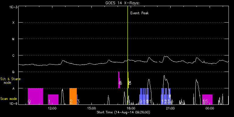 EIS Observation timeline overlay to GOES-Xray curve Code 1" 2" 40" 266" EIS Observations list for this event: STUDY ACRONYM ID DATE OBSERVED DESCRIPTION NOAA# TARGET 0 HPW022_VEL_480x512v1 | 42150 | 2014/08/14 10:09:13 | Active region 12135. Large scan. | 2135 | Active Region TIMELINE ID DATE OBSERVED FITS FILE XCEN (+W/-E) YCEN (+N/-S) DUR ----------------------------------------------------------------------------------------------------------------- 42150 | 2014/08/14 10:09:13.000 | eis_l0_20140814_100913.fits.gz | 559.44 | 113.69 | 1h7m39s 1 HPW021_VEL_120x512v2 | 42151 | 2014/08/14 11:41:13 | Active region 12135. Scan. | | Active Region TIMELINE ID DATE OBSERVED FITS FILE XCEN (+W/-E) YCEN (+N/-S) DUR ----------------------------------------------------------------------------------------------------------------- 42151 | 2014/08/14 11:41:13.000 | eis_l0_20140814_114113.fits.gz | 569.10 | 115.54 | 46m52s 2 Atlas_30 | 42174 | 2014/08/14 13:19:56 | Active region 12135. Atlas. | 2135 | Quiet Sun TIMELINE ID DATE OBSERVED FITS FILE XCEN (+W/-E) YCEN (+N/-S) DUR ----------------------------------------------------------------------------------------------------------------- 42174 | 2014/08/14 13:19:56.000 | eis_l0_20140814_131956.fits.gz | 529.55 | 117.78 | 31m38s 3 PRY_slot_context_v3 | 42175 | 2014/08/14 13:51:45 | Active region 12139. Slot context. | 2135 | Active Region TIMELINE ID DATE OBSERVED FITS FILE XCEN (+W/-E) YCEN (+N/-S) DUR ----------------------------------------------------------------------------------------------------------------- 42175 | 2014/08/14 13:51:45.000 | eis_l0_20140814_135145.fits.gz | 569.28 | 117.01 | 2m56s 4 regcal071 | 42166 | 2014/08/14 17:02:41 | Dark exposures, CCD bottom rows (100s | | Engineering TIMELINE ID DATE OBSERVED FITS FILE XCEN (+W/-E) YCEN (+N/-S) DUR ----------------------------------------------------------------------------------------------------------------- 42166 | 2014/08/14 17:02:41.000 | eis_l0_20140814_170241.fits.gz | 637.13 | -181.98 | 3m22s 5 regcal072 | 42167 | 2014/08/14 17:06:30 | Dark exposures, top CCD rows (100s exp | | Engineering TIMELINE ID DATE OBSERVED FITS FILE XCEN (+W/-E) YCEN (+N/-S) DUR ----------------------------------------------------------------------------------------------------------------- 42167 | 2014/08/14 17:06:30.000 | eis_l0_20140814_170630.fits.gz | 637.51 | 329.02 | 3m22s 6 PRY_slot_contextLITE | 42152 | 2014/08/14 17:42:39 | EIS-AIA alignment | | Active Region TIMELINE ID DATE OBSERVED FITS FILE XCEN (+W/-E) YCEN (+N/-S) DUR ----------------------------------------------------------------------------------------------------------------- 42152 | 2014/08/14 17:42:39.000 | eis_l0_20140814_174239.fits.gz | -15.29 | -0.73 | 2m56s 7 Alignment_266 | 42153 | 2014/08/14 17:45:53 | EIS-AIA alignment | | Quiet Sun TIMELINE ID DATE OBSERVED FITS FILE XCEN (+W/-E) YCEN (+N/-S) DUR ----------------------------------------------------------------------------------------------------------------- 42153 | 2014/08/14 17:45:53.000 | eis_l0_20140814_174553.fits.gz | -132.57 | -0.42 | 1m22s 8 XRT_synop_AIA | 42154 | 2014/08/14 17:48:00 | EIS-AIA alignment | | Quiet Sun TIMELINE ID DATE OBSERVED FITS FILE XCEN (+W/-E) YCEN (+N/-S) DUR ----------------------------------------------------------------------------------------------------------------- 42154 | 2014/08/14 17:48:00.000 | eis_l0_20140814_174800.fits.gz | -132.49 | -0.58 | 10s 9 Alignment_modify_v2 | 42158 | 2014/08/14 18:38:57 | Alignment program. North limb. | | Quiet Sun TIMELINE ID DATE OBSERVED FITS FILE XCEN (+W/-E) YCEN (+N/-S) DUR ----------------------------------------------------------------------------------------------------------------- 42158 | 2014/08/14 18:38:57.000 | eis_l0_20140814_183857.fits.gz | -26.52 | 940.33 | 2m34s 42158 | 2014/08/14 18:42:04.000 | eis_l0_20140814_184204.fits.gz | -26.52 | 940.48 | 2m34s 42158 | 2014/08/14 18:45:12.000 | eis_l0_20140814_184512.fits.gz | -26.52 | 940.41 | 2m34s 42158 | 2014/08/14 18:48:19.000 | eis_l0_20140814_184819.fits.gz | -26.44 | 940.25 | 2m34s 10 Alignment_modify_v2 | 42159 | 2014/08/14 18:53:44 | Alignment program. North limb. | | Quiet Sun TIMELINE ID DATE OBSERVED FITS FILE XCEN (+W/-E) YCEN (+N/-S) DUR ----------------------------------------------------------------------------------------------------------------- 42159 | 2014/08/14 18:53:44.000 | eis_l0_20140814_185344.fits.gz | -26.44 | 940.41 | 2m34s 42159 | 2014/08/14 18:56:51.000 | eis_l0_20140814_185651.fits.gz | -26.52 | 940.33 | 2m34s 42159 | 2014/08/14 18:59:59.000 | eis_l0_20140814_185959.fits.gz | -26.52 | 940.41 | 2m34s 42159 | 2014/08/14 19:03:07.000 | eis_l0_20140814_190307.fits.gz | -26.52 | 940.41 | 2m33s 11 Alignment_modify_v2 | 42160 | 2014/08/14 19:08:44 | Alignment program. North limb. | | Quiet Sun TIMELINE ID DATE OBSERVED FITS FILE XCEN (+W/-E) YCEN (+N/-S) DUR ----------------------------------------------------------------------------------------------------------------- 42160 | 2014/08/14 19:08:44.000 | eis_l0_20140814_190844.fits.gz | -26.44 | 940.48 | 2m34s 42160 | 2014/08/14 19:11:51.000 | eis_l0_20140814_191151.fits.gz | -26.60 | 940.33 | 2m34s 42160 | 2014/08/14 19:14:59.000 | eis_l0_20140814_191459.fits.gz | -26.44 | 940.33 | 2m34s 42160 | 2014/08/14 19:18:06.000 | eis_l0_20140814_191806.fits.gz | -26.44 | 940.41 | 2m34s 12 Alignment_modify_v2 | 42161 | 2014/08/14 20:16:43 | Alignment program. East limb. | | Quiet Sun TIMELINE ID DATE OBSERVED FITS FILE XCEN (+W/-E) YCEN (+N/-S) DUR ----------------------------------------------------------------------------------------------------------------- 42161 | 2014/08/14 20:16:43.000 | eis_l0_20140814_201643.fits.gz | -9910.90 | -9967.20 | 2m34s 42161 | 2014/08/14 20:19:51.000 | eis_l0_20140814_201951.fits.gz | -9910.90 | -9967.20 | 2m34s 42161 | 2014/08/14 20:22:59.000 | eis_l0_20140814_202259.fits.gz | -9910.90 | -9967.20 | 2m33s 42161 | 2014/08/14 20:26:06.000 | eis