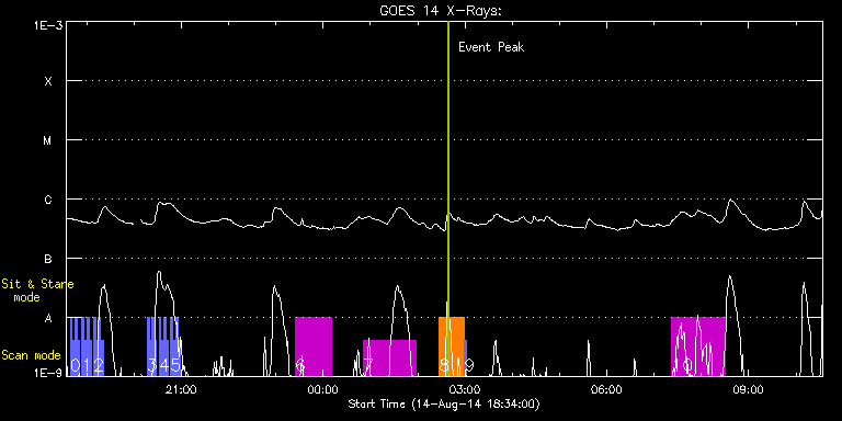 EIS Observation timeline overlay to GOES-Xray curve Code 1" 2" 40" 266" EIS Observations list for this event: STUDY ACRONYM ID DATE OBSERVED DESCRIPTION NOAA# TARGET 0 Alignment_modify_v2 | 42158 | 2014/08/14 18:38:57 | Alignment program. North limb. | | Quiet Sun TIMELINE ID DATE OBSERVED FITS FILE XCEN (+W/-E) YCEN (+N/-S) DUR ----------------------------------------------------------------------------------------------------------------- 42158 | 2014/08/14 18:38:57.000 | eis_l0_20140814_183857.fits.gz | -26.52 | 940.33 | 2m34s 42158 | 2014/08/14 18:42:04.000 | eis_l0_20140814_184204.fits.gz | -26.52 | 940.48 | 2m34s 42158 | 2014/08/14 18:45:12.000 | eis_l0_20140814_184512.fits.gz | -26.52 | 940.41 | 2m34s 42158 | 2014/08/14 18:48:19.000 | eis_l0_20140814_184819.fits.gz | -26.44 | 940.25 | 2m34s 1 Alignment_modify_v2 | 42159 | 2014/08/14 18:53:44 | Alignment program. North limb. | | Quiet Sun TIMELINE ID DATE OBSERVED FITS FILE XCEN (+W/-E) YCEN (+N/-S) DUR ----------------------------------------------------------------------------------------------------------------- 42159 | 2014/08/14 18:53:44.000 | eis_l0_20140814_185344.fits.gz | -26.44 | 940.41 | 2m34s 42159 | 2014/08/14 18:56:51.000 | eis_l0_20140814_185651.fits.gz | -26.52 | 940.33 | 2m34s 42159 | 2014/08/14 18:59:59.000 | eis_l0_20140814_185959.fits.gz | -26.52 | 940.41 | 2m34s 42159 | 2014/08/14 19:03:07.000 | eis_l0_20140814_190307.fits.gz | -26.52 | 940.41 | 2m33s 2 Alignment_modify_v2 | 42160 | 2014/08/14 19:08:44 | Alignment program. North limb. | | Quiet Sun TIMELINE ID DATE OBSERVED FITS FILE XCEN (+W/-E) YCEN (+N/-S) DUR ----------------------------------------------------------------------------------------------------------------- 42160 | 2014/08/14 19:08:44.000 | eis_l0_20140814_190844.fits.gz | -26.44 | 940.48 | 2m34s 42160 | 2014/08/14 19:11:51.000 | eis_l0_20140814_191151.fits.gz | -26.60 | 940.33 | 2m34s 42160 | 2014/08/14 19:14:59.000 | eis_l0_20140814_191459.fits.gz | -26.44 | 940.33 | 2m34s 42160 | 2014/08/14 19:18:06.000 | eis_l0_20140814_191806.fits.gz | -26.44 | 940.41 | 2m34s 3 Alignment_modify_v2 | 42161 | 2014/08/14 20:16:43 | Alignment program. East limb. | | Quiet Sun TIMELINE ID DATE OBSERVED FITS FILE XCEN (+W/-E) YCEN (+N/-S) DUR ----------------------------------------------------------------------------------------------------------------- 42161 | 2014/08/14 20:16:43.000 | eis_l0_20140814_201643.fits.gz | -9910.90 | -9967.20 | 2m34s 42161 | 2014/08/14 20:19:51.000 | eis_l0_20140814_201951.fits.gz | -9910.90 | -9967.20 | 2m34s 42161 | 2014/08/14 20:22:59.000 | eis_l0_20140814_202259.fits.gz | -9910.90 | -9967.20 | 2m33s 42161 | 2014/08/14 20:26:06.000 | eis_l0_20140814_202606.fits.gz | -9910.90 | -9967.20 | 2m34s 4 Alignment_modify_v2 | 42162 | 2014/08/14 20:31:43 | Alignment program. East limb. | | Quiet Sun TIMELINE ID DATE OBSERVED FITS FILE XCEN (+W/-E) YCEN (+N/-S) DUR ----------------------------------------------------------------------------------------------------------------- 42162 | 2014/08/14 20:31:43.000 | eis_l0_20140814_203143.fits.gz | -9910.90 | -9967.20 | 2m34s 42162 | 2014/08/14 20:34:51.000 | eis_l0_20140814_203451.fits.gz | -9910.90 | -9967.20 | 2m34s 42162 | 2014/08/14 20:37:58.000 | eis_l0_20140814_203758.fits.gz | -9910.90 | -9967.20 | 2m34s 42162 | 2014/08/14 20:41:06.000 | eis_l0_20140814_204106.fits.gz | -9910.90 | -9967.20 | 2m34s 5 Alignment_modify_v2 | 42163 | 2014/08/14 20:46:43 | Alignment program. East limb. | | Quiet Sun TIMELINE ID DATE OBSERVED FITS FILE XCEN (+W/-E) YCEN (+N/-S) DUR ----------------------------------------------------------------------------------------------------------------- 42163 | 2014/08/14 20:46:43.000 | eis_l0_20140814_204643.fits.gz | -9910.90 | -9967.20 | 2m34s 42163 | 2014/08/14 20:49:51.000 | eis_l0_20140814_204951.fits.gz | -9910.90 | -9967.20 | 2m34s 42163 | 2014/08/14 20:52:59.000 | eis_l0_20140814_205259.fits.gz | -9910.90 | -9967.20 | 2m33s 42163 | 2014/08/14 20:56:06.000 | eis_l0_20140814_205606.fits.gz | -9910.90 | -9967.20 | 2m34s 6 HPW021_VEL_120x512v2 | 42164 | 2014/08/14 23:24:19 | Active region 12139. Scan. | | Active Region TIMELINE ID DATE OBSERVED FITS FILE XCEN (+W/-E) YCEN (+N/-S) DUR ----------------------------------------------------------------------------------------------------------------- 42164 | 2014/08/14 23:24:19.000 | eis_l0_20140814_232419.fits.gz | -489.23 | 103.26 | 46m53s 7 HPW022_VEL_480x512v1 | 42182 | 2014/08/15 00:50:39 | Active region 12139. Large scan. | 2139 | Active Region TIMELINE ID DATE OBSERVED FITS FILE XCEN (+W/-E) YCEN (+N/-S) DUR ----------------------------------------------------------------------------------------------------------------- 42182 | 2014/08/15 00:50:39.000 | eis_l0_20140815_005039.fits.gz | -521.17 | 102.33 | 1h7m38s 8 Atlas_30 | 42183 | 2014/08/15 02:27:25 | Active region 12139. Atlas. | 2139 | Quiet Sun TIMELINE ID DATE OBSERVED FITS FILE XCEN (+W/-E) YCEN (+N/-S) DUR ----------------------------------------------------------------------------------------------------------------- 42183 | 2014/08/15 02:27:25.000 | eis_l0_20140815_022725.fits.gz | -456.46 | 117.41 | 31m40s 9 PRY_slot_context_v3 | 42184 | 2014/08/15 02:59:15 | Active region 12139. Slot context. | 2139 | Active Region TIMELINE ID DATE OBSERVED FITS FILE XCEN (+W/-E) YCEN (+N/-S) DUR ----------------------------------------------------------------------------------------------------------------- 42184 | 2014/08/15 02:59:15.000 | eis_l0_20140815_025915.fits.gz | -519.93 | 101.02 | 2m56s 10 HPW022_VEL_480x512v1 | 42180 | 2014/08/15 07:22:19 | Active region 12139. Large scan. | 2139 | Active Region TIMELINE ID DATE OBSERVED FITS FILE XCEN (+W/-E) YCEN (+N/-S) DUR ----------------------------------------------------------------------------------------------------------------- 42180 | 2014/08/15 07:22:19.000 | eis_l0_20140815_072219.fits.gz | -471.12 | 98.78 | 1h7m37s : Check study information : Download file