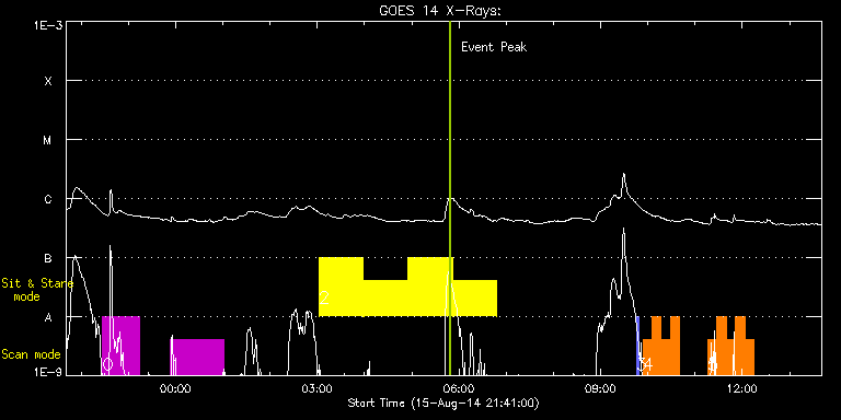 EIS Observation timeline overlay to GOES-Xray curve Code 1" 2" 40" 266" EIS Observations list for this event: STUDY ACRONYM ID DATE OBSERVED DESCRIPTION NOAA# TARGET 0 HPW021_VEL_120x512v2 | 42172 | 2014/08/15 22:27:32 | Active region 12139. Scan. | | Active Region TIMELINE ID DATE OBSERVED FITS FILE XCEN (+W/-E) YCEN (+N/-S) DUR ----------------------------------------------------------------------------------------------------------------- 42172 | 2014/08/15 22:27:32.000 | eis_l0_20140815_222732.fits.gz | -306.15 | 91.67 | 46m53s 1 HPW022_VEL_480x512v1 | 42173 | 2014/08/15 23:53:12 | Active region 12139. Large scan. | 2139 | Active Region TIMELINE ID DATE OBSERVED FITS FILE XCEN (+W/-E) YCEN (+N/-S) DUR ----------------------------------------------------------------------------------------------------------------- 42173 | 2014/08/15 23:53:12.000 | eis_l0_20140815_235312.fits.gz | -337.11 | 91.21 | 1h7m38s 2 Flare266_Hunter01 | 42179 | 2014/08/16 03:02:19 | Flare hunt | | Flare TIMELINE ID DATE OBSERVED FITS FILE XCEN (+W/-E) YCEN (+N/-S) DUR ----------------------------------------------------------------------------------------------------------------- 42179 | 2014/08/16 03:02:19.000 | eis_l0_20140816_030219.fits.gz | -10044.40 | -9967.20 | 55m49s 42179 | 2014/08/16 03:59:00.000 | eis_l0_20140816_035900.fits.gz | -10044.40 | -9967.20 | 55m49s 42179 | 2014/08/16 04:55:41.000 | eis_l0_20140816_045541.fits.gz | -10044.40 | -9967.20 | 55m49s 42179 | 2014/08/16 05:52:22.000 | eis_l0_20140816_055222.fits.gz | -1027.73 | 23.08 | 55m49s 3 PRY_slot_contextLITE | 42207 | 2014/08/16 09:45:27 | Large FOV scan context | 2139 | Active Region TIMELINE ID DATE OBSERVED FITS FILE XCEN (+W/-E) YCEN (+N/-S) DUR ----------------------------------------------------------------------------------------------------------------- 42207 | 2014/08/16 09:45:27.000 | eis_l0_20140816_094527.fits.gz | -233.75 | 92.58 | 2m56s 4 SI_LFOV_rscan | 42204 | 2014/08/16 09:53:33 | Large FOV scan | 2139 | Flare TIMELINE ID DATE OBSERVED FITS FILE XCEN (+W/-E) YCEN (+N/-S) DUR ----------------------------------------------------------------------------------------------------------------- 42204 | 2014/08/16 09:53:33.000 | eis_l0_20140816_095333.fits.gz | -224.34 | 92.43 | 11m39s 42204 | 2014/08/16 10:05:16.000 | eis_l0_20140816_100516.fits.gz | -222.72 | 92.35 | 11m39s 42204 | 2014/08/16 10:16:59.000 | eis_l0_20140816_101659.fits.gz | -220.94 | 92.43 | 11m39s 42204 | 2014/08/16 10:28:42.000 | eis_l0_20140816_102842.fits.gz | -219.16 | 92.43 | 11m39s 5 SI_LFOV_rscan | 42205 | 2014/08/16 11:16:12 | Large FOV scan | 2139 | Flare TIMELINE ID DATE OBSERVED FITS FILE XCEN (+W/-E) YCEN (+N/-S) DUR ----------------------------------------------------------------------------------------------------------------- 42205 | 2014/08/16 11:16:12.000 | eis_l0_20140816_111612.fits.gz | -212.44 | 92.20 | 11m39s 42205 | 2014/08/16 11:27:55.000 | eis_l0_20140816_112755.fits.gz | -210.59 | 92.20 | 11m39s 42205 | 2014/08/16 11:39:38.000 | eis_l0_20140816_113938.fits.gz | -208.89 | 92.04 | 11m39s 42205 | 2014/08/16 11:51:21.000 | eis_l0_20140816_115121.fits.gz | -207.34 | 91.97 | 11m40s 42205 | 2014/08/16 12:03:04.000 | eis_l0_20140816_120304.fits.gz | -205.41 | 91.97 | 11m39s : Check study information : Download file : View thumbnails For this event, also check for:
