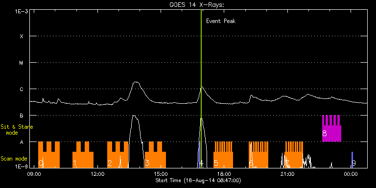 EIS Observation timeline overlay to GOES-Xray curve Code 1" 2" 40" 266" EIS Observations list for this event: STUDY ACRONYM ID DATE OBSERVED DESCRIPTION NOAA# TARGET 0 SI_LFOV_rscan | 42246 | 2014/08/18 09:12:39 | Large FOV scan | 2139 | Flare TIMELINE ID DATE OBSERVED FITS FILE XCEN (+W/-E) YCEN (+N/-S) DUR ----------------------------------------------------------------------------------------------------------------- 42246 | 2014/08/18 09:12:39.000 | eis_l0_20140818_091239.fits.gz | 196.20 | 90.88 | 11m40s 42246 | 2014/08/18 09:24:22.000 | eis_l0_20140818_092422.fits.gz | 197.90 | 90.73 | 11m39s 42246 | 2014/08/18 09:36:05.000 | eis_l0_20140818_093605.fits.gz | 199.60 | 90.81 | 11m39s 42246 | 2014/08/18 09:47:48.000 | eis_l0_20140818_094748.fits.gz | 201.30 | 90.81 | 11m40s 42246 | 2014/08/18 09:59:31.000 | eis_l0_20140818_095931.fits.gz | 203.00 | 90.81 | 11m40s 1 SI_LFOV_rscan | 42247 | 2014/08/18 10:48:58 | Large FOV scan | 2139 | Flare TIMELINE ID DATE OBSERVED FITS FILE XCEN (+W/-E) YCEN (+N/-S) DUR ----------------------------------------------------------------------------------------------------------------- 42247 | 2014/08/18 10:48:58.000 | eis_l0_20140818_104858.fits.gz | 210.26 | 91.04 | 11m40s 42247 | 2014/08/18 11:00:42.000 | eis_l0_20140818_110042.fits.gz | 211.88 | 91.04 | 11m39s 42247 | 2014/08/18 11:12:25.000 | eis_l0_20140818_111225.fits.gz | 213.58 | 91.27 | 11m40s 42247 | 2014/08/18 11:24:08.000 | eis_l0_20140818_112408.fits.gz | 215.28 | 91.19 | 11m39s 42247 | 2014/08/18 11:35:51.000 | eis_l0_20140818_113551.fits.gz | 217.05 | 91.35 | 11m39s 2 SI_LFOV_rscan | 42249 | 2014/08/18 12:28:29 | Large FOV scan | 2139 | Flare TIMELINE ID DATE OBSERVED FITS FILE XCEN (+W/-E) YCEN (+N/-S) DUR ----------------------------------------------------------------------------------------------------------------- 42249 | 2014/08/18 12:28:29.000 | eis_l0_20140818_122829.fits.gz | 224.62 | 91.58 | 11m39s 42249 | 2014/08/18 12:40:12.000 | eis_l0_20140818_124012.fits.gz | 226.40 | 91.50 | 11m40s 42249 | 2014/08/18 12:51:55.000 | eis_l0_20140818_125155.fits.gz | 228.02 | 91.42 | 11m40s 42249 | 2014/08/18 13:03:38.000 | eis_l0_20140818_130338.fits.gz | 229.72 | 91.66 | 11m40s 42249 | 2014/08/18 13:15:22.000 | eis_l0_20140818_131522.fits.gz | 231.42 | 91.58 | 11m39s 3 SI_LFOV_rscan | 42251 | 2014/08/18 14:15:12 | Large FOV scan | 2139 | Flare TIMELINE ID DATE OBSERVED FITS FILE XCEN (+W/-E) YCEN (+N/-S) DUR ----------------------------------------------------------------------------------------------------------------- 42251 | 2014/08/18 14:15:12.000 | eis_l0_20140818_141512.fits.gz | 240.07 | 91.81 | 11m40s 42251 | 2014/08/18 14:26:56.000 | eis_l0_20140818_142656.fits.gz | 241.77 | 91.89 | 11m39s 42251 | 2014/08/18 14:38:39.000 | eis_l0_20140818_143839.fits.gz | 243.47 | 92.04 | 11m39s 42251 | 2014/08/18 14:50:22.000 | eis_l0_20140818_145022.fits.gz | 245.17 | 92.04 | 11m39s 42251 | 2014/08/18 15:02:05.000 | eis_l0_20140818_150205.fits.gz | 246.79 | 92.04 | 11m40s 4 PRY_slot_contextLITE | 42188 | 2014/08/18 16:48:19 | Synop | 2139 | Active Region TIMELINE ID DATE OBSERVED FITS FILE XCEN (+W/-E) YCEN (+N/-S) DUR ----------------------------------------------------------------------------------------------------------------- 42188 | 2014/08/18 16:48:19.000 | eis_l0_20140818_164819.fits.gz | -15.29 | -0.50 | 2m57s 5 qub_hi-cad_flare_v1 | 42201 | 2014/08/18 17:30:32 | Magnetic flux rope | 2139 | Flare TIMELINE ID DATE OBSERVED FITS FILE XCEN (+W/-E) YCEN (+N/-S) DUR ----------------------------------------------------------------------------------------------------------------- 42201 | 2014/08/18 17:30:32.000 | eis_l0_20140818_173032.fits.gz | 274.53 | 92.82 | 3m10s 42201 | 2014/08/18 17:33:45.000 | eis_l0_20140818_173345.fits.gz | 274.99 | 92.82 | 3m9s 42201 | 2014/08/18 17:36:57.000 | eis_l0_20140818_173657.fits.gz | 275.53 | 92.89 | 3m10s 42201 | 2014/08/18 17:40:10.000 | eis_l0_20140818_174010.fits.gz | 276.00 | 92.74 | 3m9s 42201 | 2014/08/18 17:43:22.000 | eis_l0_20140818_174322.fits.gz | 276.30 | 92.66 | 3m10s 42201 | 2014/08/18 17:46:34.000 | eis_l0_20140818_174634.fits.gz | 276.77 | 92.97 | 3m10s 42201 | 2014/08/18 17:49:47.000 | eis_l0_20140818_174947.fits.gz | 277.31 | 92.74 | 3m9s 42201 | 2014/08/18 17:52:59.000 | eis_l0_20140818_175259.fits.gz | 277.85 | 92.82 | 3m10s 42201 | 2014/08/18 17:56:11.000 | eis_l0_20140818_175611.fits.gz | 278.24 | 92.97 | 3m10s 42201 | 2014/08/18 17:59:24.000 | eis_l0_20140818_175924.fits.gz | 278.62 | 92.82 | 3m10s 42201 | 2014/08/18 18:02:37.000 | eis_l0_20140818_180237.fits.gz | 279.16 | 92.89 | 3m9s 42201 | 2014/08/18 18:05:49.000 | eis_l0_20140818_180549.fits.gz | 279.63 | 92.89 | 3m10s 42201 | 2014/08/18 18:09:02.000 | eis_l0_20140818_180902.fits.gz | 280.01 | 92.89 | 3m9s 42201 | 2014/08/18 18:12:14.000 | eis_l0_20140818_181214.fits.gz | 280.55 | 92.82 | 3m10s 42201 | 2014/08/18 18:15:26.000 | eis_l0_20140818_181526.fits.gz | 280.94 | 92.97 | 3m10s 42201 | 2014/08/18 18:18:39.000 | eis_l0_20140818_181839.fits.gz | 281.40 | 92.89 | 3m10s 42201 | 2014/08/18 18:21:51.000 | eis_l0_20140818_182151.fits.gz | 281.87 | 93.05 | 3m10s 6 qub_hi-cad_flare_v1 | 42202 | 2014/08/18 19:09:39 | Magnetic flux rope | | Flare TIMELINE ID DATE OBSERVED FITS FILE XCEN (+W/-E) YCEN (+N/-S) DUR ----------------------------------------------------------------------------------------------------------------- 42202 | 2014/08/18 19:09:39.000 | eis_l0_20140818_190939.fits.gz | 288.66 | 93.28 | 3m10s 42202 | 2014/08/18 19:12:52.000 | eis_l0_20140818_191252.fits.gz | 289.13 | 93.36 | 3m10s 42202 | 2014/08/18 19:16:05.000 | eis_l0_20140818_191605.fits.gz | 289.59 | 93.28 | 3m9s 42202 | 2014/08/18 19:19:17.000 | eis_l0_20140818_191917.fits.gz | 290.05 | 93.28 | 3m10s 42202 | 2014/08/18 19:22:30.000 | eis_l0_20140818_192230.fits.gz | 290.52 | 93.36 | 3m9s 42202 | 2014/08/18 19:25:42.000 | eis_l0_20140818_192542.fits.gz | 290.98 | 93.28 | 3m10s 42202 | 2014/08/18 19:28:55.000 | 