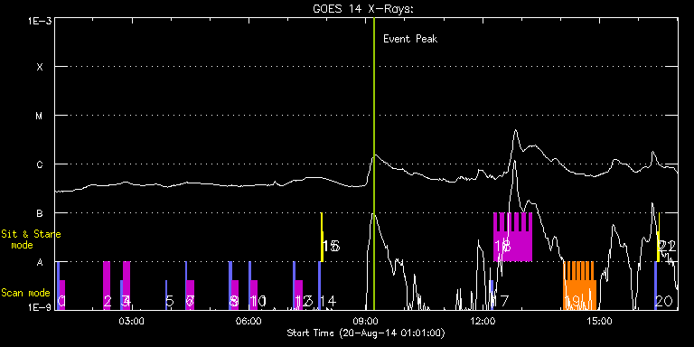 EIS Observation timeline overlay to GOES-Xray curve Code 1" 2" 40" 266" EIS Observations list for this event: STUDY ACRONYM ID DATE OBSERVED DESCRIPTION NOAA# TARGET 0 PRY_slot_contextLITE | 42304 | 2014/08/20 01:05:35 | HOP79 | 2141 | Active Region TIMELINE ID DATE OBSERVED FITS FILE XCEN (+W/-E) YCEN (+N/-S) DUR ----------------------------------------------------------------------------------------------------------------- 42304 | 2014/08/20 01:05:35.000 | eis_l0_20140820_010535.fits.gz | -33.59 | 247.48 | 2m56s 1 SK_DEEP_5x512_SLIT1 | 42305 | 2014/08/20 01:08:43 | HOP79 | | Quiet Sun TIMELINE ID DATE OBSERVED FITS FILE XCEN (+W/-E) YCEN (+N/-S) DUR ----------------------------------------------------------------------------------------------------------------- 42305 | 2014/08/20 01:08:43.000 | eis_l0_20140820_010843.fits.gz | -18.21 | 247.56 | 8m6s 2 SK_DEEP_5x512_SLIT1 | 42307 | 2014/08/20 02:16:13 | HOP79 | | Quiet Sun TIMELINE ID DATE OBSERVED FITS FILE XCEN (+W/-E) YCEN (+N/-S) DUR ----------------------------------------------------------------------------------------------------------------- 42307 | 2014/08/20 02:16:13.000 | eis_l0_20140820_021613.fits.gz | -18.29 | 347.44 | 10m7s 3 PRY_slot_contextLITE | 42308 | 2014/08/20 02:43:05 | HOP79 | | Active Region TIMELINE ID DATE OBSERVED FITS FILE XCEN (+W/-E) YCEN (+N/-S) DUR ----------------------------------------------------------------------------------------------------------------- 42308 | 2014/08/20 02:43:05.000 | eis_l0_20140820_024305.fits.gz | -33.51 | 447.55 | 2m56s 4 SK_DEEP_5x512_SLIT1 | 42309 | 2014/08/20 02:46:13 | HOP79 | | Quiet Sun TIMELINE ID DATE OBSERVED FITS FILE XCEN (+W/-E) YCEN (+N/-S) DUR ----------------------------------------------------------------------------------------------------------------- 42309 | 2014/08/20 02:46:13.000 | eis_l0_20140820_024613.fits.gz | -18.29 | 447.55 | 10m8s 5 PRY_slot_contextLITE | 42322 | 2014/08/20 03:51:35 | HOP79 | | Active Region TIMELINE ID DATE OBSERVED FITS FILE XCEN (+W/-E) YCEN (+N/-S) DUR ----------------------------------------------------------------------------------------------------------------- 42322 | 2014/08/20 03:51:35.000 | eis_l0_20140820_035135.fits.gz | -33.34 | 547.59 | 2m8s 6 PRY_slot_contextLITE | 42312 | 2014/08/20 04:22:10 | HOP79 | | Active Region TIMELINE ID DATE OBSERVED FITS FILE XCEN (+W/-E) YCEN (+N/-S) DUR ----------------------------------------------------------------------------------------------------------------- 42312 | 2014/08/20 04:22:10.000 | eis_l0_20140820_042210.fits.gz | -33.27 | 647.39 | 2m20s 7 SK_DEEP_5x512_SLIT1 | 42313 | 2014/08/20 04:24:42 | HOP79 | | Quiet Sun TIMELINE ID DATE OBSERVED FITS FILE XCEN (+W/-E) YCEN (+N/-S) DUR ----------------------------------------------------------------------------------------------------------------- 42313 | 2014/08/20 04:24:42.000 | eis_l0_20140820_042442.fits.gz | -18.29 | 647.31 | 10m8s 8 PRY_slot_contextLITE | 42314 | 2014/08/20 05:30:05 | HOP79 | | Active Region TIMELINE ID DATE OBSERVED FITS FILE XCEN (+W/-E) YCEN (+N/-S) DUR ----------------------------------------------------------------------------------------------------------------- 42314 | 2014/08/20 05:30:05.000 | eis_l0_20140820_053005.fits.gz | -33.34 | 747.66 | 2m56s 9 SK_DEEP_5x512_SLIT1 | 42315 | 2014/08/20 05:33:12 | HOP79 | | Quiet Sun TIMELINE ID DATE OBSERVED FITS FILE XCEN (+W/-E) YCEN (+N/-S) DUR ----------------------------------------------------------------------------------------------------------------- 42315 | 2014/08/20 05:33:12.000 | eis_l0_20140820_053312.fits.gz | -18.37 | 747.50 | 10m8s 10 PRY_slot_contextLITE | 42316 | 2014/08/20 06:00:04 | HOP79 | | Active Region TIMELINE ID DATE OBSERVED FITS FILE XCEN (+W/-E) YCEN (+N/-S) DUR ----------------------------------------------------------------------------------------------------------------- 42316 | 2014/08/20 06:00:04.000 | eis_l0_20140820_060004.fits.gz | -33.27 | 847.62 | 2m57s 11 SK_DEEP_5x512_SLIT1 | 42317 | 2014/08/20 06:03:12 | HOP79 | | Quiet Sun TIMELINE ID DATE OBSERVED FITS FILE XCEN (+W/-E) YCEN (+N/-S) DUR ----------------------------------------------------------------------------------------------------------------- 42317 | 2014/08/20 06:03:12.000 | eis_l0_20140820_060312.fits.gz | -18.29 | 847.54 | 10m8s 12 PRY_slot_contextLITE | 42318 | 2014/08/20 07:08:35 | HOP79 | | Active Region TIMELINE ID DATE OBSERVED FITS FILE XCEN (+W/-E) YCEN (+N/-S) DUR ----------------------------------------------------------------------------------------------------------------- 42318 | 2014/08/20 07:08:35.000 | eis_l0_20140820_070835.fits.gz | -33.34 | 947.73 | 2m56s 13 SK_DEEP_5x512_SLIT1 | 42319 | 2014/08/20 07:11:42 | HOP79 | | Quiet Sun TIMELINE ID DATE OBSERVED FITS FILE XCEN (+W/-E) YCEN (+N/-S) DUR ----------------------------------------------------------------------------------------------------------------- 42319 | 2014/08/20 07:11:42.000 | eis_l0_20140820_071142.fits.gz | -18.29 | 947.73 | 10m8s 14 PRY_slot_contextLITE | 42256 | 2014/08/20 07:47:34 | PRY_slot_contextLITE | 2141 | Active Region TIMELINE ID DATE OBSERVED FITS FILE XCEN (+W/-E) YCEN (+N/-S) DUR ----------------------------------------------------------------------------------------------------------------- 42256 | 2014/08/20 07:47:34.000 | eis_l0_20140820_074734.fits.gz | -31.11 | -2.50 | 2m56s 15 Alignment_266 | 42257 | 2014/08/20 07:50:49 | Alignment_266 | | Quiet Sun TIMELINE ID DATE OBSERVED FITS FILE XCEN (+W/-E) YCEN (+N/-S) DUR ----------------------------------------------------------------------------------------------------------------- 42257 | 2014/08/20 07:50:49.000 | eis_l0_20140820_075049.fits.gz | -148.71 | -2.42 | 1m22s 16 XRT_synop_AIA | 42258 | 2014/08/20 07:53:23 | xrt_SYNOP_AIA | | Quiet Sun TIMELINE ID DATE OBSERVED FITS FILE XCEN (+W/-E) YCEN (+N/-S) DUR -----------------------------------------------------------------------------------------------------
