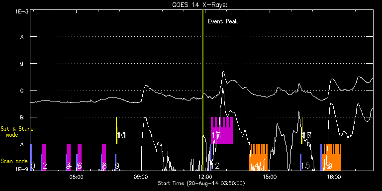 EIS Observation timeline overlay to GOES-Xray curve Code 1" 2" 40" 266" EIS Observations list for this event: STUDY ACRONYM ID DATE OBSERVED DESCRIPTION NOAA# TARGET 0 PRY_slot_contextLITE | 42322 | 2014/08/20 03:51:35 | HOP79 | | Active Region TIMELINE ID DATE OBSERVED FITS FILE XCEN (+W/-E) YCEN (+N/-S) DUR ----------------------------------------------------------------------------------------------------------------- 42322 | 2014/08/20 03:51:35.000 | eis_l0_20140820_035135.fits.gz | -33.34 | 547.59 | 2m8s 1 PRY_slot_contextLITE | 42312 | 2014/08/20 04:22:10 | HOP79 | | Active Region TIMELINE ID DATE OBSERVED FITS FILE XCEN (+W/-E) YCEN (+N/-S) DUR ----------------------------------------------------------------------------------------------------------------- 42312 | 2014/08/20 04:22:10.000 | eis_l0_20140820_042210.fits.gz | -33.27 | 647.39 | 2m20s 2 SK_DEEP_5x512_SLIT1 | 42313 | 2014/08/20 04:24:42 | HOP79 | | Quiet Sun TIMELINE ID DATE OBSERVED FITS FILE XCEN (+W/-E) YCEN (+N/-S) DUR ----------------------------------------------------------------------------------------------------------------- 42313 | 2014/08/20 04:24:42.000 | eis_l0_20140820_042442.fits.gz | -18.29 | 647.31 | 10m8s 3 PRY_slot_contextLITE | 42314 | 2014/08/20 05:30:05 | HOP79 | | Active Region TIMELINE ID DATE OBSERVED FITS FILE XCEN (+W/-E) YCEN (+N/-S) DUR ----------------------------------------------------------------------------------------------------------------- 42314 | 2014/08/20 05:30:05.000 | eis_l0_20140820_053005.fits.gz | -33.34 | 747.66 | 2m56s 4 SK_DEEP_5x512_SLIT1 | 42315 | 2014/08/20 05:33:12 | HOP79 | | Quiet Sun TIMELINE ID DATE OBSERVED FITS FILE XCEN (+W/-E) YCEN (+N/-S) DUR ----------------------------------------------------------------------------------------------------------------- 42315 | 2014/08/20 05:33:12.000 | eis_l0_20140820_053312.fits.gz | -18.37 | 747.50 | 10m8s 5 PRY_slot_contextLITE | 42316 | 2014/08/20 06:00:04 | HOP79 | | Active Region TIMELINE ID DATE OBSERVED FITS FILE XCEN (+W/-E) YCEN (+N/-S) DUR ----------------------------------------------------------------------------------------------------------------- 42316 | 2014/08/20 06:00:04.000 | eis_l0_20140820_060004.fits.gz | -33.27 | 847.62 | 2m57s 6 SK_DEEP_5x512_SLIT1 | 42317 | 2014/08/20 06:03:12 | HOP79 | | Quiet Sun TIMELINE ID DATE OBSERVED FITS FILE XCEN (+W/-E) YCEN (+N/-S) DUR ----------------------------------------------------------------------------------------------------------------- 42317 | 2014/08/20 06:03:12.000 | eis_l0_20140820_060312.fits.gz | -18.29 | 847.54 | 10m8s 7 PRY_slot_contextLITE | 42318 | 2014/08/20 07:08:35 | HOP79 | | Active Region TIMELINE ID DATE OBSERVED FITS FILE XCEN (+W/-E) YCEN (+N/-S) DUR ----------------------------------------------------------------------------------------------------------------- 42318 | 2014/08/20 07:08:35.000 | eis_l0_20140820_070835.fits.gz | -33.34 | 947.73 | 2m56s 8 SK_DEEP_5x512_SLIT1 | 42319 | 2014/08/20 07:11:42 | HOP79 | | Quiet Sun TIMELINE ID DATE OBSERVED FITS FILE XCEN (+W/-E) YCEN (+N/-S) DUR ----------------------------------------------------------------------------------------------------------------- 42319 | 2014/08/20 07:11:42.000 | eis_l0_20140820_071142.fits.gz | -18.29 | 947.73 | 10m8s 9 PRY_slot_contextLITE | 42256 | 2014/08/20 07:47:34 | PRY_slot_contextLITE | 2141 | Active Region TIMELINE ID DATE OBSERVED FITS FILE XCEN (+W/-E) YCEN (+N/-S) DUR ----------------------------------------------------------------------------------------------------------------- 42256 | 2014/08/20 07:47:34.000 | eis_l0_20140820_074734.fits.gz | -31.11 | -2.50 | 2m56s 10 Alignment_266 | 42257 | 2014/08/20 07:50:49 | Alignment_266 | | Quiet Sun TIMELINE ID DATE OBSERVED FITS FILE XCEN (+W/-E) YCEN (+N/-S) DUR ----------------------------------------------------------------------------------------------------------------- 42257 | 2014/08/20 07:50:49.000 | eis_l0_20140820_075049.fits.gz | -148.71 | -2.42 | 1m22s 11 XRT_synop_AIA | 42258 | 2014/08/20 07:53:23 | xrt_SYNOP_AIA | | Quiet Sun TIMELINE ID DATE OBSERVED FITS FILE XCEN (+W/-E) YCEN (+N/-S) DUR ----------------------------------------------------------------------------------------------------------------- 42258 | 2014/08/20 07:53:23.000 | eis_l0_20140820_075323.fits.gz | -148.79 | -2.27 | 10s 12 PRY_slot_contextLITE | 42266 | 2014/08/20 12:13:27 | southern coronal hole obs | | Active Region TIMELINE ID DATE OBSERVED FITS FILE XCEN (+W/-E) YCEN (+N/-S) DUR ----------------------------------------------------------------------------------------------------------------- 42266 | 2014/08/20 12:13:27.000 | eis_l0_20140820_121327.fits.gz | -471.89 | -766.09 | 2m57s 13 HPW023_FULLCCD_V2 | 42267 | 2014/08/20 12:16:35 | southern coronal hole obs | | Quiet Sun TIMELINE ID DATE OBSERVED FITS FILE XCEN (+W/-E) YCEN (+N/-S) DUR ----------------------------------------------------------------------------------------------------------------- 42267 | 2014/08/20 12:16:35.000 | eis_l0_20140820_121635.fits.gz | -456.66 | -766.17 | 5m1s 42267 | 2014/08/20 12:22:03.000 | eis_l0_20140820_122203.fits.gz | -456.58 | -766.02 | 5m 42267 | 2014/08/20 12:27:30.000 | eis_l0_20140820_122730.fits.gz | -456.66 | -766.02 | 5m 42267 | 2014/08/20 12:32:57.000 | eis_l0_20140820_123257.fits.gz | -456.66 | -766.17 | 5m 42267 | 2014/08/20 12:38:24.000 | eis_l0_20140820_123824.fits.gz | -456.66 | -765.94 | 5m1s 42267 | 2014/08/20 12:43:52.000 | eis_l0_20140820_124352.fits.gz | -456.66 | -766.09 | 5m 42267 | 2014/08/20 12:49:19.000 | eis_l0_20140820_124919.fits.gz | -456.66 | -766.09 | 5m 42267 | 2014/08/20 12:54:46.000 | eis_l0_20140820_125446.fits.gz | -456.66 | -766.02 | 5m1s 42267 | 2014/08/20 13:00:14.000 | eis_l0_20140820_130014.fits.gz | -456.58 | -765.78 | 5m 42267 | 2014/08/20 13:05:41.000 | eis_l0_20140820_130541.fits.gz | -456.66 | -766.09 | 5m 42267 | 2014/08/20 13:11:08.000 | eis_l0_20140820_131108.fits.gz | -456.66 | -766.02 | 5m 