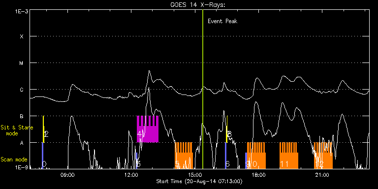 EIS Observation timeline overlay to GOES-Xray curve Code 1" 2" 40" 266" EIS Observations list for this event: STUDY ACRONYM ID DATE OBSERVED DESCRIPTION NOAA# TARGET 0 PRY_slot_contextLITE | 42256 | 2014/08/20 07:47:34 | PRY_slot_contextLITE | 2141 | Active Region TIMELINE ID DATE OBSERVED FITS FILE XCEN (+W/-E) YCEN (+N/-S) DUR ----------------------------------------------------------------------------------------------------------------- 42256 | 2014/08/20 07:47:34.000 | eis_l0_20140820_074734.fits.gz | -31.11 | -2.50 | 2m56s 1 Alignment_266 | 42257 | 2014/08/20 07:50:49 | Alignment_266 | | Quiet Sun TIMELINE ID DATE OBSERVED FITS FILE XCEN (+W/-E) YCEN (+N/-S) DUR ----------------------------------------------------------------------------------------------------------------- 42257 | 2014/08/20 07:50:49.000 | eis_l0_20140820_075049.fits.gz | -148.71 | -2.42 | 1m22s 2 XRT_synop_AIA | 42258 | 2014/08/20 07:53:23 | xrt_SYNOP_AIA | | Quiet Sun TIMELINE ID DATE OBSERVED FITS FILE XCEN (+W/-E) YCEN (+N/-S) DUR ----------------------------------------------------------------------------------------------------------------- 42258 | 2014/08/20 07:53:23.000 | eis_l0_20140820_075323.fits.gz | -148.79 | -2.27 | 10s 3 PRY_slot_contextLITE | 42266 | 2014/08/20 12:13:27 | southern coronal hole obs | | Active Region TIMELINE ID DATE OBSERVED FITS FILE XCEN (+W/-E) YCEN (+N/-S) DUR ----------------------------------------------------------------------------------------------------------------- 42266 | 2014/08/20 12:13:27.000 | eis_l0_20140820_121327.fits.gz | -471.89 | -766.09 | 2m57s 4 HPW023_FULLCCD_V2 | 42267 | 2014/08/20 12:16:35 | southern coronal hole obs | | Quiet Sun TIMELINE ID DATE OBSERVED FITS FILE XCEN (+W/-E) YCEN (+N/-S) DUR ----------------------------------------------------------------------------------------------------------------- 42267 | 2014/08/20 12:16:35.000 | eis_l0_20140820_121635.fits.gz | -456.66 | -766.17 | 5m1s 42267 | 2014/08/20 12:22:03.000 | eis_l0_20140820_122203.fits.gz | -456.58 | -766.02 | 5m 42267 | 2014/08/20 12:27:30.000 | eis_l0_20140820_122730.fits.gz | -456.66 | -766.02 | 5m 42267 | 2014/08/20 12:32:57.000 | eis_l0_20140820_123257.fits.gz | -456.66 | -766.17 | 5m 42267 | 2014/08/20 12:38:24.000 | eis_l0_20140820_123824.fits.gz | -456.66 | -765.94 | 5m1s 42267 | 2014/08/20 12:43:52.000 | eis_l0_20140820_124352.fits.gz | -456.66 | -766.09 | 5m 42267 | 2014/08/20 12:49:19.000 | eis_l0_20140820_124919.fits.gz | -456.66 | -766.09 | 5m 42267 | 2014/08/20 12:54:46.000 | eis_l0_20140820_125446.fits.gz | -456.66 | -766.02 | 5m1s 42267 | 2014/08/20 13:00:14.000 | eis_l0_20140820_130014.fits.gz | -456.58 | -765.78 | 5m 42267 | 2014/08/20 13:05:41.000 | eis_l0_20140820_130541.fits.gz | -456.66 | -766.09 | 5m 42267 | 2014/08/20 13:11:08.000 | eis_l0_20140820_131108.fits.gz | -456.66 | -766.02 | 5m 5 HH_Flare_raster_v6 | 42321 | 2014/08/20 14:03:55 | Flare study | | Flare TIMELINE ID DATE OBSERVED FITS FILE XCEN (+W/-E) YCEN (+N/-S) DUR ----------------------------------------------------------------------------------------------------------------- 42321 | 2014/08/20 14:03:55.000 | eis_l0_20140820_140355.fits.gz | 161.80 | 148.75 | 3m31s 42321 | 2014/08/20 14:07:29.000 | eis_l0_20140820_140729.fits.gz | 162.35 | 148.67 | 3m32s 42321 | 2014/08/20 14:11:04.000 | eis_l0_20140820_141104.fits.gz | 162.81 | 148.83 | 3m31s 42321 | 2014/08/20 14:14:38.000 | eis_l0_20140820_141438.fits.gz | 163.35 | 148.67 | 3m32s 42321 | 2014/08/20 14:18:13.000 | eis_l0_20140820_141813.fits.gz | 163.89 | 148.75 | 3m31s 42321 | 2014/08/20 14:21:47.000 | eis_l0_20140820_142147.fits.gz | 164.35 | 148.75 | 3m31s 42321 | 2014/08/20 14:25:21.000 | eis_l0_20140820_142521.fits.gz | 164.89 | 148.67 | 3m31s 42321 | 2014/08/20 14:28:55.000 | eis_l0_20140820_142855.fits.gz | 165.43 | 148.67 | 3m32s 42321 | 2014/08/20 14:32:30.000 | eis_l0_20140820_143230.fits.gz | 165.98 | 148.67 | 3m31s 42321 | 2014/08/20 14:36:04.000 | eis_l0_20140820_143604.fits.gz | 166.44 | 148.90 | 3m31s 42321 | 2014/08/20 14:39:38.000 | eis_l0_20140820_143938.fits.gz | 166.98 | 148.83 | 3m31s 42321 | 2014/08/20 14:43:12.000 | eis_l0_20140820_144312.fits.gz | 167.44 | 148.83 | 3m31s 42321 | 2014/08/20 14:46:46.000 | eis_l0_20140820_144646.fits.gz | 167.98 | 148.75 | 3m32s 42321 | 2014/08/20 14:50:21.000 | eis_l0_20140820_145021.fits.gz | 168.45 | 148.90 | 3m31s 6 PRY_slot_contextLITE | 42259 | 2014/08/20 16:25:21 | PRY_slot_contextLITE | 2141 | Active Region TIMELINE ID DATE OBSERVED FITS FILE XCEN (+W/-E) YCEN (+N/-S) DUR ----------------------------------------------------------------------------------------------------------------- 42259 | 2014/08/20 16:25:21.000 | eis_l0_20140820_162521.fits.gz | -19.21 | 32.42 | 2m56s 7 Alignment_266 | 42260 | 2014/08/20 16:28:35 | Alignment_266 | | Quiet Sun TIMELINE ID DATE OBSERVED FITS FILE XCEN (+W/-E) YCEN (+N/-S) DUR ----------------------------------------------------------------------------------------------------------------- 42260 | 2014/08/20 16:28:35.000 | eis_l0_20140820_162835.fits.gz | -136.48 | 32.42 | 1m22s 8 XRT_synop_AIA | 42261 | 2014/08/20 16:31:08 | xrt_SYNOP_AIA | | Quiet Sun TIMELINE ID DATE OBSERVED FITS FILE XCEN (+W/-E) YCEN (+N/-S) DUR ----------------------------------------------------------------------------------------------------------------- 42261 | 2014/08/20 16:31:08.000 | eis_l0_20140820_163108.fits.gz | -136.56 | 32.50 | 10s 9 PRY_slot_contextLITE | 42273 | 2014/08/20 17:22:56 | HOP260 | 2141 | Active Region TIMELINE ID DATE OBSERVED FITS FILE XCEN (+W/-E) YCEN (+N/-S) DUR ----------------------------------------------------------------------------------------------------------------- 42273 | 2014/08/20 17:22:56.000 | eis_l0_20140820_172256.fits.gz | 188.05 | 184.45 | 2m56s 10 qub_hi-cad_flare_v1 | 42270 | 2014/08/20 17:28:33 | HOP260 | | Flare TIMELINE ID DATE OBSERVED FITS FILE XCEN (+W/-E) YCEN (+N/-S) DUR -------------------------------------------------