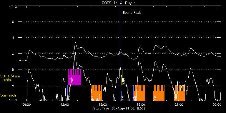 EIS Observation timeline overlay to GOES-Xray curve Code 1" 2" 40" 266" EIS Observations list for this event: STUDY ACRONYM ID DATE OBSERVED DESCRIPTION NOAA# TARGET 0 PRY_slot_contextLITE | 42266 | 2014/08/20 12:13:27 | southern coronal hole obs | | Active Region TIMELINE ID DATE OBSERVED FITS FILE XCEN (+W/-E) YCEN (+N/-S) DUR ----------------------------------------------------------------------------------------------------------------- 42266 | 2014/08/20 12:13:27.000 | eis_l0_20140820_121327.fits.gz | -471.89 | -766.09 | 2m57s 1 HPW023_FULLCCD_V2 | 42267 | 2014/08/20 12:16:35 | southern coronal hole obs | | Quiet Sun TIMELINE ID DATE OBSERVED FITS FILE XCEN (+W/-E) YCEN (+N/-S) DUR ----------------------------------------------------------------------------------------------------------------- 42267 | 2014/08/20 12:16:35.000 | eis_l0_20140820_121635.fits.gz | -456.66 | -766.17 | 5m1s 42267 | 2014/08/20 12:22:03.000 | eis_l0_20140820_122203.fits.gz | -456.58 | -766.02 | 5m 42267 | 2014/08/20 12:27:30.000 | eis_l0_20140820_122730.fits.gz | -456.66 | -766.02 | 5m 42267 | 2014/08/20 12:32:57.000 | eis_l0_20140820_123257.fits.gz | -456.66 | -766.17 | 5m 42267 | 2014/08/20 12:38:24.000 | eis_l0_20140820_123824.fits.gz | -456.66 | -765.94 | 5m1s 42267 | 2014/08/20 12:43:52.000 | eis_l0_20140820_124352.fits.gz | -456.66 | -766.09 | 5m 42267 | 2014/08/20 12:49:19.000 | eis_l0_20140820_124919.fits.gz | -456.66 | -766.09 | 5m 42267 | 2014/08/20 12:54:46.000 | eis_l0_20140820_125446.fits.gz | -456.66 | -766.02 | 5m1s 42267 | 2014/08/20 13:00:14.000 | eis_l0_20140820_130014.fits.gz | -456.58 | -765.78 | 5m 42267 | 2014/08/20 13:05:41.000 | eis_l0_20140820_130541.fits.gz | -456.66 | -766.09 | 5m 42267 | 2014/08/20 13:11:08.000 | eis_l0_20140820_131108.fits.gz | -456.66 | -766.02 | 5m 2 HH_Flare_raster_v6 | 42321 | 2014/08/20 14:03:55 | Flare study | | Flare TIMELINE ID DATE OBSERVED FITS FILE XCEN (+W/-E) YCEN (+N/-S) DUR ----------------------------------------------------------------------------------------------------------------- 42321 | 2014/08/20 14:03:55.000 | eis_l0_20140820_140355.fits.gz | 161.80 | 148.75 | 3m31s 42321 | 2014/08/20 14:07:29.000 | eis_l0_20140820_140729.fits.gz | 162.35 | 148.67 | 3m32s 42321 | 2014/08/20 14:11:04.000 | eis_l0_20140820_141104.fits.gz | 162.81 | 148.83 | 3m31s 42321 | 2014/08/20 14:14:38.000 | eis_l0_20140820_141438.fits.gz | 163.35 | 148.67 | 3m32s 42321 | 2014/08/20 14:18:13.000 | eis_l0_20140820_141813.fits.gz | 163.89 | 148.75 | 3m31s 42321 | 2014/08/20 14:21:47.000 | eis_l0_20140820_142147.fits.gz | 164.35 | 148.75 | 3m31s 42321 | 2014/08/20 14:25:21.000 | eis_l0_20140820_142521.fits.gz | 164.89 | 148.67 | 3m31s 42321 | 2014/08/20 14:28:55.000 | eis_l0_20140820_142855.fits.gz | 165.43 | 148.67 | 3m32s 42321 | 2014/08/20 14:32:30.000 | eis_l0_20140820_143230.fits.gz | 165.98 | 148.67 | 3m31s 42321 | 2014/08/20 14:36:04.000 | eis_l0_20140820_143604.fits.gz | 166.44 | 148.90 | 3m31s 42321 | 2014/08/20 14:39:38.000 | eis_l0_20140820_143938.fits.gz | 166.98 | 148.83 | 3m31s 42321 | 2014/08/20 14:43:12.000 | eis_l0_20140820_144312.fits.gz | 167.44 | 148.83 | 3m31s 42321 | 2014/08/20 14:46:46.000 | eis_l0_20140820_144646.fits.gz | 167.98 | 148.75 | 3m32s 42321 | 2014/08/20 14:50:21.000 | eis_l0_20140820_145021.fits.gz | 168.45 | 148.90 | 3m31s 3 PRY_slot_contextLITE | 42259 | 2014/08/20 16:25:21 | PRY_slot_contextLITE | 2141 | Active Region TIMELINE ID DATE OBSERVED FITS FILE XCEN (+W/-E) YCEN (+N/-S) DUR ----------------------------------------------------------------------------------------------------------------- 42259 | 2014/08/20 16:25:21.000 | eis_l0_20140820_162521.fits.gz | -19.21 | 32.42 | 2m56s 4 Alignment_266 | 42260 | 2014/08/20 16:28:35 | Alignment_266 | | Quiet Sun TIMELINE ID DATE OBSERVED FITS FILE XCEN (+W/-E) YCEN (+N/-S) DUR ----------------------------------------------------------------------------------------------------------------- 42260 | 2014/08/20 16:28:35.000 | eis_l0_20140820_162835.fits.gz | -136.48 | 32.42 | 1m22s 5 XRT_synop_AIA | 42261 | 2014/08/20 16:31:08 | xrt_SYNOP_AIA | | Quiet Sun TIMELINE ID DATE OBSERVED FITS FILE XCEN (+W/-E) YCEN (+N/-S) DUR ----------------------------------------------------------------------------------------------------------------- 42261 | 2014/08/20 16:31:08.000 | eis_l0_20140820_163108.fits.gz | -136.56 | 32.50 | 10s 6 PRY_slot_contextLITE | 42273 | 2014/08/20 17:22:56 | HOP260 | 2141 | Active Region TIMELINE ID DATE OBSERVED FITS FILE XCEN (+W/-E) YCEN (+N/-S) DUR ----------------------------------------------------------------------------------------------------------------- 42273 | 2014/08/20 17:22:56.000 | eis_l0_20140820_172256.fits.gz | 188.05 | 184.45 | 2m56s 7 qub_hi-cad_flare_v1 | 42270 | 2014/08/20 17:28:33 | HOP260 | | Flare TIMELINE ID DATE OBSERVED FITS FILE XCEN (+W/-E) YCEN (+N/-S) DUR ----------------------------------------------------------------------------------------------------------------- 42270 | 2014/08/20 17:28:33.000 | eis_l0_20140820_172833.fits.gz | 203.48 | 184.29 | 3m10s 42270 | 2014/08/20 17:31:46.000 | eis_l0_20140820_173146.fits.gz | 204.02 | 184.29 | 3m9s 42270 | 2014/08/20 17:34:58.000 | eis_l0_20140820_173458.fits.gz | 204.41 | 184.29 | 3m10s 42270 | 2014/08/20 17:38:10.000 | eis_l0_20140820_173810.fits.gz | 204.87 | 184.37 | 3m10s 42270 | 2014/08/20 17:41:22.000 | eis_l0_20140820_174122.fits.gz | 205.41 | 184.37 | 3m10s 42270 | 2014/08/20 17:44:35.000 | eis_l0_20140820_174435.fits.gz | 205.80 | 184.37 | 3m10s 42270 | 2014/08/20 17:47:47.000 | eis_l0_20140820_174747.fits.gz | 206.26 | 184.45 | 3m10s 42270 | 2014/08/20 17:51:00.000 | eis_l0_20140820_175100.fits.gz | 206.73 | 184.52 | 3m9s 42270 | 2014/08/20 17:54:12.000 | eis_l0_20140820_175412.fits.gz | 207.19 | 184.45 | 3m10s 42270 | 2014/08/20 17:57:25.000 | eis_l0_20140820_175725.fits.gz | 207.65 | 184.45 | 3m10s 42270 | 2014/08/20 18:00:38.000 | eis_l0_20140820_180038.fits.gz | 208.12 | 184.37 | 3m9s