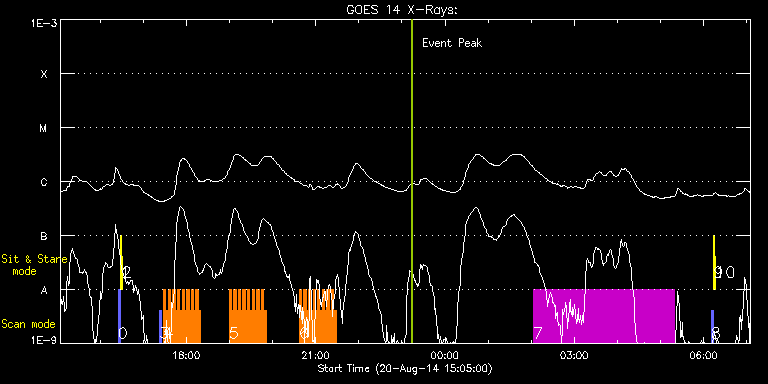 EIS Observation timeline overlay to GOES-Xray curve Code 1" 2" 40" 266" EIS Observations list for this event: STUDY ACRONYM ID DATE OBSERVED DESCRIPTION NOAA# TARGET 0 PRY_slot_contextLITE | 42259 | 2014/08/20 16:25:21 | PRY_slot_contextLITE | 2141 | Active Region TIMELINE ID DATE OBSERVED FITS FILE XCEN (+W/-E) YCEN (+N/-S) DUR ----------------------------------------------------------------------------------------------------------------- 42259 | 2014/08/20 16:25:21.000 | eis_l0_20140820_162521.fits.gz | -19.21 | 32.42 | 2m56s 1 Alignment_266 | 42260 | 2014/08/20 16:28:35 | Alignment_266 | | Quiet Sun TIMELINE ID DATE OBSERVED FITS FILE XCEN (+W/-E) YCEN (+N/-S) DUR ----------------------------------------------------------------------------------------------------------------- 42260 | 2014/08/20 16:28:35.000 | eis_l0_20140820_162835.fits.gz | -136.48 | 32.42 | 1m22s 2 XRT_synop_AIA | 42261 | 2014/08/20 16:31:08 | xrt_SYNOP_AIA | | Quiet Sun TIMELINE ID DATE OBSERVED FITS FILE XCEN (+W/-E) YCEN (+N/-S) DUR ----------------------------------------------------------------------------------------------------------------- 42261 | 2014/08/20 16:31:08.000 | eis_l0_20140820_163108.fits.gz | -136.56 | 32.50 | 10s 3 PRY_slot_contextLITE | 42273 | 2014/08/20 17:22:56 | HOP260 | 2141 | Active Region TIMELINE ID DATE OBSERVED FITS FILE XCEN (+W/-E) YCEN (+N/-S) DUR ----------------------------------------------------------------------------------------------------------------- 42273 | 2014/08/20 17:22:56.000 | eis_l0_20140820_172256.fits.gz | 188.05 | 184.45 | 2m56s 4 qub_hi-cad_flare_v1 | 42270 | 2014/08/20 17:28:33 | HOP260 | | Flare TIMELINE ID DATE OBSERVED FITS FILE XCEN (+W/-E) YCEN (+N/-S) DUR ----------------------------------------------------------------------------------------------------------------- 42270 | 2014/08/20 17:28:33.000 | eis_l0_20140820_172833.fits.gz | 203.48 | 184.29 | 3m10s 42270 | 2014/08/20 17:31:46.000 | eis_l0_20140820_173146.fits.gz | 204.02 | 184.29 | 3m9s 42270 | 2014/08/20 17:34:58.000 | eis_l0_20140820_173458.fits.gz | 204.41 | 184.29 | 3m10s 42270 | 2014/08/20 17:38:10.000 | eis_l0_20140820_173810.fits.gz | 204.87 | 184.37 | 3m10s 42270 | 2014/08/20 17:41:22.000 | eis_l0_20140820_174122.fits.gz | 205.41 | 184.37 | 3m10s 42270 | 2014/08/20 17:44:35.000 | eis_l0_20140820_174435.fits.gz | 205.80 | 184.37 | 3m10s 42270 | 2014/08/20 17:47:47.000 | eis_l0_20140820_174747.fits.gz | 206.26 | 184.45 | 3m10s 42270 | 2014/08/20 17:51:00.000 | eis_l0_20140820_175100.fits.gz | 206.73 | 184.52 | 3m9s 42270 | 2014/08/20 17:54:12.000 | eis_l0_20140820_175412.fits.gz | 207.19 | 184.45 | 3m10s 42270 | 2014/08/20 17:57:25.000 | eis_l0_20140820_175725.fits.gz | 207.65 | 184.45 | 3m10s 42270 | 2014/08/20 18:00:38.000 | eis_l0_20140820_180038.fits.gz | 208.12 | 184.37 | 3m9s 42270 | 2014/08/20 18:03:50.000 | eis_l0_20140820_180350.fits.gz | 208.58 | 184.60 | 3m10s 42270 | 2014/08/20 18:07:02.000 | eis_l0_20140820_180702.fits.gz | 209.04 | 184.37 | 3m10s 42270 | 2014/08/20 18:10:15.000 | eis_l0_20140820_181015.fits.gz | 209.51 | 184.52 | 3m10s 42270 | 2014/08/20 18:13:28.000 | eis_l0_20140820_181328.fits.gz | 209.97 | 184.45 | 3m10s 42270 | 2014/08/20 18:16:41.000 | eis_l0_20140820_181641.fits.gz | 210.51 | 184.45 | 3m9s 5 qub_hi-cad_flare_v1 | 42271 | 2014/08/20 18:59:39 | HOP260 | | Flare TIMELINE ID DATE OBSERVED FITS FILE XCEN (+W/-E) YCEN (+N/-S) DUR ----------------------------------------------------------------------------------------------------------------- 42271 | 2014/08/20 18:59:39.000 | eis_l0_20140820_185939.fits.gz | 216.54 | 184.68 | 3m10s 42271 | 2014/08/20 19:02:52.000 | eis_l0_20140820_190252.fits.gz | 217.00 | 184.76 | 3m10s 42271 | 2014/08/20 19:06:04.000 | eis_l0_20140820_190604.fits.gz | 217.46 | 184.68 | 3m10s 42271 | 2014/08/20 19:09:17.000 | eis_l0_20140820_190917.fits.gz | 217.85 | 184.83 | 3m9s 42271 | 2014/08/20 19:12:29.000 | eis_l0_20140820_191229.fits.gz | 218.39 | 184.76 | 3m10s 42271 | 2014/08/20 19:15:42.000 | eis_l0_20140820_191542.fits.gz | 218.78 | 184.76 | 3m9s 42271 | 2014/08/20 19:18:54.000 | eis_l0_20140820_191854.fits.gz | 219.16 | 184.76 | 3m9s 42271 | 2014/08/20 19:22:06.000 | eis_l0_20140820_192206.fits.gz | 219.71 | 184.68 | 3m10s 42271 | 2014/08/20 19:25:19.000 | eis_l0_20140820_192519.fits.gz | 220.17 | 184.68 | 3m10s 42271 | 2014/08/20 19:28:31.000 | eis_l0_20140820_192831.fits.gz | 220.55 | 184.91 | 3m10s 42271 | 2014/08/20 19:31:44.000 | eis_l0_20140820_193144.fits.gz | 221.02 | 184.60 | 3m10s 42271 | 2014/08/20 19:34:56.000 | eis_l0_20140820_193456.fits.gz | 221.64 | 184.76 | 3m10s 42271 | 2014/08/20 19:38:09.000 | eis_l0_20140820_193809.fits.gz | 222.02 | 184.91 | 3m10s 42271 | 2014/08/20 19:41:21.000 | eis_l0_20140820_194121.fits.gz | 222.41 | 184.83 | 3m10s 42271 | 2014/08/20 19:44:33.000 | eis_l0_20140820_194433.fits.gz | 222.87 | 184.91 | 3m10s 42271 | 2014/08/20 19:47:45.000 | eis_l0_20140820_194745.fits.gz | 223.41 | 185.06 | 3m11s 6 qub_hi-cad_flare_v1 | 42324 | 2014/08/20 20:37:09 | HOP260 | | Flare TIMELINE ID DATE OBSERVED FITS FILE XCEN (+W/-E) YCEN (+N/-S) DUR ----------------------------------------------------------------------------------------------------------------- 42324 | 2014/08/20 20:37:09.000 | eis_l0_20140820_203709.fits.gz | 230.62 | 185.14 | 3m10s 42324 | 2014/08/20 20:40:21.000 | eis_l0_20140820_204021.fits.gz | 231.08 | 185.06 | 3m10s 42324 | 2014/08/20 20:43:34.000 | eis_l0_20140820_204334.fits.gz | 231.54 | 184.99 | 3m9s 42324 | 2014/08/20 20:46:46.000 | eis_l0_20140820_204646.fits.gz | 231.93 | 185.14 | 3m9s 42324 | 2014/08/20 20:49:58.000 | eis_l0_20140820_204958.fits.gz | 232.39 | 184.99 | 3m9s 42324 | 2014/08/20 20:53:10.000 | eis_l0_20140820_205310.fits.gz | 232.86 | 185.06 | 3m10s 42324 | 2014/08/20 20:56:23.000 | eis_l0_20140820_205623.fits.gz | 233.32 | 185.06 | 3m9s 42324 | 2014/08/20 20:59:35.000 | eis_l0_20140820_205935.fits.gz | 233.71 | 185.22 | 3m9s 42324 | 2014/08/20 21:02:47.000 | ei