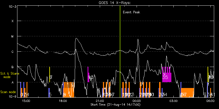 EIS Observation timeline overlay to GOES-Xray curve Code 1" 2" 40" 266" EIS Observations list for this event: STUDY ACRONYM ID DATE OBSERVED DESCRIPTION NOAA# TARGET 0 PRY_slot_contextLITE | 42352 | 2014/08/21 14:32:21 | HOP79 | | Active Region TIMELINE ID DATE OBSERVED FITS FILE XCEN (+W/-E) YCEN (+N/-S) DUR ----------------------------------------------------------------------------------------------------------------- 42352 | 2014/08/21 14:32:21.000 | eis_l0_20140821_143221.fits.gz | 677.22 | -294.42 | 2m56s 1 SK_DEEP_10x512_SLIT2 | 42353 | 2014/08/21 14:35:41 | HOP79 | | Quiet Sun TIMELINE ID DATE OBSERVED FITS FILE XCEN (+W/-E) YCEN (+N/-S) DUR ----------------------------------------------------------------------------------------------------------------- 42353 | 2014/08/21 14:35:41.000 | eis_l0_20140821_143541.fits.gz | 691.88 | -294.49 | 5m8s 2 PRY_slot_contextLITE | 42354 | 2014/08/21 14:47:21 | HOP79 | | Active Region TIMELINE ID DATE OBSERVED FITS FILE XCEN (+W/-E) YCEN (+N/-S) DUR ----------------------------------------------------------------------------------------------------------------- 42354 | 2014/08/21 14:47:21.000 | eis_l0_20140821_144721.fits.gz | 867.25 | -220.65 | 2m56s 3 SK_DEEP_10x512_SLIT2 | 42355 | 2014/08/21 14:50:41 | HOP79 | | Quiet Sun TIMELINE ID DATE OBSERVED FITS FILE XCEN (+W/-E) YCEN (+N/-S) DUR ----------------------------------------------------------------------------------------------------------------- 42355 | 2014/08/21 14:50:41.000 | eis_l0_20140821_145041.fits.gz | 881.66 | -220.34 | 5m8s 4 HH_Flare_raster_v6 | 42389 | 2014/08/21 15:02:14 | Flare study | | Flare TIMELINE ID DATE OBSERVED FITS FILE XCEN (+W/-E) YCEN (+N/-S) DUR ----------------------------------------------------------------------------------------------------------------- 42389 | 2014/08/21 15:02:14.000 | eis_l0_20140821_150214.fits.gz | -248.66 | 37.50 | 3m31s 5 PRY_slot_contextLITE | 42325 | 2014/08/21 16:50:40 | pry_slotcontextlite | | Active Region TIMELINE ID DATE OBSERVED FITS FILE XCEN (+W/-E) YCEN (+N/-S) DUR ----------------------------------------------------------------------------------------------------------------- 42325 | 2014/08/21 16:50:40.000 | eis_l0_20140821_165040.fits.gz | -30.77 | -1.42 | 2m57s 6 Alignment_266 | 42326 | 2014/08/21 16:53:55 | Alignment_266 | | Quiet Sun TIMELINE ID DATE OBSERVED FITS FILE XCEN (+W/-E) YCEN (+N/-S) DUR ----------------------------------------------------------------------------------------------------------------- 42326 | 2014/08/21 16:53:55.000 | eis_l0_20140821_165355.fits.gz | -148.21 | -1.50 | 1m22s 7 XRT_synop_AIA | 42394 | 2014/08/21 16:56:02 | XRT_synop_AIA | | Quiet Sun TIMELINE ID DATE OBSERVED FITS FILE XCEN (+W/-E) YCEN (+N/-S) DUR ----------------------------------------------------------------------------------------------------------------- 42394 | 2014/08/21 16:56:02.000 | eis_l0_20140821_165602.fits.gz | -148.21 | -1.58 | 10s 8 PRY_slot_contextLITE | 42385 | 2014/08/21 17:58:57 | HOP260 | 2146 | Active Region TIMELINE ID DATE OBSERVED FITS FILE XCEN (+W/-E) YCEN (+N/-S) DUR ----------------------------------------------------------------------------------------------------------------- 42385 | 2014/08/21 17:58:57.000 | eis_l0_20140821_175857.fits.gz | -292.16 | 51.42 | 2m56s 9 qub_hi-cad_flare_v1 | 42386 | 2014/08/21 18:02:18 | HOP260 | 2146 | Flare TIMELINE ID DATE OBSERVED FITS FILE XCEN (+W/-E) YCEN (+N/-S) DUR ----------------------------------------------------------------------------------------------------------------- 42386 | 2014/08/21 18:02:18.000 | eis_l0_20140821_180218.fits.gz | -386.96 | 81.50 | 3m10s 42386 | 2014/08/21 18:05:31.000 | eis_l0_20140821_180531.fits.gz | -386.49 | 81.42 | 3m10s 42386 | 2014/08/21 18:08:44.000 | eis_l0_20140821_180844.fits.gz | -386.11 | 81.42 | 3m9s 42386 | 2014/08/21 18:11:56.000 | eis_l0_20140821_181156.fits.gz | -385.64 | 81.34 | 3m9s 42386 | 2014/08/21 18:15:08.000 | eis_l0_20140821_181508.fits.gz | -385.10 | 81.34 | 3m10s 42386 | 2014/08/21 18:18:21.000 | eis_l0_20140821_181821.fits.gz | -384.64 | 81.42 | 3m10s 42386 | 2014/08/21 18:21:33.000 | eis_l0_20140821_182133.fits.gz | -384.18 | 81.42 | 3m10s 42386 | 2014/08/21 18:24:46.000 | eis_l0_20140821_182446.fits.gz | -383.71 | 81.19 | 3m10s 42386 | 2014/08/21 18:27:59.000 | eis_l0_20140821_182759.fits.gz | -383.33 | 81.34 | 3m9s 42386 | 2014/08/21 18:31:11.000 | eis_l0_20140821_183111.fits.gz | -382.79 | 81.34 | 3m10s 42386 | 2014/08/21 18:34:24.000 | eis_l0_20140821_183424.fits.gz | -382.32 | 81.19 | 3m10s 42386 | 2014/08/21 18:37:36.000 | eis_l0_20140821_183736.fits.gz | -381.86 | 81.34 | 3m10s 42386 | 2014/08/21 18:40:49.000 | eis_l0_20140821_184049.fits.gz | -381.39 | 81.19 | 3m10s 42386 | 2014/08/21 18:44:02.000 | eis_l0_20140821_184402.fits.gz | -380.86 | 81.27 | 3m9s 42386 | 2014/08/21 18:47:14.000 | eis_l0_20140821_184714.fits.gz | -380.47 | 81.19 | 3m9s 42386 | 2014/08/21 18:50:26.000 | eis_l0_20140821_185026.fits.gz | -380.01 | 81.19 | 3m10s 10 regcal071 | 42395 | 2014/08/21 20:00:12 | Dark exposures, CCD bottom rows (100s | | Engineering TIMELINE ID DATE OBSERVED FITS FILE XCEN (+W/-E) YCEN (+N/-S) DUR ----------------------------------------------------------------------------------------------------------------- 42395 | 2014/08/21 20:00:12.000 | eis_l0_20140821_200012.fits.gz | -241.10 | -288.27 | 3m21s 11 regcal072 | 42396 | 2014/08/21 20:04:00 | Dark exposures, top CCD rows (100s exp | | Engineering TIMELINE ID DATE OBSERVED FITS FILE XCEN (+W/-E) YCEN (+N/-S) DUR ----------------------------------------------------------------------------------------------------------------- 42396 | 2014/08/21 20:04:00.000 | eis_l0_20140821_200400.fits.gz | -240.56 | 222.80 | 3m22s 12 PRY_slot_contextLITE | 42356 | 2014/08/21 21:11:51 | HOP79 | | Active Region TIMELINE ID DATE OBSERVED FITS FILE XCEN (+W/-E) YCEN (+N/-S) DUR --------------------------------------------------------------------------------------