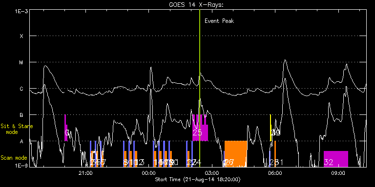 EIS Observation timeline overlay to GOES-Xray curve Code 1" 2" 40" 266" EIS Observations list for this event: STUDY ACRONYM ID DATE OBSERVED DESCRIPTION NOAA# TARGET 0 regcal071 | 42395 | 2014/08/21 20:00:12 | Dark exposures, CCD bottom rows (100s | | Engineering TIMELINE ID DATE OBSERVED FITS FILE XCEN (+W/-E) YCEN (+N/-S) DUR ----------------------------------------------------------------------------------------------------------------- 42395 | 2014/08/21 20:00:12.000 | eis_l0_20140821_200012.fits.gz | -241.10 | -288.27 | 3m21s 1 regcal072 | 42396 | 2014/08/21 20:04:00 | Dark exposures, top CCD rows (100s exp | | Engineering TIMELINE ID DATE OBSERVED FITS FILE XCEN (+W/-E) YCEN (+N/-S) DUR ----------------------------------------------------------------------------------------------------------------- 42396 | 2014/08/21 20:04:00.000 | eis_l0_20140821_200400.fits.gz | -240.56 | 222.80 | 3m22s 2 PRY_slot_contextLITE | 42356 | 2014/08/21 21:11:51 | HOP79 | | Active Region TIMELINE ID DATE OBSERVED FITS FILE XCEN (+W/-E) YCEN (+N/-S) DUR ----------------------------------------------------------------------------------------------------------------- 42356 | 2014/08/21 21:11:51.000 | eis_l0_20140821_211151.fits.gz | -9888.43 | -9929.20 | 2m57s 3 SK_DEEP_10x512_SLIT2 | 42357 | 2014/08/21 21:15:13 | HOP79 | | Quiet Sun TIMELINE ID DATE OBSERVED FITS FILE XCEN (+W/-E) YCEN (+N/-S) DUR ----------------------------------------------------------------------------------------------------------------- 42357 | 2014/08/21 21:15:13.000 | eis_l0_20140821_211513.fits.gz | -9873.69 | -9929.20 | 5m8s 4 PRY_slot_contextLITE | 42358 | 2014/08/21 21:26:51 | HOP79 | 2148 | Active Region TIMELINE ID DATE OBSERVED FITS FILE XCEN (+W/-E) YCEN (+N/-S) DUR ----------------------------------------------------------------------------------------------------------------- 42358 | 2014/08/21 21:26:51.000 | eis_l0_20140821_212651.fits.gz | -810.73 | -48.46 | 2m56s 5 SK_DEEP_10x512_SLIT2 | 42359 | 2014/08/21 21:30:12 | HOP79 | | Quiet Sun TIMELINE ID DATE OBSERVED FITS FILE XCEN (+W/-E) YCEN (+N/-S) DUR ----------------------------------------------------------------------------------------------------------------- 42359 | 2014/08/21 21:30:12.000 | eis_l0_20140821_213012.fits.gz | -796.24 | -48.54 | 5m8s 6 PRY_slot_contextLITE | 42360 | 2014/08/21 21:41:51 | HOP79 | 2147 | Active Region TIMELINE ID DATE OBSERVED FITS FILE XCEN (+W/-E) YCEN (+N/-S) DUR ----------------------------------------------------------------------------------------------------------------- 42360 | 2014/08/21 21:41:51.000 | eis_l0_20140821_214151.fits.gz | -628.90 | -71.56 | 2m56s 7 SK_DEEP_10x512_SLIT2 | 42361 | 2014/08/21 21:45:13 | HOP79 | | Quiet Sun TIMELINE ID DATE OBSERVED FITS FILE XCEN (+W/-E) YCEN (+N/-S) DUR ----------------------------------------------------------------------------------------------------------------- 42361 | 2014/08/21 21:45:13.000 | eis_l0_20140821_214513.fits.gz | -614.34 | -71.56 | 5m8s 8 PRY_slot_contextLITE | 42362 | 2014/08/21 22:46:51 | HOP79 | 2146 | Active Region TIMELINE ID DATE OBSERVED FITS FILE XCEN (+W/-E) YCEN (+N/-S) DUR ----------------------------------------------------------------------------------------------------------------- 42362 | 2014/08/21 22:46:51.000 | eis_l0_20140821_224651.fits.gz | -442.72 | -85.69 | 2m56s 9 SK_DEEP_10x512_SLIT2 | 42363 | 2014/08/21 22:50:13 | HOP79 | | Quiet Sun TIMELINE ID DATE OBSERVED FITS FILE XCEN (+W/-E) YCEN (+N/-S) DUR ----------------------------------------------------------------------------------------------------------------- 42363 | 2014/08/21 22:50:13.000 | eis_l0_20140821_225013.fits.gz | -428.38 | -85.54 | 5m7s 10 PRY_slot_contextLITE | 42364 | 2014/08/21 23:01:51 | HOP79 | 2146 | Active Region TIMELINE ID DATE OBSERVED FITS FILE XCEN (+W/-E) YCEN (+N/-S) DUR ----------------------------------------------------------------------------------------------------------------- 42364 | 2014/08/21 23:01:51.000 | eis_l0_20140821_230151.fits.gz | -253.77 | -92.57 | 2m56s 11 SK_DEEP_10x512_SLIT2 | 42365 | 2014/08/21 23:05:12 | HOP79 | | Quiet Sun TIMELINE ID DATE OBSERVED FITS FILE XCEN (+W/-E) YCEN (+N/-S) DUR ----------------------------------------------------------------------------------------------------------------- 42365 | 2014/08/21 23:05:12.000 | eis_l0_20140821_230512.fits.gz | -239.36 | -92.41 | 5m8s 12 PRY_slot_contextLITE | 42366 | 2014/08/21 23:16:51 | HOP79 | | Active Region TIMELINE ID DATE OBSERVED FITS FILE XCEN (+W/-E) YCEN (+N/-S) DUR ----------------------------------------------------------------------------------------------------------------- 42366 | 2014/08/21 23:16:51.000 | eis_l0_20140821_231651.fits.gz | -58.97 | -95.43 | 2m56s 13 SK_DEEP_10x512_SLIT2 | 42367 | 2014/08/21 23:20:41 | HOP79 | | Quiet Sun TIMELINE ID DATE OBSERVED FITS FILE XCEN (+W/-E) YCEN (+N/-S) DUR ----------------------------------------------------------------------------------------------------------------- 42367 | 2014/08/21 23:20:41.000 | eis_l0_20140821_232041.fits.gz | -44.23 | -95.27 | 5m7s 14 PRY_slot_contextLITE | 42368 | 2014/08/22 00:11:50 | HOP79 | | Active Region TIMELINE ID DATE OBSERVED FITS FILE XCEN (+W/-E) YCEN (+N/-S) DUR ----------------------------------------------------------------------------------------------------------------- 42368 | 2014/08/22 00:11:50.000 | eis_l0_20140822_001150.fits.gz | 168.15 | -92.49 | 2m56s 15 SK_DEEP_10x512_SLIT2 | 42369 | 2014/08/22 00:15:11 | HOP79 | | Quiet Sun TIMELINE ID DATE OBSERVED FITS FILE XCEN (+W/-E) YCEN (+N/-S) DUR ----------------------------------------------------------------------------------------------------------------- 42369 | 2014/08/22 00:15:11.000 | eis_l0_20140822_001511.fits.gz | 182.74 | -92.41 | 5m7s 16 PRY_slot_contextLITE | 42370 | 2014/08/22 00:26:50 | HOP79 | 2141 | Active Region TIMELINE ID DATE OBSERVED FITS FILE XCEN (+W/-E) YCEN (+N/-S) DUR ----------------------------------