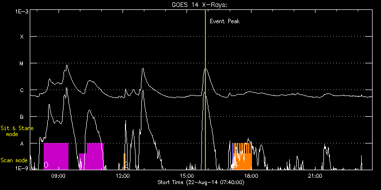 EIS Observation timeline overlay to GOES-Xray curve Code 1" 2" 40" 266" EIS Observations list for this event: STUDY ACRONYM ID DATE OBSERVED DESCRIPTION NOAA# TARGET 0 VHH_SlowAR_1h12_V2 | 42380 | 2014/08/22 08:18:26 | HOP262 | 2139 | Active Region TIMELINE ID DATE OBSERVED FITS FILE XCEN (+W/-E) YCEN (+N/-S) DUR ----------------------------------------------------------------------------------------------------------------- 42380 | 2014/08/22 08:18:26.000 | eis_l0_20140822_081826.fits.gz | 825.55 | 212.49 | 1h8m4s 1 VHH_SlowAR_1h12_V2 | 42393 | 2014/08/22 09:57:10 | HOP262 | 2139 | Active Region TIMELINE ID DATE OBSERVED FITS FILE XCEN (+W/-E) YCEN (+N/-S) DUR ----------------------------------------------------------------------------------------------------------------- 42393 | 2014/08/22 09:57:10.000 | eis_l0_20140822_095710.fits.gz | 825.70 | 212.41 | 28m29s 42393 | 2014/08/22 10:19:20.000 | eis_l0_20140822_101920.fits.gz | 825.78 | 212.33 | 45m55s 2 HH_Flare_raster_v6 | 42391 | 2014/08/22 12:03:27 | Flare study | | Flare TIMELINE ID DATE OBSERVED FITS FILE XCEN (+W/-E) YCEN (+N/-S) DUR ----------------------------------------------------------------------------------------------------------------- 42391 | 2014/08/22 12:03:27.000 | eis_l0_20140822_120327.fits.gz | -58.90 | 30.79 | 3m31s 3 PRY_slot_contextLITE | 42382 | 2014/08/22 17:07:21 | HOP260 | 2146 | Active Region TIMELINE ID DATE OBSERVED FITS FILE XCEN (+W/-E) YCEN (+N/-S) DUR ----------------------------------------------------------------------------------------------------------------- 42382 | 2014/08/22 17:07:21.000 | eis_l0_20140822_170721.fits.gz | -85.00 | 45.40 | 2m56s 4 qub_hi-cad_flare_v1 | 42383 | 2014/08/22 17:10:42 | HOP260 | | Flare TIMELINE ID DATE OBSERVED FITS FILE XCEN (+W/-E) YCEN (+N/-S) DUR ----------------------------------------------------------------------------------------------------------------- 42383 | 2014/08/22 17:10:42.000 | eis_l0_20140822_171042.fits.gz | -9.82 | 75.25 | 3m9s 42383 | 2014/08/22 17:13:54.000 | eis_l0_20140822_171354.fits.gz | -9.36 | 75.32 | 3m10s 42383 | 2014/08/22 17:17:06.000 | eis_l0_20140822_171706.fits.gz | -8.82 | 75.40 | 3m10s 42383 | 2014/08/22 17:20:19.000 | eis_l0_20140822_172019.fits.gz | -8.35 | 75.17 | 3m9s 42383 | 2014/08/22 17:23:31.000 | eis_l0_20140822_172331.fits.gz | -7.89 | 75.25 | 3m9s 42383 | 2014/08/22 17:26:43.000 | eis_l0_20140822_172643.fits.gz | -7.35 | 75.25 | 3m10s 42383 | 2014/08/22 17:29:56.000 | eis_l0_20140822_172956.fits.gz | -6.88 | 75.25 | 3m10s 42383 | 2014/08/22 17:33:08.000 | eis_l0_20140822_173308.fits.gz | -6.42 | 75.32 | 3m10s 42383 | 2014/08/22 17:36:21.000 | eis_l0_20140822_173621.fits.gz | -5.88 | 75.25 | 3m9s 42383 | 2014/08/22 17:39:33.000 | eis_l0_20140822_173933.fits.gz | -5.42 | 75.32 | 3m10s 42383 | 2014/08/22 17:42:45.000 | eis_l0_20140822_174245.fits.gz | -4.88 | 75.17 | 3m10s 42383 | 2014/08/22 17:45:58.000 | eis_l0_20140822_174558.fits.gz | -4.41 | 75.25 | 3m10s 42383 | 2014/08/22 17:49:11.000 | eis_l0_20140822_174911.fits.gz | -4.03 | 75.25 | 3m10s 42383 | 2014/08/22 17:52:24.000 | eis_l0_20140822_175224.fits.gz | -3.56 | 75.25 | 3m9s 42383 | 2014/08/22 17:55:36.000 | eis_l0_20140822_175536.fits.gz | -3.10 | 75.17 | 3m10s 42383 | 2014/08/22 17:58:49.000 | eis_l0_20140822_175849.fits.gz | -2.48 | 75.32 | 3m10s : Check study information : Download file : View thumbnails For this event, also check for: