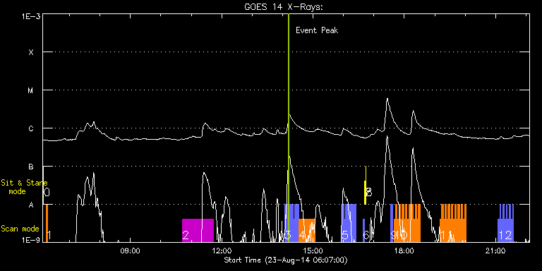 EIS Observation timeline overlay to GOES-Xray curve Code 1" 2" 40" 266" EIS Observations list for this event: STUDY ACRONYM ID DATE OBSERVED DESCRIPTION NOAA# TARGET 0 XRT_synop_AIA | 42333 | 2014/08/23 06:08:41 | XRT_synop_AIA | 2147 | Quiet Sun TIMELINE ID DATE OBSERVED FITS FILE XCEN (+W/-E) YCEN (+N/-S) DUR ----------------------------------------------------------------------------------------------------------------- 42333 | 2014/08/23 06:08:41.000 | eis_l0_20140823_060841.fits.gz | -148.46 | -2.42 | 10s 1 HH_Flare_raster_v6 | 42392 | 2014/08/23 06:13:20 | Flare study | 2146 | Flare TIMELINE ID DATE OBSERVED FITS FILE XCEN (+W/-E) YCEN (+N/-S) DUR ----------------------------------------------------------------------------------------------------------------- 42392 | 2014/08/23 06:13:20.000 | eis_l0_20140823_061320.fits.gz | 106.72 | 39.78 | 3m31s 2 HPW021_VEL_120x512v1 | 42426 | 2014/08/23 10:42:27 | flare study | 2149 | Active Region TIMELINE ID DATE OBSERVED FITS FILE XCEN (+W/-E) YCEN (+N/-S) DUR ----------------------------------------------------------------------------------------------------------------- 42426 | 2014/08/23 10:42:27.000 | eis_l0_20140823_104227.fits.gz | -820.53 | 97.38 | 1h1m53s 3 cme_slot_red_lkh | 42422 | 2014/08/23 14:03:34 | Filament evolution | | Quiet Sun TIMELINE ID DATE OBSERVED FITS FILE XCEN (+W/-E) YCEN (+N/-S) DUR ----------------------------------------------------------------------------------------------------------------- 42422 | 2014/08/23 14:03:34.000 | eis_l0_20140823_140334.fits.gz | -115.23 | 222.06 | 1m34s 42422 | 2014/08/23 14:05:13.000 | eis_l0_20140823_140513.fits.gz | -114.92 | 221.98 | 1m34s 42422 | 2014/08/23 14:06:52.000 | eis_l0_20140823_140652.fits.gz | -114.76 | 221.90 | 1m33s 42422 | 2014/08/23 14:08:30.000 | eis_l0_20140823_140830.fits.gz | -114.53 | 222.06 | 1m34s 42422 | 2014/08/23 14:10:09.000 | eis_l0_20140823_141009.fits.gz | -114.30 | 221.90 | 1m33s 42422 | 2014/08/23 14:11:47.000 | eis_l0_20140823_141147.fits.gz | -114.07 | 221.90 | 1m34s 42422 | 2014/08/23 14:13:25.000 | eis_l0_20140823_141325.fits.gz | -113.84 | 221.98 | 1m34s 42422 | 2014/08/23 14:15:04.000 | eis_l0_20140823_141504.fits.gz | -113.61 | 221.90 | 1m34s 42422 | 2014/08/23 14:16:43.000 | eis_l0_20140823_141643.fits.gz | -113.45 | 221.90 | 1m34s 42422 | 2014/08/23 14:18:22.000 | eis_l0_20140823_141822.fits.gz | -113.06 | 221.83 | 1m34s 42422 | 2014/08/23 14:20:00.000 | eis_l0_20140823_142000.fits.gz | -112.99 | 221.90 | 1m34s 42422 | 2014/08/23 14:21:39.000 | eis_l0_20140823_142139.fits.gz | -112.75 | 221.98 | 1m34s 42422 | 2014/08/23 14:23:18.000 | eis_l0_20140823_142318.fits.gz | -112.45 | 221.83 | 1m33s 42422 | 2014/08/23 14:24:56.000 | eis_l0_20140823_142456.fits.gz | -112.21 | 221.90 | 1m34s 42422 | 2014/08/23 14:26:34.000 | eis_l0_20140823_142634.fits.gz | -111.98 | 222.06 | 1m34s 42422 | 2014/08/23 14:28:13.000 | eis_l0_20140823_142813.fits.gz | -111.83 | 221.90 | 1m34s 42422 | 2014/08/23 14:29:52.000 | eis_l0_20140823_142952.fits.gz | -111.52 | 221.83 | 1m34s 4 cme_slit_red_lkh | 42423 | 2014/08/23 14:31:51 | Filament evolution | | Quiet Sun TIMELINE ID DATE OBSERVED FITS FILE XCEN (+W/-E) YCEN (+N/-S) DUR ----------------------------------------------------------------------------------------------------------------- 42423 | 2014/08/23 14:31:51.000 | eis_l0_20140823_143151.fits.gz | -93.30 | 221.98 | 32m25s 5 cme_slot_red_lkh | 42424 | 2014/08/23 15:56:50 | Filament evolution | | Quiet Sun TIMELINE ID DATE OBSERVED FITS FILE XCEN (+W/-E) YCEN (+N/-S) DUR ----------------------------------------------------------------------------------------------------------------- 42424 | 2014/08/23 15:56:50.000 | eis_l0_20140823_155650.fits.gz | -99.31 | 221.83 | 1m34s 42424 | 2014/08/23 15:58:29.000 | eis_l0_20140823_155829.fits.gz | -99.08 | 221.67 | 1m34s 42424 | 2014/08/23 16:00:07.000 | eis_l0_20140823_160007.fits.gz | -98.93 | 221.75 | 1m2s 42424 | 2014/08/23 16:01:46.000 | eis_l0_20140823_160146.fits.gz | -98.54 | 221.83 | 1m34s 42424 | 2014/08/23 16:03:25.000 | eis_l0_20140823_160325.fits.gz | -98.39 | 221.75 | 1m34s 42424 | 2014/08/23 16:05:03.000 | eis_l0_20140823_160503.fits.gz | -98.16 | 221.67 | 1m34s 42424 | 2014/08/23 16:06:42.000 | eis_l0_20140823_160642.fits.gz | -97.92 | 221.83 | 1m34s 42424 | 2014/08/23 16:08:20.000 | eis_l0_20140823_160820.fits.gz | -97.69 | 221.83 | 1m34s 42424 | 2014/08/23 16:09:59.000 | eis_l0_20140823_160959.fits.gz | -97.46 | 221.83 | 1m34s 42424 | 2014/08/23 16:11:37.000 | eis_l0_20140823_161137.fits.gz | -97.31 | 221.75 | 1m34s 42424 | 2014/08/23 16:13:16.000 | eis_l0_20140823_161316.fits.gz | -97.00 | 221.60 | 1m34s 42424 | 2014/08/23 16:14:54.000 | eis_l0_20140823_161454.fits.gz | -96.84 | 221.75 | 1m34s 42424 | 2014/08/23 16:16:33.000 | eis_l0_20140823_161633.fits.gz | -96.53 | 221.75 | 1m34s 42424 | 2014/08/23 16:18:12.000 | eis_l0_20140823_161812.fits.gz | -96.38 | 221.60 | 1m34s 42424 | 2014/08/23 16:19:50.000 | eis_l0_20140823_161950.fits.gz | -96.07 | 221.75 | 1m34s 42424 | 2014/08/23 16:21:29.000 | eis_l0_20140823_162129.fits.gz | -95.92 | 221.75 | 1m33s 42424 | 2014/08/23 16:23:07.000 | eis_l0_20140823_162307.fits.gz | -95.61 | 221.90 | 1m34s 6 PRY_slot_contextLITE | 42398 | 2014/08/23 16:38:14 | pry_slot_contextlite | 2146 | Active Region TIMELINE ID DATE OBSERVED FITS FILE XCEN (+W/-E) YCEN (+N/-S) DUR ----------------------------------------------------------------------------------------------------------------- 42398 | 2014/08/23 16:38:14.000 | eis_l0_20140823_163814.fits.gz | -31.19 | -2.50 | 2m56s 7 Alignment_266 | 42399 | 2014/08/23 16:41:29 | Alighment_266 | 2147 | Quiet Sun TIMELINE ID DATE OBSERVED FITS FILE XCEN (+W/-E) YCEN (+N/-S) DUR ----------------------------------------------------------------------------------------------------------------- 42399 | 2014/08/23 16:41:29.000 | eis_l0_20140823_164129.fits.gz | -148.46 | -2.42 | 1m22s 8 XRT_synop_AIA | 42400 | 2014/08/23 16:43:36 | XRT_syno