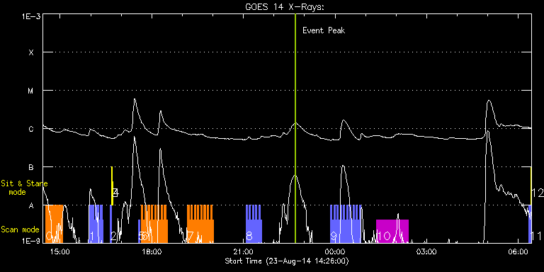 EIS Observation timeline overlay to GOES-Xray curve Code 1" 2" 40" 266" EIS Observations list for this event: STUDY ACRONYM ID DATE OBSERVED DESCRIPTION NOAA# TARGET 0 cme_slit_red_lkh | 42423 | 2014/08/23 14:31:51 | Filament evolution | | Quiet Sun TIMELINE ID DATE OBSERVED FITS FILE XCEN (+W/-E) YCEN (+N/-S) DUR ----------------------------------------------------------------------------------------------------------------- 42423 | 2014/08/23 14:31:51.000 | eis_l0_20140823_143151.fits.gz | -93.30 | 221.98 | 32m25s 1 cme_slot_red_lkh | 42424 | 2014/08/23 15:56:50 | Filament evolution | | Quiet Sun TIMELINE ID DATE OBSERVED FITS FILE XCEN (+W/-E) YCEN (+N/-S) DUR ----------------------------------------------------------------------------------------------------------------- 42424 | 2014/08/23 15:56:50.000 | eis_l0_20140823_155650.fits.gz | -99.31 | 221.83 | 1m34s 42424 | 2014/08/23 15:58:29.000 | eis_l0_20140823_155829.fits.gz | -99.08 | 221.67 | 1m34s 42424 | 2014/08/23 16:00:07.000 | eis_l0_20140823_160007.fits.gz | -98.93 | 221.75 | 1m2s 42424 | 2014/08/23 16:01:46.000 | eis_l0_20140823_160146.fits.gz | -98.54 | 221.83 | 1m34s 42424 | 2014/08/23 16:03:25.000 | eis_l0_20140823_160325.fits.gz | -98.39 | 221.75 | 1m34s 42424 | 2014/08/23 16:05:03.000 | eis_l0_20140823_160503.fits.gz | -98.16 | 221.67 | 1m34s 42424 | 2014/08/23 16:06:42.000 | eis_l0_20140823_160642.fits.gz | -97.92 | 221.83 | 1m34s 42424 | 2014/08/23 16:08:20.000 | eis_l0_20140823_160820.fits.gz | -97.69 | 221.83 | 1m34s 42424 | 2014/08/23 16:09:59.000 | eis_l0_20140823_160959.fits.gz | -97.46 | 221.83 | 1m34s 42424 | 2014/08/23 16:11:37.000 | eis_l0_20140823_161137.fits.gz | -97.31 | 221.75 | 1m34s 42424 | 2014/08/23 16:13:16.000 | eis_l0_20140823_161316.fits.gz | -97.00 | 221.60 | 1m34s 42424 | 2014/08/23 16:14:54.000 | eis_l0_20140823_161454.fits.gz | -96.84 | 221.75 | 1m34s 42424 | 2014/08/23 16:16:33.000 | eis_l0_20140823_161633.fits.gz | -96.53 | 221.75 | 1m34s 42424 | 2014/08/23 16:18:12.000 | eis_l0_20140823_161812.fits.gz | -96.38 | 221.60 | 1m34s 42424 | 2014/08/23 16:19:50.000 | eis_l0_20140823_161950.fits.gz | -96.07 | 221.75 | 1m34s 42424 | 2014/08/23 16:21:29.000 | eis_l0_20140823_162129.fits.gz | -95.92 | 221.75 | 1m33s 42424 | 2014/08/23 16:23:07.000 | eis_l0_20140823_162307.fits.gz | -95.61 | 221.90 | 1m34s 2 PRY_slot_contextLITE | 42398 | 2014/08/23 16:38:14 | pry_slot_contextlite | 2146 | Active Region TIMELINE ID DATE OBSERVED FITS FILE XCEN (+W/-E) YCEN (+N/-S) DUR ----------------------------------------------------------------------------------------------------------------- 42398 | 2014/08/23 16:38:14.000 | eis_l0_20140823_163814.fits.gz | -31.19 | -2.50 | 2m56s 3 Alignment_266 | 42399 | 2014/08/23 16:41:29 | Alighment_266 | 2147 | Quiet Sun TIMELINE ID DATE OBSERVED FITS FILE XCEN (+W/-E) YCEN (+N/-S) DUR ----------------------------------------------------------------------------------------------------------------- 42399 | 2014/08/23 16:41:29.000 | eis_l0_20140823_164129.fits.gz | -148.46 | -2.42 | 1m22s 4 XRT_synop_AIA | 42400 | 2014/08/23 16:43:36 | XRT_synop_AIA | 2147 | Quiet Sun TIMELINE ID DATE OBSERVED FITS FILE XCEN (+W/-E) YCEN (+N/-S) DUR ----------------------------------------------------------------------------------------------------------------- 42400 | 2014/08/23 16:43:36.000 | eis_l0_20140823_164336.fits.gz | -148.38 | -2.58 | 10s 5 PRY_slot_contextLITE | 42411 | 2014/08/23 17:33:27 | HOP260 | 2146 | Active Region TIMELINE ID DATE OBSERVED FITS FILE XCEN (+W/-E) YCEN (+N/-S) DUR ----------------------------------------------------------------------------------------------------------------- 42411 | 2014/08/23 17:33:27.000 | eis_l0_20140823_173327.fits.gz | 151.28 | 67.18 | 2m57s 6 qub_hi-cad_flare_v1 | 42412 | 2014/08/23 17:39:34 | HOP260 | | Flare TIMELINE ID DATE OBSERVED FITS FILE XCEN (+W/-E) YCEN (+N/-S) DUR ----------------------------------------------------------------------------------------------------------------- 42412 | 2014/08/23 17:39:34.000 | eis_l0_20140823_173934.fits.gz | 196.90 | 87.18 | 3m10s 42412 | 2014/08/23 17:42:47.000 | eis_l0_20140823_174247.fits.gz | 197.36 | 87.03 | 3m10s 42412 | 2014/08/23 17:45:59.000 | eis_l0_20140823_174559.fits.gz | 197.82 | 87.03 | 3m10s 42412 | 2014/08/23 17:49:12.000 | eis_l0_20140823_174912.fits.gz | 198.21 | 87.11 | 3m10s 42412 | 2014/08/23 17:52:24.000 | eis_l0_20140823_175224.fits.gz | 198.75 | 87.18 | 3m9s 42412 | 2014/08/23 17:55:36.000 | eis_l0_20140823_175536.fits.gz | 199.21 | 87.18 | 3m10s 42412 | 2014/08/23 17:58:49.000 | eis_l0_20140823_175849.fits.gz | 199.76 | 87.26 | 3m9s 42412 | 2014/08/23 18:02:01.000 | eis_l0_20140823_180201.fits.gz | 200.22 | 87.18 | 3m10s 42412 | 2014/08/23 18:05:13.000 | eis_l0_20140823_180513.fits.gz | 200.76 | 87.03 | 3m10s 42412 | 2014/08/23 18:08:26.000 | eis_l0_20140823_180826.fits.gz | 201.22 | 87.18 | 3m10s 42412 | 2014/08/23 18:11:38.000 | eis_l0_20140823_181138.fits.gz | 201.61 | 87.18 | 3m10s 42412 | 2014/08/23 18:14:51.000 | eis_l0_20140823_181451.fits.gz | 202.23 | 87.18 | 3m9s 42412 | 2014/08/23 18:18:03.000 | eis_l0_20140823_181803.fits.gz | 202.54 | 87.34 | 3m9s 42412 | 2014/08/23 18:21:15.000 | eis_l0_20140823_182115.fits.gz | 203.08 | 87.26 | 3m10s 42412 | 2014/08/23 18:24:27.000 | eis_l0_20140823_182427.fits.gz | 203.46 | 87.34 | 3m10s 42412 | 2014/08/23 18:27:40.000 | eis_l0_20140823_182740.fits.gz | 204.00 | 87.18 | 3m9s 7 qub_hi-cad_flare_v1 | 42413 | 2014/08/23 19:10:14 | HOP260 | | Flare TIMELINE ID DATE OBSERVED FITS FILE XCEN (+W/-E) YCEN (+N/-S) DUR ----------------------------------------------------------------------------------------------------------------- 42413 | 2014/08/23 19:10:14.000 | eis_l0_20140823_191014.fits.gz | 200.35 | 87.49 | 3m9s 42413 | 2014/08/23 19:13:26.000 | eis_l0_20140823_191326.fits.gz | 200.74 | 87.42 | 3m10s 42413 | 2014/08/23 19:16:38.000 | eis_l0_20140823_191638.fits.gz | 201.36 | 87.42 | 3m10s 42413 | 2014/08/23 19:19:51.000 | ei