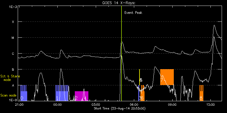 EIS Observation timeline overlay to GOES-Xray curve Code 1" 2" 40" 266" EIS Observations list for this event: STUDY ACRONYM ID DATE OBSERVED DESCRIPTION NOAA# TARGET 0 Alignment_modify_v2 | 42407 | 2014/08/23 21:04:53 | coalignment at N-limb | | Quiet Sun TIMELINE ID DATE OBSERVED FITS FILE XCEN (+W/-E) YCEN (+N/-S) DUR ----------------------------------------------------------------------------------------------------------------- 42407 | 2014/08/23 21:04:53.000 | eis_l0_20140823_210453.fits.gz | -13.62 | 977.62 | 2m34s 42407 | 2014/08/23 21:08:01.000 | eis_l0_20140823_210801.fits.gz | -13.62 | 977.70 | 2m34s 42407 | 2014/08/23 21:11:08.000 | eis_l0_20140823_211108.fits.gz | -13.62 | 977.55 | 2m34s 42407 | 2014/08/23 21:14:16.000 | eis_l0_20140823_211416.fits.gz | -13.54 | 977.55 | 2m34s 42407 | 2014/08/23 21:17:24.000 | eis_l0_20140823_211724.fits.gz | -13.54 | 977.55 | 2m33s 42407 | 2014/08/23 21:20:31.000 | eis_l0_20140823_212031.fits.gz | -13.47 | 977.62 | 2m34s 42407 | 2014/08/23 21:23:39.000 | eis_l0_20140823_212339.fits.gz | -13.47 | 977.47 | 2m34s 42407 | 2014/08/23 21:26:46.000 | eis_l0_20140823_212646.fits.gz | -13.54 | 977.39 | 2m34s 42407 | 2014/08/23 21:29:54.000 | eis_l0_20140823_212954.fits.gz | -13.54 | 977.47 | 2m34s 42407 | 2014/08/23 21:33:01.000 | eis_l0_20140823_213301.fits.gz | -13.54 | 977.55 | 2m34s 1 Alignment_modify_v2 | 42410 | 2014/08/23 23:51:15 | coalignment at E-limb | | Quiet Sun TIMELINE ID DATE OBSERVED FITS FILE XCEN (+W/-E) YCEN (+N/-S) DUR ----------------------------------------------------------------------------------------------------------------- 42410 | 2014/08/23 23:51:15.000 | eis_l0_20140823_235115.fits.gz | -9898.17 | -9931.20 | 2m34s 42410 | 2014/08/23 23:54:23.000 | eis_l0_20140823_235423.fits.gz | -9898.17 | -9931.20 | 2m34s 42410 | 2014/08/23 23:57:31.000 | eis_l0_20140823_235731.fits.gz | -9898.17 | -9931.20 | 2m34s 42410 | 2014/08/24 00:00:38.000 | eis_l0_20140824_000038.fits.gz | -9898.17 | -9931.20 | 2m34s 42410 | 2014/08/24 00:03:46.000 | eis_l0_20140824_000346.fits.gz | -9898.17 | -9931.20 | 2m34s 42410 | 2014/08/24 00:06:53.000 | eis_l0_20140824_000653.fits.gz | -9898.17 | -9931.20 | 2m34s 42410 | 2014/08/24 00:10:01.000 | eis_l0_20140824_001001.fits.gz | -9898.17 | -9931.20 | 2m34s 42410 | 2014/08/24 00:13:09.000 | eis_l0_20140824_001309.fits.gz | -9898.17 | -9931.20 | 2m33s 42410 | 2014/08/24 00:16:16.000 | eis_l0_20140824_001616.fits.gz | -9898.17 | -9931.20 | 2m34s 42410 | 2014/08/24 00:19:23.000 | eis_l0_20140824_001923.fits.gz | -9898.17 | -9931.20 | 2m34s 42410 | 2014/08/24 00:22:31.000 | eis_l0_20140824_002231.fits.gz | -9898.17 | -9931.20 | 2m34s 42410 | 2014/08/24 00:25:39.000 | eis_l0_20140824_002539.fits.gz | -9898.17 | -9931.20 | 2m33s 42410 | 2014/08/24 00:28:46.000 | eis_l0_20140824_002846.fits.gz | -9898.17 | -9931.20 | 2m34s 42410 | 2014/08/24 00:31:54.000 | eis_l0_20140824_003154.fits.gz | -9898.17 | -9931.20 | 2m34s 42410 | 2014/08/24 00:35:01.000 | eis_l0_20140824_003501.fits.gz | -9898.17 | -9931.20 | 2m34s 42410 | 2014/08/24 00:38:09.000 | eis_l0_20140824_003809.fits.gz | -9898.17 | -9931.20 | 2m34s 42410 | 2014/08/24 00:41:16.000 | eis_l0_20140824_004116.fits.gz | -9898.17 | -9931.20 | 2m34s 42410 | 2014/08/24 00:44:24.000 | eis_l0_20140824_004424.fits.gz | -9898.17 | -9931.20 | 2m34s 42410 | 2014/08/24 00:47:31.000 | eis_l0_20140824_004731.fits.gz | -9898.17 | -9931.20 | 2m34s 2 HPW021_VEL_120x512v1 | 42427 | 2014/08/24 01:21:50 | flare study | 2149 | Active Region TIMELINE ID DATE OBSERVED FITS FILE XCEN (+W/-E) YCEN (+N/-S) DUR ----------------------------------------------------------------------------------------------------------------- 42427 | 2014/08/24 01:21:50.000 | eis_l0_20140824_012150.fits.gz | -744.75 | 84.25 | 1h1m53s 3 PRY_slot_contextLITE | 42401 | 2014/08/24 06:21:04 | pry_slot_contextlite | 2148 | Active Region TIMELINE ID DATE OBSERVED FITS FILE XCEN (+W/-E) YCEN (+N/-S) DUR ----------------------------------------------------------------------------------------------------------------- 42401 | 2014/08/24 06:21:04.000 | eis_l0_20140824_062104.fits.gz | -31.26 | -3.35 | 2m56s 4 Alignment_266 | 42402 | 2014/08/24 06:24:18 | Alighment_266 | | Quiet Sun TIMELINE ID DATE OBSERVED FITS FILE XCEN (+W/-E) YCEN (+N/-S) DUR ----------------------------------------------------------------------------------------------------------------- 42402 | 2014/08/24 06:24:18.000 | eis_l0_20140824_062418.fits.gz | -148.79 | -3.35 | 1m22s 5 XRT_synop_AIA | 42403 | 2014/08/24 06:26:25 | XRT_synop_AIA | | Quiet Sun TIMELINE ID DATE OBSERVED FITS FILE XCEN (+W/-E) YCEN (+N/-S) DUR ----------------------------------------------------------------------------------------------------------------- 42403 | 2014/08/24 06:26:25.000 | eis_l0_20140824_062625.fits.gz | -148.71 | -3.50 | 11s 6 HH_Flare_raster_v6 | 42429 | 2014/08/24 06:30:50 | flare study | 2149 | Flare TIMELINE ID DATE OBSERVED FITS FILE XCEN (+W/-E) YCEN (+N/-S) DUR ----------------------------------------------------------------------------------------------------------------- 42429 | 2014/08/24 06:30:50.000 | eis_l0_20140824_063050.fits.gz | -695.39 | 88.92 | 3m31s 42429 | 2014/08/24 06:34:24.000 | eis_l0_20140824_063424.fits.gz | -695.01 | 88.69 | 3m31s 42429 | 2014/08/24 06:37:58.000 | eis_l0_20140824_063758.fits.gz | -694.70 | 88.69 | 3m31s 42429 | 2014/08/24 06:41:32.000 | eis_l0_20140824_064132.fits.gz | -694.23 | 88.61 | 3m32s 42429 | 2014/08/24 06:45:07.000 | eis_l0_20140824_064507.fits.gz | -693.92 | 88.46 | 3m32s 7 vhh_slowar_sas_1h6m | 42421 | 2014/08/24 08:03:41 | HOP262 | | Active Region TIMELINE ID DATE OBSERVED FITS FILE XCEN (+W/-E) YCEN (+N/-S) DUR ----------------------------------------------------------------------------------------------------------------- 42421 | 2014/08/24 08:03:41.000 | eis_l0_20140824_080341.fits.gz | 1065.41 | 282.65 | 1h2m48s 8 HH_Flare_raster_v6 | 42428 | 2014/08/24 11:08:13 | flare study | | Flare TIMELINE ID 