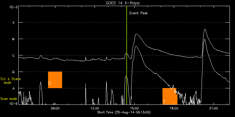 EIS Observation timeline overlay to GOES-Xray curve Code 1" 2" 40" 266" EIS Observations list for this event: STUDY ACRONYM ID DATE OBSERVED DESCRIPTION NOAA# TARGET 0 vhh_slowar_sas_1h6m | 42418 | 2014/08/25 08:27:49 | HOP262 | | Active Region TIMELINE ID DATE OBSERVED FITS FILE XCEN (+W/-E) YCEN (+N/-S) DUR ----------------------------------------------------------------------------------------------------------------- 42418 | 2014/08/25 08:27:49.000 | eis_l0_20140825_082749.fits.gz | -9987.26 | -10037.20 | 1h2m47s 1 tr_bright | 42425 | 2014/08/25 17:08:13 | HOP261 | | Quiet Sun TIMELINE ID DATE OBSERVED FITS FILE XCEN (+W/-E) YCEN (+N/-S) DUR ----------------------------------------------------------------------------------------------------------------- 42425 | 2014/08/25 17:08:13.000 | eis_l0_20140825_170813.fits.gz | 356.55 | 45.97 | 1h1m54s 42425 | 2014/08/25 18:10:12.000 | eis_l0_20140825_181012.fits.gz | 335.15 | 15.59 | 5m18s : Check study information : Download file : View thumbnails For this event, also check for:
