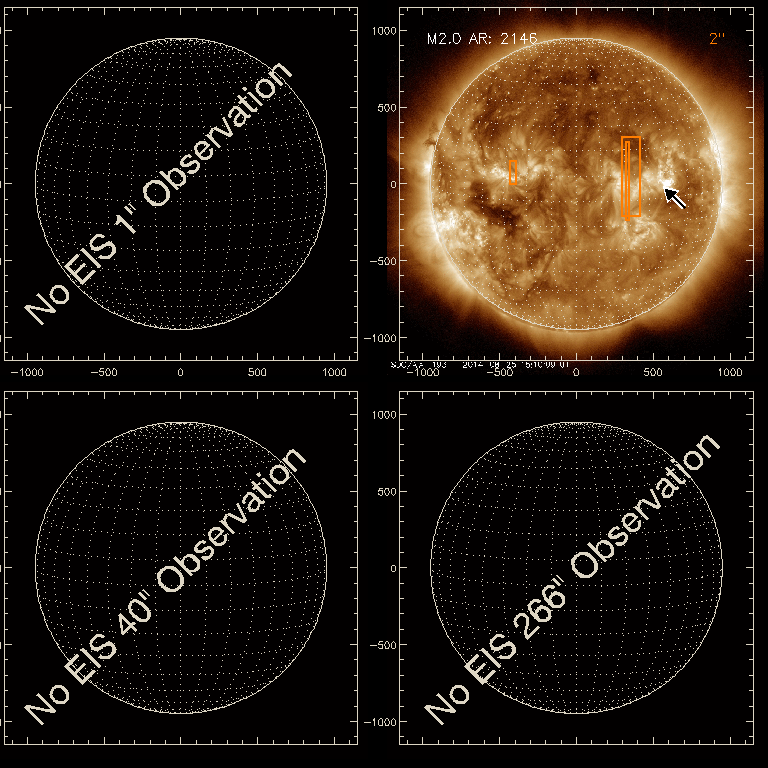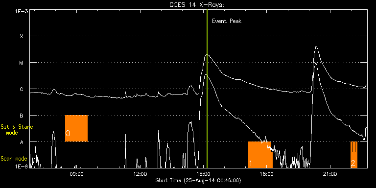 EIS Observation timeline overlay to GOES-Xray curve Code 1" 2" 40" 266" EIS Observations list for this event: STUDY ACRONYM ID DATE OBSERVED DESCRIPTION NOAA# TARGET 0 vhh_slowar_sas_1h6m | 42418 | 2014/08/25 08:27:49 | HOP262 | | Active Region TIMELINE ID DATE OBSERVED FITS FILE XCEN (+W/-E) YCEN (+N/-S) DUR ----------------------------------------------------------------------------------------------------------------- 42418 | 2014/08/25 08:27:49.000 | eis_l0_20140825_082749.fits.gz | -9987.26 | -10037.20 | 1h2m47s 1 tr_bright | 42425 | 2014/08/25 17:08:13 | HOP261 | | Quiet Sun TIMELINE ID DATE OBSERVED FITS FILE XCEN (+W/-E) YCEN (+N/-S) DUR ----------------------------------------------------------------------------------------------------------------- 42425 | 2014/08/25 17:08:13.000 | eis_l0_20140825_170813.fits.gz | 356.55 | 45.97 | 1h1m54s 42425 | 2014/08/25 18:10:12.000 | eis_l0_20140825_181012.fits.gz | 335.15 | 15.59 | 5m18s 2 HH_Flare_raster_v6 | 42431 | 2014/08/25 21:58:43 | flare study | | Flare TIMELINE ID DATE OBSERVED FITS FILE XCEN (+W/-E) YCEN (+N/-S) DUR ----------------------------------------------------------------------------------------------------------------- 42431 | 2014/08/25 21:58:43.000 | eis_l0_20140825_215843.fits.gz | -412.76 | 70.81 | 3m32s 42431 | 2014/08/25 22:02:18.000 | eis_l0_20140825_220218.fits.gz | -412.30 | 70.81 | 3m31s 42431 | 2014/08/25 22:05:52.000 | eis_l0_20140825_220552.fits.gz | -411.83 | 70.73 | 3m32s 42431 | 2014/08/25 22:09:26.000 | eis_l0_20140825_220926.fits.gz | -411.29 | 70.73 | 3m32s 42431 | 2014/08/25 22:13:01.000 | eis_l0_20140825_221301.fits.gz | -410.91 | 70.81 | 3m31s : Check study information : Download file : View thumbnails For this event, also check for: