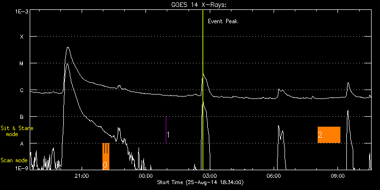 EIS Observation timeline overlay to GOES-Xray curve Code 1" 2" 40" 266" EIS Observations list for this event: STUDY ACRONYM ID DATE OBSERVED DESCRIPTION NOAA# TARGET 0 HH_Flare_raster_v6 | 42431 | 2014/08/25 21:58:43 | flare study | | Flare TIMELINE ID DATE OBSERVED FITS FILE XCEN (+W/-E) YCEN (+N/-S) DUR ----------------------------------------------------------------------------------------------------------------- 42431 | 2014/08/25 21:58:43.000 | eis_l0_20140825_215843.fits.gz | -412.76 | 70.81 | 3m32s 42431 | 2014/08/25 22:02:18.000 | eis_l0_20140825_220218.fits.gz | -412.30 | 70.81 | 3m31s 42431 | 2014/08/25 22:05:52.000 | eis_l0_20140825_220552.fits.gz | -411.83 | 70.73 | 3m32s 42431 | 2014/08/25 22:09:26.000 | eis_l0_20140825_220926.fits.gz | -411.29 | 70.73 | 3m32s 42431 | 2014/08/25 22:13:01.000 | eis_l0_20140825_221301.fits.gz | -410.91 | 70.81 | 3m31s 1 regcal077 | 42434 | 2014/08/26 00:56:42 | Flatfield, 2 exposures, led 80ms, full | | Engineering TIMELINE ID DATE OBSERVED FITS FILE XCEN (+W/-E) YCEN (+N/-S) DUR ----------------------------------------------------------------------------------------------------------------- 42434 | 2014/08/26 00:56:42.000 | eis_l0_20140826_005642.fits.gz | -376.36 | 3.42 | 4s 2 vhh_slowar_sas_1h6m | 42420 | 2014/08/26 08:03:14 | HOP262 | | Active Region TIMELINE ID DATE OBSERVED FITS FILE XCEN (+W/-E) YCEN (+N/-S) DUR ----------------------------------------------------------------------------------------------------------------- 42420 | 2014/08/26 08:03:14.000 | eis_l0_20140826_080314.fits.gz | -9977.53 | -10058.20 | 1h2m47s : Check study information : Download file : View thumbnails For this event, also check for: