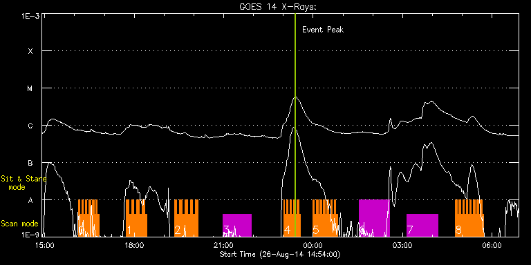 EIS Observation timeline overlay to GOES-Xray curve Code 1" 2" 40" 266" EIS Observations list for this event: STUDY ACRONYM ID DATE OBSERVED DESCRIPTION NOAA# TARGET 0 HH_Flare_raster_v6 | 42455 | 2014/08/26 16:07:13 | flare study | | Flare TIMELINE ID DATE OBSERVED FITS FILE XCEN (+W/-E) YCEN (+N/-S) DUR ----------------------------------------------------------------------------------------------------------------- 42455 | 2014/08/26 16:07:13.000 | eis_l0_20140826_160713.fits.gz | 737.67 | 41.68 | 3m32s 42455 | 2014/08/26 16:10:48.000 | eis_l0_20140826_161048.fits.gz | 737.90 | 41.68 | 3m31s 42455 | 2014/08/26 16:14:22.000 | eis_l0_20140826_161422.fits.gz | 738.29 | 41.68 | 3m32s 42455 | 2014/08/26 16:17:56.000 | eis_l0_20140826_161756.fits.gz | 738.60 | 41.83 | 3m31s 42455 | 2014/08/26 16:21:30.000 | eis_l0_20140826_162130.fits.gz | 738.91 | 41.83 | 3m31s 42455 | 2014/08/26 16:25:04.000 | eis_l0_20140826_162504.fits.gz | 739.21 | 41.91 | 3m31s 42455 | 2014/08/26 16:28:38.000 | eis_l0_20140826_162838.fits.gz | 739.52 | 42.06 | 3m31s 42455 | 2014/08/26 16:32:12.000 | eis_l0_20140826_163212.fits.gz | 739.99 | 42.06 | 3m31s 42455 | 2014/08/26 16:35:46.000 | eis_l0_20140826_163546.fits.gz | 740.29 | 42.14 | 3m32s 42455 | 2014/08/26 16:39:21.000 | eis_l0_20140826_163921.fits.gz | 740.68 | 42.14 | 3m31s 42455 | 2014/08/26 16:42:55.000 | eis_l0_20140826_164255.fits.gz | 740.99 | 42.30 | 2m38s 42455 | 2014/08/26 16:46:40.000 | eis_l0_20140826_164640.fits.gz | 741.38 | 42.14 | 3m21s 1 tr_bright_lo | 42444 | 2014/08/26 17:43:43 | HOP261 | | Quiet Sun TIMELINE ID DATE OBSERVED FITS FILE XCEN (+W/-E) YCEN (+N/-S) DUR ----------------------------------------------------------------------------------------------------------------- 42444 | 2014/08/26 17:43:43.000 | eis_l0_20140826_174343.fits.gz | 742.56 | 74.14 | 5m15s 42444 | 2014/08/26 17:49:01.000 | eis_l0_20140826_174901.fits.gz | 743.18 | 74.07 | 5m15s 42444 | 2014/08/26 17:54:19.000 | eis_l0_20140826_175419.fits.gz | 743.64 | 74.22 | 5m15s 42444 | 2014/08/26 17:59:37.000 | eis_l0_20140826_175937.fits.gz | 744.10 | 74.22 | 5m15s 42444 | 2014/08/26 18:04:55.000 | eis_l0_20140826_180455.fits.gz | 744.65 | 74.22 | 5m15s 42444 | 2014/08/26 18:10:13.000 | eis_l0_20140826_181013.fits.gz | 745.11 | 74.53 | 5m15s 42444 | 2014/08/26 18:15:31.000 | eis_l0_20140826_181531.fits.gz | 745.65 | 74.38 | 5m15s 42444 | 2014/08/26 18:20:49.000 | eis_l0_20140826_182049.fits.gz | 746.03 | 74.76 | 5m15s 2 tr_bright_lo | 42445 | 2014/08/26 19:20:43 | HOP261 | | Quiet Sun TIMELINE ID DATE OBSERVED FITS FILE XCEN (+W/-E) YCEN (+N/-S) DUR ----------------------------------------------------------------------------------------------------------------- 42445 | 2014/08/26 19:20:43.000 | eis_l0_20140826_192043.fits.gz | 751.85 | 75.46 | 5m16s 42445 | 2014/08/26 19:26:02.000 | eis_l0_20140826_192602.fits.gz | 752.31 | 75.46 | 5m15s 42445 | 2014/08/26 19:31:19.000 | eis_l0_20140826_193119.fits.gz | 752.77 | 75.77 | 5m15s 42445 | 2014/08/26 19:36:37.000 | eis_l0_20140826_193637.fits.gz | 753.31 | 75.77 | 5m15s 42445 | 2014/08/26 19:41:55.000 | eis_l0_20140826_194155.fits.gz | 753.78 | 75.77 | 5m15s 42445 | 2014/08/26 19:47:13.000 | eis_l0_20140826_194713.fits.gz | 754.24 | 75.92 | 5m15s 42445 | 2014/08/26 19:52:31.000 | eis_l0_20140826_195231.fits.gz | 754.63 | 75.92 | 5m15s 42445 | 2014/08/26 19:57:49.000 | eis_l0_20140826_195749.fits.gz | 755.17 | 76.15 | 5m15s 42445 | 2014/08/26 20:03:07.000 | eis_l0_20140826_200307.fits.gz | 755.71 | 76.15 | 5m15s 3 HPW021_VEL_120x512v1 | 42460 | 2014/08/26 20:58:27 | Flare study | | Active Region TIMELINE ID DATE OBSERVED FITS FILE XCEN (+W/-E) YCEN (+N/-S) DUR ----------------------------------------------------------------------------------------------------------------- 42460 | 2014/08/26 20:58:27.000 | eis_l0_20140826_205827.fits.gz | 748.58 | 42.08 | 57m45s 4 HH_Flare_raster_v6 | 42467 | 2014/08/26 23:01:35 | flare study | | Flare TIMELINE ID DATE OBSERVED FITS FILE XCEN (+W/-E) YCEN (+N/-S) DUR ----------------------------------------------------------------------------------------------------------------- 42467 | 2014/08/26 23:01:35.000 | eis_l0_20140826_230135.fits.gz | 758.99 | 43.86 | 52s 42467 | 2014/08/26 23:02:30.000 | eis_l0_20140826_230230.fits.gz | 759.14 | 43.86 | 3m31s 42467 | 2014/08/26 23:06:04.000 | eis_l0_20140826_230604.fits.gz | 759.30 | 44.01 | 3m31s 42467 | 2014/08/26 23:09:38.000 | eis_l0_20140826_230938.fits.gz | 759.68 | 43.78 | 3m32s 42467 | 2014/08/26 23:13:13.000 | eis_l0_20140826_231313.fits.gz | 759.99 | 44.01 | 3m32s 42467 | 2014/08/26 23:16:48.000 | eis_l0_20140826_231648.fits.gz | 760.38 | 44.09 | 3m31s 42467 | 2014/08/26 23:20:21.000 | eis_l0_20140826_232021.fits.gz | 760.61 | 44.17 | 3m32s 42467 | 2014/08/26 23:23:55.000 | eis_l0_20140826_232355.fits.gz | 760.92 | 44.17 | 3m32s 42467 | 2014/08/26 23:27:30.000 | eis_l0_20140826_232730.fits.gz | 761.23 | 44.32 | 3m32s 42467 | 2014/08/26 23:31:04.000 | eis_l0_20140826_233104.fits.gz | 761.46 | 44.32 | 3m32s 5 HH_Flare_raster_v6 | 42461 | 2014/08/26 23:59:13 | flare study | | Flare TIMELINE ID DATE OBSERVED FITS FILE XCEN (+W/-E) YCEN (+N/-S) DUR ----------------------------------------------------------------------------------------------------------------- 42461 | 2014/08/26 23:59:13.000 | eis_l0_20140826_235913.fits.gz | 763.93 | 44.86 | 3m32s 42461 | 2014/08/27 00:02:48.000 | eis_l0_20140827_000248.fits.gz | 764.24 | 44.78 | 3m31s 42461 | 2014/08/27 00:06:22.000 | eis_l0_20140827_000622.fits.gz | 764.55 | 44.86 | 3m31s 42461 | 2014/08/27 00:09:56.000 | eis_l0_20140827_000956.fits.gz | 764.86 | 44.94 | 3m31s 42461 | 2014/08/27 00:13:30.000 | eis_l0_20140827_001330.fits.gz | 765.17 | 44.94 | 3m32s 42461 | 2014/08/27 00:17:05.000 | eis_l0_20140827_001705.fits.gz | 765.40 | 45.02 | 3m31s 42461 | 2014/08/27 00:20:39.000 | eis_l0_20140827_002039.fits.gz | 765.71 | 45.02 | 3m32s 42461 | 2014/08/27 00:24:13.000 | eis_l0_20140827_002413.fits.gz | 766.09 | 45.