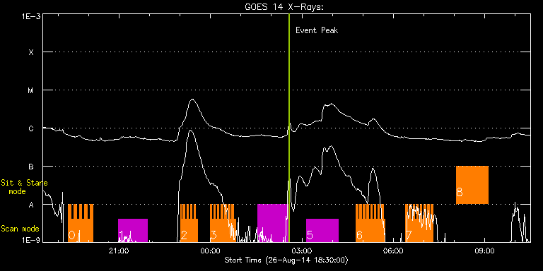EIS Observation timeline overlay to GOES-Xray curve Code 1" 2" 40" 266" EIS Observations list for this event: STUDY ACRONYM ID DATE OBSERVED DESCRIPTION NOAA# TARGET 0 tr_bright_lo | 42445 | 2014/08/26 19:20:43 | HOP261 | | Quiet Sun TIMELINE ID DATE OBSERVED FITS FILE XCEN (+W/-E) YCEN (+N/-S) DUR ----------------------------------------------------------------------------------------------------------------- 42445 | 2014/08/26 19:20:43.000 | eis_l0_20140826_192043.fits.gz | 751.85 | 75.46 | 5m16s 42445 | 2014/08/26 19:26:02.000 | eis_l0_20140826_192602.fits.gz | 752.31 | 75.46 | 5m15s 42445 | 2014/08/26 19:31:19.000 | eis_l0_20140826_193119.fits.gz | 752.77 | 75.77 | 5m15s 42445 | 2014/08/26 19:36:37.000 | eis_l0_20140826_193637.fits.gz | 753.31 | 75.77 | 5m15s 42445 | 2014/08/26 19:41:55.000 | eis_l0_20140826_194155.fits.gz | 753.78 | 75.77 | 5m15s 42445 | 2014/08/26 19:47:13.000 | eis_l0_20140826_194713.fits.gz | 754.24 | 75.92 | 5m15s 42445 | 2014/08/26 19:52:31.000 | eis_l0_20140826_195231.fits.gz | 754.63 | 75.92 | 5m15s 42445 | 2014/08/26 19:57:49.000 | eis_l0_20140826_195749.fits.gz | 755.17 | 76.15 | 5m15s 42445 | 2014/08/26 20:03:07.000 | eis_l0_20140826_200307.fits.gz | 755.71 | 76.15 | 5m15s 1 HPW021_VEL_120x512v1 | 42460 | 2014/08/26 20:58:27 | Flare study | | Active Region TIMELINE ID DATE OBSERVED FITS FILE XCEN (+W/-E) YCEN (+N/-S) DUR ----------------------------------------------------------------------------------------------------------------- 42460 | 2014/08/26 20:58:27.000 | eis_l0_20140826_205827.fits.gz | 748.58 | 42.08 | 57m45s 2 HH_Flare_raster_v6 | 42467 | 2014/08/26 23:01:35 | flare study | | Flare TIMELINE ID DATE OBSERVED FITS FILE XCEN (+W/-E) YCEN (+N/-S) DUR ----------------------------------------------------------------------------------------------------------------- 42467 | 2014/08/26 23:01:35.000 | eis_l0_20140826_230135.fits.gz | 758.99 | 43.86 | 52s 42467 | 2014/08/26 23:02:30.000 | eis_l0_20140826_230230.fits.gz | 759.14 | 43.86 | 3m31s 42467 | 2014/08/26 23:06:04.000 | eis_l0_20140826_230604.fits.gz | 759.30 | 44.01 | 3m31s 42467 | 2014/08/26 23:09:38.000 | eis_l0_20140826_230938.fits.gz | 759.68 | 43.78 | 3m32s 42467 | 2014/08/26 23:13:13.000 | eis_l0_20140826_231313.fits.gz | 759.99 | 44.01 | 3m32s 42467 | 2014/08/26 23:16:48.000 | eis_l0_20140826_231648.fits.gz | 760.38 | 44.09 | 3m31s 42467 | 2014/08/26 23:20:21.000 | eis_l0_20140826_232021.fits.gz | 760.61 | 44.17 | 3m32s 42467 | 2014/08/26 23:23:55.000 | eis_l0_20140826_232355.fits.gz | 760.92 | 44.17 | 3m32s 42467 | 2014/08/26 23:27:30.000 | eis_l0_20140826_232730.fits.gz | 761.23 | 44.32 | 3m32s 42467 | 2014/08/26 23:31:04.000 | eis_l0_20140826_233104.fits.gz | 761.46 | 44.32 | 3m32s 3 HH_Flare_raster_v6 | 42461 | 2014/08/26 23:59:13 | flare study | | Flare TIMELINE ID DATE OBSERVED FITS FILE XCEN (+W/-E) YCEN (+N/-S) DUR ----------------------------------------------------------------------------------------------------------------- 42461 | 2014/08/26 23:59:13.000 | eis_l0_20140826_235913.fits.gz | 763.93 | 44.86 | 3m32s 42461 | 2014/08/27 00:02:48.000 | eis_l0_20140827_000248.fits.gz | 764.24 | 44.78 | 3m31s 42461 | 2014/08/27 00:06:22.000 | eis_l0_20140827_000622.fits.gz | 764.55 | 44.86 | 3m31s 42461 | 2014/08/27 00:09:56.000 | eis_l0_20140827_000956.fits.gz | 764.86 | 44.94 | 3m31s 42461 | 2014/08/27 00:13:30.000 | eis_l0_20140827_001330.fits.gz | 765.17 | 44.94 | 3m32s 42461 | 2014/08/27 00:17:05.000 | eis_l0_20140827_001705.fits.gz | 765.40 | 45.02 | 3m31s 42461 | 2014/08/27 00:20:39.000 | eis_l0_20140827_002039.fits.gz | 765.71 | 45.02 | 3m32s 42461 | 2014/08/27 00:24:13.000 | eis_l0_20140827_002413.fits.gz | 766.09 | 45.09 | 3m32s 42461 | 2014/08/27 00:27:48.000 | eis_l0_20140827_002748.fits.gz | 766.33 | 45.25 | 3m31s 42461 | 2014/08/27 00:31:22.000 | eis_l0_20140827_003122.fits.gz | 766.71 | 45.25 | 3m32s 42461 | 2014/08/27 00:34:57.000 | eis_l0_20140827_003457.fits.gz | 767.02 | 45.32 | 3m32s 42461 | 2014/08/27 00:38:32.000 | eis_l0_20140827_003832.fits.gz | 767.33 | 45.32 | 3m31s 42461 | 2014/08/27 00:42:06.000 | eis_l0_20140827_004206.fits.gz | 767.56 | 45.40 | 3m31s 42461 | 2014/08/27 00:45:40.000 | eis_l0_20140827_004540.fits.gz | 767.87 | 45.40 | 3m32s 4 HPW021_VEL_120x512v1 | 42468 | 2014/08/27 01:32:26 | Flare study | 2146 | Active Region TIMELINE ID DATE OBSERVED FITS FILE XCEN (+W/-E) YCEN (+N/-S) DUR ----------------------------------------------------------------------------------------------------------------- 42468 | 2014/08/27 01:32:26.000 | eis_l0_20140827_013226.fits.gz | 772.62 | 46.02 | 1h1m53s 5 HPW021_VEL_120x512v1 | 42469 | 2014/08/27 03:09:10 | Flare study | 2146 | Active Region TIMELINE ID DATE OBSERVED FITS FILE XCEN (+W/-E) YCEN (+N/-S) DUR ----------------------------------------------------------------------------------------------------------------- 42469 | 2014/08/27 03:09:10.000 | eis_l0_20140827_030910.fits.gz | 780.50 | 47.72 | 1h1m53s 6 HH_Flare_raster_v6 | 42472 | 2014/08/27 04:46:26 | flare study | 2146 | Flare TIMELINE ID DATE OBSERVED FITS FILE XCEN (+W/-E) YCEN (+N/-S) DUR ----------------------------------------------------------------------------------------------------------------- 42472 | 2014/08/27 04:46:26.000 | eis_l0_20140827_044626.fits.gz | 787.97 | 49.11 | 3m32s 42472 | 2014/08/27 04:50:01.000 | eis_l0_20140827_045001.fits.gz | 788.13 | 49.19 | 3m31s 42472 | 2014/08/27 04:53:35.000 | eis_l0_20140827_045335.fits.gz | 788.44 | 49.34 | 3m32s 42472 | 2014/08/27 04:57:10.000 | eis_l0_20140827_045710.fits.gz | 788.75 | 49.42 | 3m31s 42472 | 2014/08/27 05:00:44.000 | eis_l0_20140827_050044.fits.gz | 789.05 | 49.26 | 3m32s 42472 | 2014/08/27 05:04:19.000 | eis_l0_20140827_050419.fits.gz | 789.29 | 49.50 | 3m31s 42472 | 2014/08/27 05:07:53.000 | eis_l0_20140827_050753.fits.gz | 789.67 | 49.50 | 3m31s 42472 | 2014/08/27 05:11:26.000 | eis_l0_20140827_051126.fits.gz | 789.90 | 49.57 | 3m32s 42472 | 2014/08/27 05:15:01.000 | eis_l0_2014082