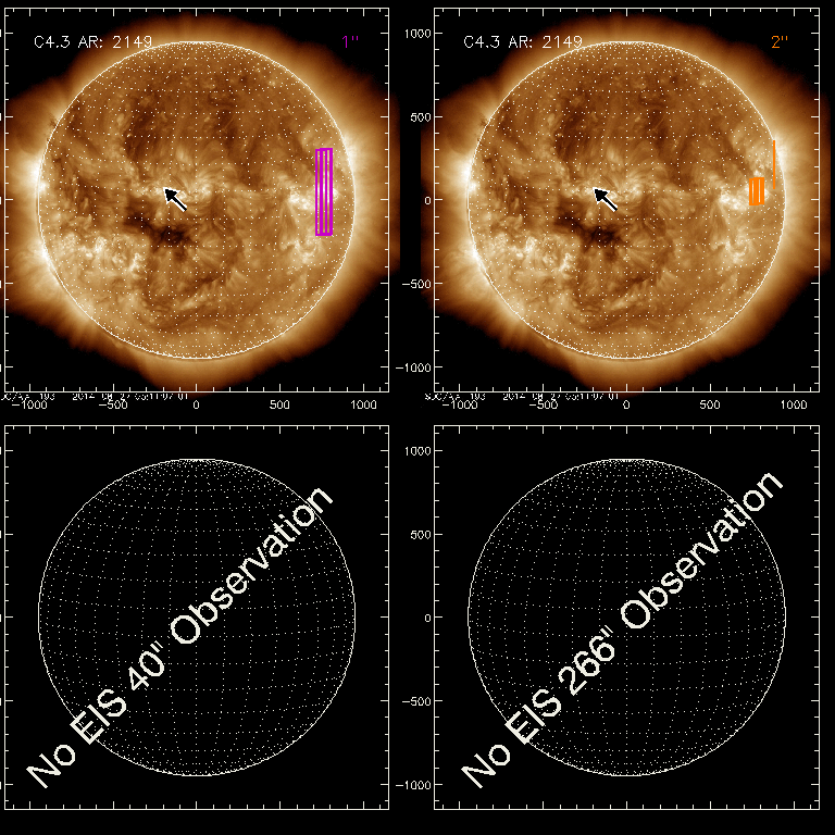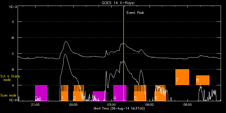 EIS Observation timeline overlay to GOES-Xray curve Code 1" 2" 40" 266" EIS Observations list for this event: STUDY ACRONYM ID DATE OBSERVED DESCRIPTION NOAA# TARGET 0 HPW021_VEL_120x512v1 | 42460 | 2014/08/26 20:58:27 | Flare study | | Active Region TIMELINE ID DATE OBSERVED FITS FILE XCEN (+W/-E) YCEN (+N/-S) DUR ----------------------------------------------------------------------------------------------------------------- 42460 | 2014/08/26 20:58:27.000 | eis_l0_20140826_205827.fits.gz | 748.58 | 42.08 | 57m45s 1 HH_Flare_raster_v6 | 42467 | 2014/08/26 23:01:35 | flare study | | Flare TIMELINE ID DATE OBSERVED FITS FILE XCEN (+W/-E) YCEN (+N/-S) DUR ----------------------------------------------------------------------------------------------------------------- 42467 | 2014/08/26 23:01:35.000 | eis_l0_20140826_230135.fits.gz | 758.99 | 43.86 | 52s 42467 | 2014/08/26 23:02:30.000 | eis_l0_20140826_230230.fits.gz | 759.14 | 43.86 | 3m31s 42467 | 2014/08/26 23:06:04.000 | eis_l0_20140826_230604.fits.gz | 759.30 | 44.01 | 3m31s 42467 | 2014/08/26 23:09:38.000 | eis_l0_20140826_230938.fits.gz | 759.68 | 43.78 | 3m32s 42467 | 2014/08/26 23:13:13.000 | eis_l0_20140826_231313.fits.gz | 759.99 | 44.01 | 3m32s 42467 | 2014/08/26 23:16:48.000 | eis_l0_20140826_231648.fits.gz | 760.38 | 44.09 | 3m31s 42467 | 2014/08/26 23:20:21.000 | eis_l0_20140826_232021.fits.gz | 760.61 | 44.17 | 3m32s 42467 | 2014/08/26 23:23:55.000 | eis_l0_20140826_232355.fits.gz | 760.92 | 44.17 | 3m32s 42467 | 2014/08/26 23:27:30.000 | eis_l0_20140826_232730.fits.gz | 761.23 | 44.32 | 3m32s 42467 | 2014/08/26 23:31:04.000 | eis_l0_20140826_233104.fits.gz | 761.46 | 44.32 | 3m32s 2 HH_Flare_raster_v6 | 42461 | 2014/08/26 23:59:13 | flare study | | Flare TIMELINE ID DATE OBSERVED FITS FILE XCEN (+W/-E) YCEN (+N/-S) DUR ----------------------------------------------------------------------------------------------------------------- 42461 | 2014/08/26 23:59:13.000 | eis_l0_20140826_235913.fits.gz | 763.93 | 44.86 | 3m32s 42461 | 2014/08/27 00:02:48.000 | eis_l0_20140827_000248.fits.gz | 764.24 | 44.78 | 3m31s 42461 | 2014/08/27 00:06:22.000 | eis_l0_20140827_000622.fits.gz | 764.55 | 44.86 | 3m31s 42461 | 2014/08/27 00:09:56.000 | eis_l0_20140827_000956.fits.gz | 764.86 | 44.94 | 3m31s 42461 | 2014/08/27 00:13:30.000 | eis_l0_20140827_001330.fits.gz | 765.17 | 44.94 | 3m32s 42461 | 2014/08/27 00:17:05.000 | eis_l0_20140827_001705.fits.gz | 765.40 | 45.02 | 3m31s 42461 | 2014/08/27 00:20:39.000 | eis_l0_20140827_002039.fits.gz | 765.71 | 45.02 | 3m32s 42461 | 2014/08/27 00:24:13.000 | eis_l0_20140827_002413.fits.gz | 766.09 | 45.09 | 3m32s 42461 | 2014/08/27 00:27:48.000 | eis_l0_20140827_002748.fits.gz | 766.33 | 45.25 | 3m31s 42461 | 2014/08/27 00:31:22.000 | eis_l0_20140827_003122.fits.gz | 766.71 | 45.25 | 3m32s 42461 | 2014/08/27 00:34:57.000 | eis_l0_20140827_003457.fits.gz | 767.02 | 45.32 | 3m32s 42461 | 2014/08/27 00:38:32.000 | eis_l0_20140827_003832.fits.gz | 767.33 | 45.32 | 3m31s 42461 | 2014/08/27 00:42:06.000 | eis_l0_20140827_004206.fits.gz | 767.56 | 45.40 | 3m31s 42461 | 2014/08/27 00:45:40.000 | eis_l0_20140827_004540.fits.gz | 767.87 | 45.40 | 3m32s 3 HPW021_VEL_120x512v1 | 42468 | 2014/08/27 01:32:26 | Flare study | 2146 | Active Region TIMELINE ID DATE OBSERVED FITS FILE XCEN (+W/-E) YCEN (+N/-S) DUR ----------------------------------------------------------------------------------------------------------------- 42468 | 2014/08/27 01:32:26.000 | eis_l0_20140827_013226.fits.gz | 772.62 | 46.02 | 1h1m53s 4 HPW021_VEL_120x512v1 | 42469 | 2014/08/27 03:09:10 | Flare study | 2146 | Active Region TIMELINE ID DATE OBSERVED FITS FILE XCEN (+W/-E) YCEN (+N/-S) DUR ----------------------------------------------------------------------------------------------------------------- 42469 | 2014/08/27 03:09:10.000 | eis_l0_20140827_030910.fits.gz | 780.50 | 47.72 | 1h1m53s 5 HH_Flare_raster_v6 | 42472 | 2014/08/27 04:46:26 | flare study | 2146 | Flare TIMELINE ID DATE OBSERVED FITS FILE XCEN (+W/-E) YCEN (+N/-S) DUR ----------------------------------------------------------------------------------------------------------------- 42472 | 2014/08/27 04:46:26.000 | eis_l0_20140827_044626.fits.gz | 787.97 | 49.11 | 3m32s 42472 | 2014/08/27 04:50:01.000 | eis_l0_20140827_045001.fits.gz | 788.13 | 49.19 | 3m31s 42472 | 2014/08/27 04:53:35.000 | eis_l0_20140827_045335.fits.gz | 788.44 | 49.34 | 3m32s 42472 | 2014/08/27 04:57:10.000 | eis_l0_20140827_045710.fits.gz | 788.75 | 49.42 | 3m31s 42472 | 2014/08/27 05:00:44.000 | eis_l0_20140827_050044.fits.gz | 789.05 | 49.26 | 3m32s 42472 | 2014/08/27 05:04:19.000 | eis_l0_20140827_050419.fits.gz | 789.29 | 49.50 | 3m31s 42472 | 2014/08/27 05:07:53.000 | eis_l0_20140827_050753.fits.gz | 789.67 | 49.50 | 3m31s 42472 | 2014/08/27 05:11:26.000 | eis_l0_20140827_051126.fits.gz | 789.90 | 49.57 | 3m32s 42472 | 2014/08/27 05:15:01.000 | eis_l0_20140827_051501.fits.gz | 790.29 | 49.50 | 3m31s 42472 | 2014/08/27 05:18:35.000 | eis_l0_20140827_051835.fits.gz | 790.37 | 49.73 | 3m31s 42472 | 2014/08/27 05:22:09.000 | eis_l0_20140827_052209.fits.gz | 790.68 | 49.73 | 3m32s 42472 | 2014/08/27 05:25:44.000 | eis_l0_20140827_052544.fits.gz | 790.99 | 49.81 | 3m31s 42472 | 2014/08/27 05:29:17.000 | eis_l0_20140827_052917.fits.gz | 791.29 | 49.96 | 3m32s 42472 | 2014/08/27 05:32:51.000 | eis_l0_20140827_053251.fits.gz | 791.53 | 49.96 | 3m32s 42472 | 2014/08/27 05:36:25.000 | eis_l0_20140827_053625.fits.gz | 791.84 | 50.11 | 3m32s 42472 | 2014/08/27 05:40:00.000 | eis_l0_20140827_054000.fits.gz | 792.07 | 50.04 | 3m32s 6 HH_Flare_raster_v6 | 42464 | 2014/08/27 06:24:10 | flare study | 2146 | Flare TIMELINE ID DATE OBSERVED FITS FILE XCEN (+W/-E) YCEN (+N/-S) DUR ----------------------------------------------------------------------------------------------------------------- 42464 | 2014/08/27 06:24:10.000 | eis_l0_20140827_062410.fits.gz | 795.97 | 50.73 | 3m32s 42464 | 2014/08/27 06:27:45.000 | ei
