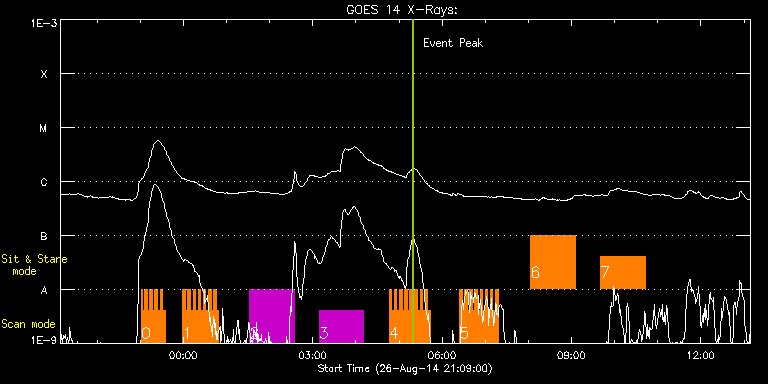 EIS Observation timeline overlay to GOES-Xray curve Code 1" 2" 40" 266" EIS Observations list for this event: STUDY ACRONYM ID DATE OBSERVED DESCRIPTION NOAA# TARGET 0 HH_Flare_raster_v6 | 42467 | 2014/08/26 23:01:35 | flare study | | Flare TIMELINE ID DATE OBSERVED FITS FILE XCEN (+W/-E) YCEN (+N/-S) DUR ----------------------------------------------------------------------------------------------------------------- 42467 | 2014/08/26 23:01:35.000 | eis_l0_20140826_230135.fits.gz | 758.99 | 43.86 | 52s 42467 | 2014/08/26 23:02:30.000 | eis_l0_20140826_230230.fits.gz | 759.14 | 43.86 | 3m31s 42467 | 2014/08/26 23:06:04.000 | eis_l0_20140826_230604.fits.gz | 759.30 | 44.01 | 3m31s 42467 | 2014/08/26 23:09:38.000 | eis_l0_20140826_230938.fits.gz | 759.68 | 43.78 | 3m32s 42467 | 2014/08/26 23:13:13.000 | eis_l0_20140826_231313.fits.gz | 759.99 | 44.01 | 3m32s 42467 | 2014/08/26 23:16:48.000 | eis_l0_20140826_231648.fits.gz | 760.38 | 44.09 | 3m31s 42467 | 2014/08/26 23:20:21.000 | eis_l0_20140826_232021.fits.gz | 760.61 | 44.17 | 3m32s 42467 | 2014/08/26 23:23:55.000 | eis_l0_20140826_232355.fits.gz | 760.92 | 44.17 | 3m32s 42467 | 2014/08/26 23:27:30.000 | eis_l0_20140826_232730.fits.gz | 761.23 | 44.32 | 3m32s 42467 | 2014/08/26 23:31:04.000 | eis_l0_20140826_233104.fits.gz | 761.46 | 44.32 | 3m32s 1 HH_Flare_raster_v6 | 42461 | 2014/08/26 23:59:13 | flare study | | Flare TIMELINE ID DATE OBSERVED FITS FILE XCEN (+W/-E) YCEN (+N/-S) DUR ----------------------------------------------------------------------------------------------------------------- 42461 | 2014/08/26 23:59:13.000 | eis_l0_20140826_235913.fits.gz | 763.93 | 44.86 | 3m32s 42461 | 2014/08/27 00:02:48.000 | eis_l0_20140827_000248.fits.gz | 764.24 | 44.78 | 3m31s 42461 | 2014/08/27 00:06:22.000 | eis_l0_20140827_000622.fits.gz | 764.55 | 44.86 | 3m31s 42461 | 2014/08/27 00:09:56.000 | eis_l0_20140827_000956.fits.gz | 764.86 | 44.94 | 3m31s 42461 | 2014/08/27 00:13:30.000 | eis_l0_20140827_001330.fits.gz | 765.17 | 44.94 | 3m32s 42461 | 2014/08/27 00:17:05.000 | eis_l0_20140827_001705.fits.gz | 765.40 | 45.02 | 3m31s 42461 | 2014/08/27 00:20:39.000 | eis_l0_20140827_002039.fits.gz | 765.71 | 45.02 | 3m32s 42461 | 2014/08/27 00:24:13.000 | eis_l0_20140827_002413.fits.gz | 766.09 | 45.09 | 3m32s 42461 | 2014/08/27 00:27:48.000 | eis_l0_20140827_002748.fits.gz | 766.33 | 45.25 | 3m31s 42461 | 2014/08/27 00:31:22.000 | eis_l0_20140827_003122.fits.gz | 766.71 | 45.25 | 3m32s 42461 | 2014/08/27 00:34:57.000 | eis_l0_20140827_003457.fits.gz | 767.02 | 45.32 | 3m32s 42461 | 2014/08/27 00:38:32.000 | eis_l0_20140827_003832.fits.gz | 767.33 | 45.32 | 3m31s 42461 | 2014/08/27 00:42:06.000 | eis_l0_20140827_004206.fits.gz | 767.56 | 45.40 | 3m31s 42461 | 2014/08/27 00:45:40.000 | eis_l0_20140827_004540.fits.gz | 767.87 | 45.40 | 3m32s 2 HPW021_VEL_120x512v1 | 42468 | 2014/08/27 01:32:26 | Flare study | 2146 | Active Region TIMELINE ID DATE OBSERVED FITS FILE XCEN (+W/-E) YCEN (+N/-S) DUR ----------------------------------------------------------------------------------------------------------------- 42468 | 2014/08/27 01:32:26.000 | eis_l0_20140827_013226.fits.gz | 772.62 | 46.02 | 1h1m53s 3 HPW021_VEL_120x512v1 | 42469 | 2014/08/27 03:09:10 | Flare study | 2146 | Active Region TIMELINE ID DATE OBSERVED FITS FILE XCEN (+W/-E) YCEN (+N/-S) DUR ----------------------------------------------------------------------------------------------------------------- 42469 | 2014/08/27 03:09:10.000 | eis_l0_20140827_030910.fits.gz | 780.50 | 47.72 | 1h1m53s 4 HH_Flare_raster_v6 | 42472 | 2014/08/27 04:46:26 | flare study | 2146 | Flare TIMELINE ID DATE OBSERVED FITS FILE XCEN (+W/-E) YCEN (+N/-S) DUR ----------------------------------------------------------------------------------------------------------------- 42472 | 2014/08/27 04:46:26.000 | eis_l0_20140827_044626.fits.gz | 787.97 | 49.11 | 3m32s 42472 | 2014/08/27 04:50:01.000 | eis_l0_20140827_045001.fits.gz | 788.13 | 49.19 | 3m31s 42472 | 2014/08/27 04:53:35.000 | eis_l0_20140827_045335.fits.gz | 788.44 | 49.34 | 3m32s 42472 | 2014/08/27 04:57:10.000 | eis_l0_20140827_045710.fits.gz | 788.75 | 49.42 | 3m31s 42472 | 2014/08/27 05:00:44.000 | eis_l0_20140827_050044.fits.gz | 789.05 | 49.26 | 3m32s 42472 | 2014/08/27 05:04:19.000 | eis_l0_20140827_050419.fits.gz | 789.29 | 49.50 | 3m31s 42472 | 2014/08/27 05:07:53.000 | eis_l0_20140827_050753.fits.gz | 789.67 | 49.50 | 3m31s 42472 | 2014/08/27 05:11:26.000 | eis_l0_20140827_051126.fits.gz | 789.90 | 49.57 | 3m32s 42472 | 2014/08/27 05:15:01.000 | eis_l0_20140827_051501.fits.gz | 790.29 | 49.50 | 3m31s 42472 | 2014/08/27 05:18:35.000 | eis_l0_20140827_051835.fits.gz | 790.37 | 49.73 | 3m31s 42472 | 2014/08/27 05:22:09.000 | eis_l0_20140827_052209.fits.gz | 790.68 | 49.73 | 3m32s 42472 | 2014/08/27 05:25:44.000 | eis_l0_20140827_052544.fits.gz | 790.99 | 49.81 | 3m31s 42472 | 2014/08/27 05:29:17.000 | eis_l0_20140827_052917.fits.gz | 791.29 | 49.96 | 3m32s 42472 | 2014/08/27 05:32:51.000 | eis_l0_20140827_053251.fits.gz | 791.53 | 49.96 | 3m32s 42472 | 2014/08/27 05:36:25.000 | eis_l0_20140827_053625.fits.gz | 791.84 | 50.11 | 3m32s 42472 | 2014/08/27 05:40:00.000 | eis_l0_20140827_054000.fits.gz | 792.07 | 50.04 | 3m32s 5 HH_Flare_raster_v6 | 42464 | 2014/08/27 06:24:10 | flare study | 2146 | Flare TIMELINE ID DATE OBSERVED FITS FILE XCEN (+W/-E) YCEN (+N/-S) DUR ----------------------------------------------------------------------------------------------------------------- 42464 | 2014/08/27 06:24:10.000 | eis_l0_20140827_062410.fits.gz | 795.97 | 50.73 | 3m32s 42464 | 2014/08/27 06:27:45.000 | eis_l0_20140827_062745.fits.gz | 796.20 | 50.96 | 3m31s 42464 | 2014/08/27 06:31:19.000 | eis_l0_20140827_063119.fits.gz | 796.51 | 50.96 | 3m32s 42464 | 2014/08/27 06:34:54.000 | eis_l0_20140827_063454.fits.gz | 796.89 | 51.20 | 3m31s 42464 | 2014/08/27 06:38:28.000 | eis_l0_20140827_063828.fits.gz | 797.12 | 51.04 | 3m31s 42464 | 2014/08/27 06:42:02.000 