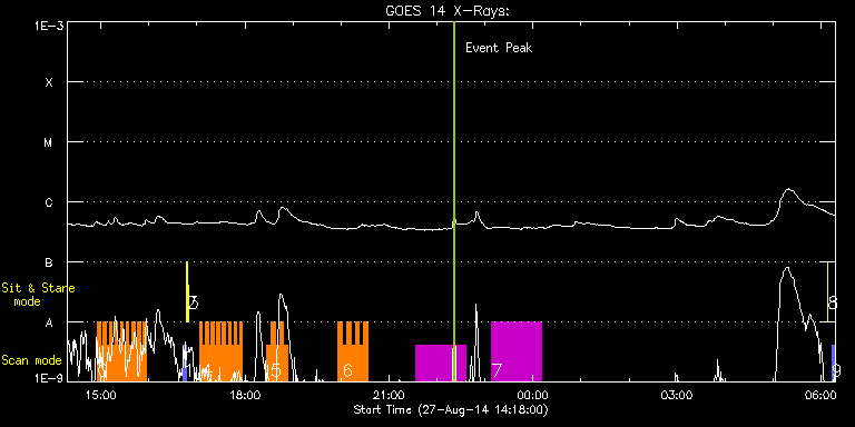 EIS Observation timeline overlay to GOES-Xray curve Code 1" 2" 40" 266" EIS Observations list for this event: STUDY ACRONYM ID DATE OBSERVED DESCRIPTION NOAA# TARGET 0 HH_Flare_raster_v6 | 42466 | 2014/08/27 14:55:57 | flare study | | Flare TIMELINE ID DATE OBSERVED FITS FILE XCEN (+W/-E) YCEN (+N/-S) DUR ----------------------------------------------------------------------------------------------------------------- 42466 | 2014/08/27 14:55:57.000 | eis_l0_20140827_145557.fits.gz | 833.22 | 59.15 | 3m32s 42466 | 2014/08/27 14:59:31.000 | eis_l0_20140827_145931.fits.gz | 833.37 | 59.23 | 3m32s 42466 | 2014/08/27 15:03:06.000 | eis_l0_20140827_150306.fits.gz | 833.53 | 59.31 | 3m31s 42466 | 2014/08/27 15:06:40.000 | eis_l0_20140827_150640.fits.gz | 833.91 | 59.46 | 3m32s 42466 | 2014/08/27 15:10:15.000 | eis_l0_20140827_151015.fits.gz | 834.07 | 59.69 | 3m31s 42466 | 2014/08/27 15:13:49.000 | eis_l0_20140827_151349.fits.gz | 834.22 | 59.54 | 3m31s 42466 | 2014/08/27 15:17:23.000 | eis_l0_20140827_151723.fits.gz | 834.53 | 59.46 | 3m32s 42466 | 2014/08/27 15:20:57.000 | eis_l0_20140827_152057.fits.gz | 834.76 | 59.69 | 3m31s 42466 | 2014/08/27 15:24:31.000 | eis_l0_20140827_152431.fits.gz | 834.99 | 59.69 | 3m32s 42466 | 2014/08/27 15:28:05.000 | eis_l0_20140827_152805.fits.gz | 835.22 | 59.62 | 3m32s 42466 | 2014/08/27 15:31:39.000 | eis_l0_20140827_153139.fits.gz | 835.46 | 59.85 | 3m32s 42466 | 2014/08/27 15:35:13.000 | eis_l0_20140827_153513.fits.gz | 835.69 | 59.92 | 3m32s 42466 | 2014/08/27 15:38:48.000 | eis_l0_20140827_153848.fits.gz | 835.92 | 60.00 | 3m32s 42466 | 2014/08/27 15:42:23.000 | eis_l0_20140827_154223.fits.gz | 836.15 | 59.85 | 3m31s 42466 | 2014/08/27 15:45:57.000 | eis_l0_20140827_154557.fits.gz | 836.38 | 60.08 | 3m31s 42466 | 2014/08/27 15:49:30.000 | eis_l0_20140827_154930.fits.gz | 836.69 | 60.23 | 3m32s 42466 | 2014/08/27 15:53:04.000 | eis_l0_20140827_155304.fits.gz | 836.85 | 60.23 | 3m31s 1 PRY_slot_contextLITE | 42439 | 2014/08/27 16:43:21 | alilgnment | 2149 | Active Region TIMELINE ID DATE OBSERVED FITS FILE XCEN (+W/-E) YCEN (+N/-S) DUR ----------------------------------------------------------------------------------------------------------------- 42439 | 2014/08/27 16:43:21.000 | eis_l0_20140827_164321.fits.gz | -30.77 | -4.73 | 2m56s 2 Alignment_266 | 42440 | 2014/08/27 16:46:36 | alignment | 2149 | Quiet Sun TIMELINE ID DATE OBSERVED FITS FILE XCEN (+W/-E) YCEN (+N/-S) DUR ----------------------------------------------------------------------------------------------------------------- 42440 | 2014/08/27 16:46:36.000 | eis_l0_20140827_164636.fits.gz | -147.96 | -4.50 | 1m22s 3 XRT_synop_AIA | 42441 | 2014/08/27 16:49:10 | alignment | 2149 | Quiet Sun TIMELINE ID DATE OBSERVED FITS FILE XCEN (+W/-E) YCEN (+N/-S) DUR ----------------------------------------------------------------------------------------------------------------- 42441 | 2014/08/27 16:49:10.000 | eis_l0_20140827_164910.fits.gz | -147.96 | -4.42 | 10s 42441 | 2014/08/28 06:08:42.000 | eis_l0_20140828_060842.fits.gz | -148.04 | -4.35 | 10s 4 HH_Flare_raster_v6 | 42471 | 2014/08/27 17:03:20 | flare study | | Flare TIMELINE ID DATE OBSERVED FITS FILE XCEN (+W/-E) YCEN (+N/-S) DUR ----------------------------------------------------------------------------------------------------------------- 42471 | 2014/08/27 17:03:20.000 | eis_l0_20140827_170320.fits.gz | 840.58 | 61.39 | 3m32s 42471 | 2014/08/27 17:06:55.000 | eis_l0_20140827_170655.fits.gz | 840.89 | 61.39 | 3m31s 42471 | 2014/08/27 17:10:29.000 | eis_l0_20140827_171029.fits.gz | 841.12 | 61.55 | 3m31s 42471 | 2014/08/27 17:14:03.000 | eis_l0_20140827_171403.fits.gz | 841.35 | 61.39 | 3m32s 42471 | 2014/08/27 17:17:38.000 | eis_l0_20140827_171738.fits.gz | 841.51 | 61.70 | 3m31s 42471 | 2014/08/27 17:21:12.000 | eis_l0_20140827_172112.fits.gz | 841.74 | 61.47 | 3m31s 42471 | 2014/08/27 17:24:46.000 | eis_l0_20140827_172446.fits.gz | 841.97 | 61.62 | 3m32s 42471 | 2014/08/27 17:28:20.000 | eis_l0_20140827_172820.fits.gz | 842.12 | 61.70 | 3m32s 42471 | 2014/08/27 17:31:55.000 | eis_l0_20140827_173155.fits.gz | 842.43 | 61.86 | 3m32s 42471 | 2014/08/27 17:35:30.000 | eis_l0_20140827_173530.fits.gz | 842.66 | 61.86 | 3m31s 42471 | 2014/08/27 17:39:04.000 | eis_l0_20140827_173904.fits.gz | 842.82 | 61.86 | 3m31s 42471 | 2014/08/27 17:42:38.000 | eis_l0_20140827_174238.fits.gz | 843.05 | 62.09 | 3m31s 42471 | 2014/08/27 17:46:12.000 | eis_l0_20140827_174612.fits.gz | 843.28 | 62.09 | 3m32s 42471 | 2014/08/27 17:49:47.000 | eis_l0_20140827_174947.fits.gz | 843.51 | 62.16 | 3m31s 42471 | 2014/08/27 17:53:21.000 | eis_l0_20140827_175321.fits.gz | 843.82 | 62.32 | 3m31s 5 tr_bright_lo | 42446 | 2014/08/27 18:27:14 | HOP261 | | Quiet Sun TIMELINE ID DATE OBSERVED FITS FILE XCEN (+W/-E) YCEN (+N/-S) DUR ----------------------------------------------------------------------------------------------------------------- 42446 | 2014/08/27 18:27:14.000 | eis_l0_20140827_182714.fits.gz | 858.89 | 97.86 | 5m15s 42446 | 2014/08/27 18:32:32.000 | eis_l0_20140827_183232.fits.gz | 859.20 | 97.86 | 5m15s 42446 | 2014/08/27 18:37:50.000 | eis_l0_20140827_183750.fits.gz | 859.51 | 98.09 | 5m15s 42446 | 2014/08/27 18:43:08.000 | eis_l0_20140827_184308.fits.gz | 859.82 | 98.01 | 5m15s 42446 | 2014/08/27 18:48:25.000 | eis_l0_20140827_184825.fits.gz | 860.12 | 98.25 | 5m15s 6 tr_bright_lo | 42447 | 2014/08/27 19:56:44 | HOP261 | | Quiet Sun TIMELINE ID DATE OBSERVED FITS FILE XCEN (+W/-E) YCEN (+N/-S) DUR ----------------------------------------------------------------------------------------------------------------- 42447 | 2014/08/27 19:56:44.000 | eis_l0_20140827_195644.fits.gz | 864.29 | 99.33 | 5m15s 42447 | 2014/08/27 20:02:02.000 | eis_l0_20140827_200202.fits.gz | 864.60 | 99.33 | 5m15s 42447 | 2014/08/27 20:07:20.000 | eis_l0_20140827_200720.fits.gz | 864.91 | 99.48 | 5m15s 42447 | 2014/08/27 20:12:38.000 | eis_l0_20140827_201238.fits.gz | 865.22 | 99.48 | 5m