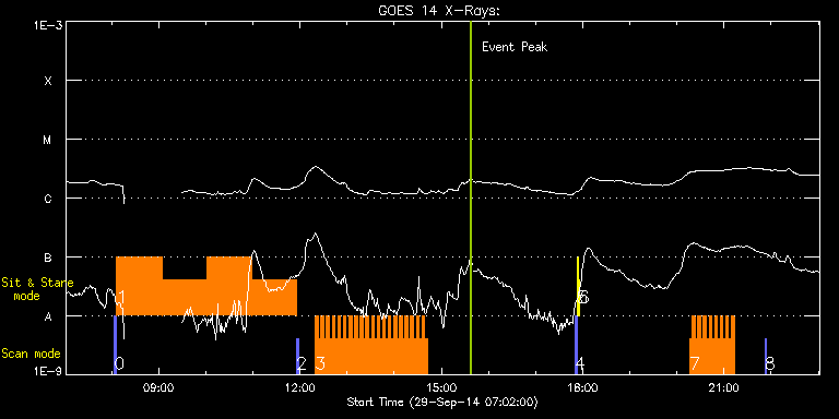 EIS Observation timeline overlay to GOES-Xray curve Code 1" 2" 40" 266" EIS Observations list for this event: STUDY ACRONYM ID DATE OBSERVED DESCRIPTION NOAA# TARGET 0 PRY_slot_context_v3 | 43029 | 2014/09/29 08:03:19 | HOP266 | | Active Region TIMELINE ID DATE OBSERVED FITS FILE XCEN (+W/-E) YCEN (+N/-S) DUR ----------------------------------------------------------------------------------------------------------------- 43029 | 2014/09/29 08:03:19.000 | eis_l0_20140929_080319.fits.gz | -181.08 | -717.64 | 2m57s 1 Cool_loop_stare | 43030 | 2014/09/29 08:06:41 | HOP266 | | Quiet Sun TIMELINE ID DATE OBSERVED FITS FILE XCEN (+W/-E) YCEN (+N/-S) DUR ----------------------------------------------------------------------------------------------------------------- 43030 | 2014/09/29 08:06:41.000 | eis_l0_20140929_080641.fits.gz | -165.96 | -717.41 | 57m7s 43030 | 2014/09/29 09:03:51.000 | eis_l0_20140929_090351.fits.gz | -160.47 | -717.72 | 57m8s 43030 | 2014/09/29 10:01:01.000 | eis_l0_20140929_100101.fits.gz | -155.07 | -717.80 | 57m9s 43030 | 2014/09/29 10:58:12.000 | eis_l0_20140929_105812.fits.gz | -149.66 | -718.03 | 57m8s 2 PRY_slot_context_v3 | 43031 | 2014/09/29 11:55:31 | HOP266 | | Active Region TIMELINE ID DATE OBSERVED FITS FILE XCEN (+W/-E) YCEN (+N/-S) DUR ----------------------------------------------------------------------------------------------------------------- 43031 | 2014/09/29 11:55:31.000 | eis_l0_20140929_115531.fits.gz | -158.51 | -718.18 | 2m56s 3 HH_Flare_raster_v6 | 43016 | 2014/09/29 12:19:32 | Flare study | | Flare TIMELINE ID DATE OBSERVED FITS FILE XCEN (+W/-E) YCEN (+N/-S) DUR ----------------------------------------------------------------------------------------------------------------- 43016 | 2014/09/29 12:19:32.000 | eis_l0_20140929_121932.fits.gz | -148.52 | -749.34 | 3m31s 43016 | 2014/09/29 12:23:06.000 | eis_l0_20140929_122306.fits.gz | -148.28 | -749.26 | 3m32s 43016 | 2014/09/29 12:26:41.000 | eis_l0_20140929_122641.fits.gz | -147.82 | -749.26 | 3m31s 43016 | 2014/09/29 12:30:15.000 | eis_l0_20140929_123015.fits.gz | 11.54 | -586.73 | 3m31s 43016 | 2014/09/29 12:33:49.000 | eis_l0_20140929_123349.fits.gz | 603.49 | -327.80 | 3m32s 43016 | 2014/09/29 12:37:24.000 | eis_l0_20140929_123724.fits.gz | 603.88 | -327.72 | 3m31s 43016 | 2014/09/29 12:40:58.000 | eis_l0_20140929_124058.fits.gz | 604.26 | -327.80 | 3m32s 43016 | 2014/09/29 12:44:33.000 | eis_l0_20140929_124433.fits.gz | 604.65 | -327.64 | 3m31s 43016 | 2014/09/29 12:48:07.000 | eis_l0_20140929_124807.fits.gz | 605.03 | -327.88 | 3m31s 43016 | 2014/09/29 12:51:41.000 | eis_l0_20140929_125141.fits.gz | 605.42 | -327.72 | 3m32s 43016 | 2014/09/29 12:55:16.000 | eis_l0_20140929_125516.fits.gz | 605.89 | -327.57 | 3m32s 43016 | 2014/09/29 12:58:50.000 | eis_l0_20140929_125850.fits.gz | 606.19 | -327.57 | 3m31s 43016 | 2014/09/29 13:02:24.000 | eis_l0_20140929_130224.fits.gz | 606.66 | -327.64 | 3m31s 43016 | 2014/09/29 13:05:58.000 | eis_l0_20140929_130558.fits.gz | 607.04 | -327.49 | 3m32s 43016 | 2014/09/29 13:09:33.000 | eis_l0_20140929_130933.fits.gz | 607.43 | -327.41 | 3m31s 43016 | 2014/09/29 13:13:07.000 | eis_l0_20140929_131307.fits.gz | 607.97 | -327.49 | 3m32s 43016 | 2014/09/29 13:16:42.000 | eis_l0_20140929_131642.fits.gz | 608.28 | -327.49 | 3m31s 43016 | 2014/09/29 13:20:16.000 | eis_l0_20140929_132016.fits.gz | 608.67 | -327.41 | 3m31s 43016 | 2014/09/29 13:23:50.000 | eis_l0_20140929_132350.fits.gz | 609.13 | -327.18 | 3m31s 43016 | 2014/09/29 13:27:24.000 | eis_l0_20140929_132724.fits.gz | 609.52 | -327.26 | 3m31s 43016 | 2014/09/29 13:30:58.000 | eis_l0_20140929_133058.fits.gz | 609.82 | -327.18 | 3m32s 43016 | 2014/09/29 13:34:32.000 | eis_l0_20140929_133432.fits.gz | 610.36 | -327.18 | 3m31s 43016 | 2014/09/29 13:38:06.000 | eis_l0_20140929_133806.fits.gz | 610.67 | -327.03 | 3m31s 43016 | 2014/09/29 13:41:40.000 | eis_l0_20140929_134140.fits.gz | 611.06 | -327.18 | 3m31s 43016 | 2014/09/29 13:45:14.000 | eis_l0_20140929_134514.fits.gz | 611.37 | -327.10 | 3m31s 43016 | 2014/09/29 13:48:48.000 | eis_l0_20140929_134848.fits.gz | 611.91 | -327.03 | 3m32s 43016 | 2014/09/29 13:52:23.000 | eis_l0_20140929_135223.fits.gz | 612.30 | -327.03 | 3m31s 43016 | 2014/09/29 13:55:57.000 | eis_l0_20140929_135557.fits.gz | 612.68 | -326.95 | 3m31s 43016 | 2014/09/29 13:59:31.000 | eis_l0_20140929_135931.fits.gz | 613.15 | -326.87 | 3m31s 43016 | 2014/09/29 14:03:05.000 | eis_l0_20140929_140305.fits.gz | 613.46 | -326.79 | 3m31s 43016 | 2014/09/29 14:06:39.000 | eis_l0_20140929_140639.fits.gz | 613.84 | -326.79 | 3m31s 43016 | 2014/09/29 14:10:13.000 | eis_l0_20140929_141013.fits.gz | 614.23 | -326.72 | 3m31s 43016 | 2014/09/29 14:13:47.000 | eis_l0_20140929_141347.fits.gz | 614.69 | -326.79 | 3m31s 43016 | 2014/09/29 14:17:21.000 | eis_l0_20140929_141721.fits.gz | 615.00 | -326.56 | 3m32s 43016 | 2014/09/29 14:20:56.000 | eis_l0_20140929_142056.fits.gz | 615.39 | -326.48 | 3m31s 43016 | 2014/09/29 14:24:30.000 | eis_l0_20140929_142430.fits.gz | 615.85 | -326.48 | 3m31s 43016 | 2014/09/29 14:28:04.000 | eis_l0_20140929_142804.fits.gz | 616.24 | -326.48 | 3m32s 43016 | 2014/09/29 14:31:39.000 | eis_l0_20140929_143139.fits.gz | 616.70 | -326.48 | 3m31s 43016 | 2014/09/29 14:35:13.000 | eis_l0_20140929_143513.fits.gz | 617.01 | -326.41 | 3m32s 43016 | 2014/09/29 14:38:47.000 | eis_l0_20140929_143847.fits.gz | 617.40 | -326.10 | 3m32s 4 PRY_slot_contextLITE | 43001 | 2014/09/29 17:49:50 | alignment | | Active Region TIMELINE ID DATE OBSERVED FITS FILE XCEN (+W/-E) YCEN (+N/-S) DUR ----------------------------------------------------------------------------------------------------------------- 43001 | 2014/09/29 17:49:50.000 | eis_l0_20140929_174950.fits.gz | -20.28 | -5.35 | 2m56s 5 Alignment_266 | 43002 | 2014/09/29 17:53:04 | alignment | | Quiet Sun TIMELINE ID DATE OBSERVED FITS FILE XCEN (+W/-E) YCEN (+N/-S) DUR -------------------------------------------------------------------------------