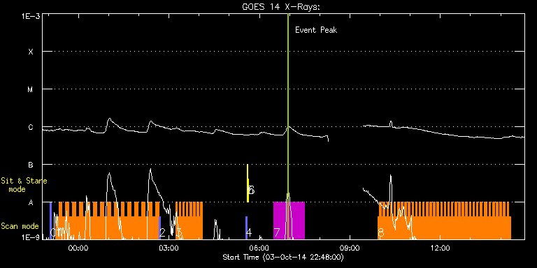 EIS Observation timeline overlay to GOES-Xray curve Code 1" 2" 40" 266" EIS Observations list for this event: STUDY ACRONYM ID DATE OBSERVED DESCRIPTION NOAA# TARGET 0 PRY_slot_context_v3 | 43131 | 2014/10/03 23:03:34 | HOP267 | 2177 | Active Region TIMELINE ID DATE OBSERVED FITS FILE XCEN (+W/-E) YCEN (+N/-S) DUR ----------------------------------------------------------------------------------------------------------------- 43131 | 2014/10/03 23:03:34.000 | eis_l0_20141003_230334.fits.gz | 120.72 | -106.07 | 2m57s 1 Cool_loop_narrow | 43132 | 2014/10/03 23:13:49 | HOP267 | | Active Region TIMELINE ID DATE OBSERVED FITS FILE XCEN (+W/-E) YCEN (+N/-S) DUR ----------------------------------------------------------------------------------------------------------------- 43132 | 2014/10/03 23:13:49.000 | eis_l0_20141003_231349.fits.gz | 136.58 | -106.07 | 6m50s 43132 | 2014/10/03 23:20:42.000 | eis_l0_20141003_232042.fits.gz | 137.66 | -106.30 | 6m50s 43132 | 2014/10/03 23:27:35.000 | eis_l0_20141003_232735.fits.gz | 138.74 | -106.07 | 6m50s 43132 | 2014/10/03 23:34:28.000 | eis_l0_20141003_233428.fits.gz | 139.75 | -106.07 | 6m50s 43132 | 2014/10/03 23:41:21.000 | eis_l0_20141003_234121.fits.gz | 140.83 | -106.07 | 6m50s 43132 | 2014/10/03 23:48:14.000 | eis_l0_20141003_234814.fits.gz | 141.99 | -105.99 | 6m50s 43132 | 2014/10/03 23:55:07.000 | eis_l0_20141003_235507.fits.gz | 142.99 | -105.76 | 6m50s 43132 | 2014/10/04 00:02:00.000 | eis_l0_20141004_000200.fits.gz | 144.08 | -105.99 | 6m50s 43132 | 2014/10/04 00:08:53.000 | eis_l0_20141004_000853.fits.gz | 145.16 | -105.99 | 6m50s 43132 | 2014/10/04 00:15:46.000 | eis_l0_20141004_001546.fits.gz | 146.24 | -106.07 | 6m50s 43132 | 2014/10/04 00:22:39.000 | eis_l0_20141004_002239.fits.gz | 147.24 | -105.99 | 6m50s 43132 | 2014/10/04 00:29:32.000 | eis_l0_20141004_002932.fits.gz | 148.25 | -105.84 | 6m50s 43132 | 2014/10/04 00:36:25.000 | eis_l0_20141004_003625.fits.gz | 149.33 | -105.84 | 6m50s 43132 | 2014/10/04 00:43:18.000 | eis_l0_20141004_004318.fits.gz | 150.41 | -105.92 | 6m50s 43132 | 2014/10/04 00:50:11.000 | eis_l0_20141004_005011.fits.gz | 151.49 | -106.07 | 6m50s 43132 | 2014/10/04 00:57:04.000 | eis_l0_20141004_005704.fits.gz | 152.57 | -105.84 | 6m50s 43132 | 2014/10/04 01:03:57.000 | eis_l0_20141004_010357.fits.gz | 153.65 | -105.84 | 6m50s 43132 | 2014/10/04 01:10:50.000 | eis_l0_20141004_011050.fits.gz | 154.66 | -105.92 | 6m50s 43132 | 2014/10/04 01:17:43.000 | eis_l0_20141004_011743.fits.gz | 155.74 | -105.68 | 6m50s 43132 | 2014/10/04 01:24:36.000 | eis_l0_20141004_012436.fits.gz | 156.82 | -105.76 | 6m50s 43132 | 2014/10/04 01:31:29.000 | eis_l0_20141004_013129.fits.gz | 157.83 | -105.68 | 6m50s 43132 | 2014/10/04 01:38:22.000 | eis_l0_20141004_013822.fits.gz | 158.91 | -105.61 | 6m50s 43132 | 2014/10/04 01:45:15.000 | eis_l0_20141004_014515.fits.gz | 159.99 | -105.61 | 6m50s 43132 | 2014/10/04 01:52:08.000 | eis_l0_20141004_015208.fits.gz | 161.07 | -105.68 | 6m50s 43132 | 2014/10/04 01:59:01.000 | eis_l0_20141004_015901.fits.gz | 162.00 | -105.68 | 6m50s 43132 | 2014/10/04 02:05:54.000 | eis_l0_20141004_020554.fits.gz | 163.08 | -105.61 | 6m50s 43132 | 2014/10/04 02:12:46.000 | eis_l0_20141004_021246.fits.gz | 164.08 | -105.61 | 6m51s 43132 | 2014/10/04 02:19:39.000 | eis_l0_20141004_021939.fits.gz | 165.24 | -105.61 | 6m51s 43132 | 2014/10/04 02:26:32.000 | eis_l0_20141004_022632.fits.gz | 166.32 | -105.45 | 6m50s 43132 | 2014/10/04 02:33:25.000 | eis_l0_20141004_023325.fits.gz | 167.33 | -105.37 | 6m50s 2 PRY_slot_context_v3 | 43133 | 2014/10/04 02:40:26 | HOP267 | 2178 | Active Region TIMELINE ID DATE OBSERVED FITS FILE XCEN (+W/-E) YCEN (+N/-S) DUR ----------------------------------------------------------------------------------------------------------------- 43133 | 2014/10/04 02:40:26.000 | eis_l0_20141004_024026.fits.gz | 154.17 | -105.37 | 2m56s 3 HH_Flare_raster_v6 | 43126 | 2014/10/04 03:13:03 | Flare study | 2178 | Flare TIMELINE ID DATE OBSERVED FITS FILE XCEN (+W/-E) YCEN (+N/-S) DUR ----------------------------------------------------------------------------------------------------------------- 43126 | 2014/10/04 03:13:03.000 | eis_l0_20141004_031303.fits.gz | 108.07 | -153.97 | 3m32s 43126 | 2014/10/04 03:16:37.000 | eis_l0_20141004_031637.fits.gz | 108.61 | -153.74 | 3m32s 43126 | 2014/10/04 03:20:12.000 | eis_l0_20141004_032012.fits.gz | 109.15 | -153.74 | 3m31s 43126 | 2014/10/04 03:23:46.000 | eis_l0_20141004_032346.fits.gz | 109.69 | -153.74 | 3m32s 43126 | 2014/10/04 03:27:21.000 | eis_l0_20141004_032721.fits.gz | 110.31 | -153.82 | 3m31s 43126 | 2014/10/04 03:30:55.000 | eis_l0_20141004_033055.fits.gz | 110.77 | -153.74 | 3m31s 43126 | 2014/10/04 03:34:29.000 | eis_l0_20141004_033429.fits.gz | 111.39 | -153.89 | 3m31s 43126 | 2014/10/04 03:38:03.000 | eis_l0_20141004_033803.fits.gz | 111.93 | -153.89 | 3m32s 43126 | 2014/10/04 03:41:38.000 | eis_l0_20141004_034138.fits.gz | 112.47 | -153.97 | 3m31s 43126 | 2014/10/04 03:45:12.000 | eis_l0_20141004_034512.fits.gz | 113.17 | -153.82 | 3m32s 43126 | 2014/10/04 03:48:47.000 | eis_l0_20141004_034847.fits.gz | 113.56 | -153.89 | 3m31s 43126 | 2014/10/04 03:52:21.000 | eis_l0_20141004_035221.fits.gz | 114.17 | -153.82 | 3m31s 43126 | 2014/10/04 03:55:55.000 | eis_l0_20141004_035555.fits.gz | 114.79 | -153.89 | 3m31s 43126 | 2014/10/04 03:59:29.000 | eis_l0_20141004_035929.fits.gz | 115.33 | -153.82 | 3m32s 43126 | 2014/10/04 04:03:04.000 | eis_l0_20141004_040304.fits.gz | 115.79 | -153.89 | 3m31s 4 PRY_slot_contextLITE | 43098 | 2014/10/04 05:32:20 | alignment | 2178 | Active Region TIMELINE ID DATE OBSERVED FITS FILE XCEN (+W/-E) YCEN (+N/-S) DUR ----------------------------------------------------------------------------------------------------------------- 43098 | 2014/10/04 05:32:20.000 | eis_l0_20141004_053220.fits.gz | -20.03 | -5.50 | 2m56s 5 Alignment_266 | 43099 | 2014/10/04 05:35:35 | alignment | | Quiet Sun TIMELINE ID DATE OBSERVED FITS FILE 