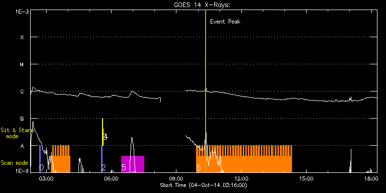 EIS Observation timeline overlay to GOES-Xray curve Code 1" 2" 40" 266" EIS Observations list for this event: STUDY ACRONYM ID DATE OBSERVED DESCRIPTION NOAA# TARGET 0 PRY_slot_context_v3 | 43133 | 2014/10/04 02:40:26 | HOP267 | 2178 | Active Region TIMELINE ID DATE OBSERVED FITS FILE XCEN (+W/-E) YCEN (+N/-S) DUR ----------------------------------------------------------------------------------------------------------------- 43133 | 2014/10/04 02:40:26.000 | eis_l0_20141004_024026.fits.gz | 154.17 | -105.37 | 2m56s 1 HH_Flare_raster_v6 | 43126 | 2014/10/04 03:13:03 | Flare study | 2178 | Flare TIMELINE ID DATE OBSERVED FITS FILE XCEN (+W/-E) YCEN (+N/-S) DUR ----------------------------------------------------------------------------------------------------------------- 43126 | 2014/10/04 03:13:03.000 | eis_l0_20141004_031303.fits.gz | 108.07 | -153.97 | 3m32s 43126 | 2014/10/04 03:16:37.000 | eis_l0_20141004_031637.fits.gz | 108.61 | -153.74 | 3m32s 43126 | 2014/10/04 03:20:12.000 | eis_l0_20141004_032012.fits.gz | 109.15 | -153.74 | 3m31s 43126 | 2014/10/04 03:23:46.000 | eis_l0_20141004_032346.fits.gz | 109.69 | -153.74 | 3m32s 43126 | 2014/10/04 03:27:21.000 | eis_l0_20141004_032721.fits.gz | 110.31 | -153.82 | 3m31s 43126 | 2014/10/04 03:30:55.000 | eis_l0_20141004_033055.fits.gz | 110.77 | -153.74 | 3m31s 43126 | 2014/10/04 03:34:29.000 | eis_l0_20141004_033429.fits.gz | 111.39 | -153.89 | 3m31s 43126 | 2014/10/04 03:38:03.000 | eis_l0_20141004_033803.fits.gz | 111.93 | -153.89 | 3m32s 43126 | 2014/10/04 03:41:38.000 | eis_l0_20141004_034138.fits.gz | 112.47 | -153.97 | 3m31s 43126 | 2014/10/04 03:45:12.000 | eis_l0_20141004_034512.fits.gz | 113.17 | -153.82 | 3m32s 43126 | 2014/10/04 03:48:47.000 | eis_l0_20141004_034847.fits.gz | 113.56 | -153.89 | 3m31s 43126 | 2014/10/04 03:52:21.000 | eis_l0_20141004_035221.fits.gz | 114.17 | -153.82 | 3m31s 43126 | 2014/10/04 03:55:55.000 | eis_l0_20141004_035555.fits.gz | 114.79 | -153.89 | 3m31s 43126 | 2014/10/04 03:59:29.000 | eis_l0_20141004_035929.fits.gz | 115.33 | -153.82 | 3m32s 43126 | 2014/10/04 04:03:04.000 | eis_l0_20141004_040304.fits.gz | 115.79 | -153.89 | 3m31s 2 PRY_slot_contextLITE | 43098 | 2014/10/04 05:32:20 | alignment | 2178 | Active Region TIMELINE ID DATE OBSERVED FITS FILE XCEN (+W/-E) YCEN (+N/-S) DUR ----------------------------------------------------------------------------------------------------------------- 43098 | 2014/10/04 05:32:20.000 | eis_l0_20141004_053220.fits.gz | -20.03 | -5.50 | 2m56s 3 Alignment_266 | 43099 | 2014/10/04 05:35:35 | alignment | | Quiet Sun TIMELINE ID DATE OBSERVED FITS FILE XCEN (+W/-E) YCEN (+N/-S) DUR ----------------------------------------------------------------------------------------------------------------- 43099 | 2014/10/04 05:35:35.000 | eis_l0_20141004_053535.fits.gz | -137.31 | -5.50 | 1m22s 4 XRT_synop_AIA | 43100 | 2014/10/04 05:37:42 | alignment | | Quiet Sun TIMELINE ID DATE OBSERVED FITS FILE XCEN (+W/-E) YCEN (+N/-S) DUR ----------------------------------------------------------------------------------------------------------------- 43100 | 2014/10/04 05:37:42.000 | eis_l0_20141004_053742.fits.gz | -137.38 | -5.50 | 10s 5 HPW021_VEL_120x512v1 | 43119 | 2014/10/04 06:28:03 | Flare study | 2178 | Active Region TIMELINE ID DATE OBSERVED FITS FILE XCEN (+W/-E) YCEN (+N/-S) DUR ----------------------------------------------------------------------------------------------------------------- 43119 | 2014/10/04 06:28:03.000 | eis_l0_20141004_062803.fits.gz | 188.60 | -287.35 | 1h1m52s 6 HH_Flare_raster_v6 | 43179 | 2014/10/04 09:55:27 | Flare study | | Flare TIMELINE ID DATE OBSERVED FITS FILE XCEN (+W/-E) YCEN (+N/-S) DUR ----------------------------------------------------------------------------------------------------------------- 43179 | 2014/10/04 09:55:27.000 | eis_l0_20141004_095527.fits.gz | 914.35 | -285.38 | 3m32s 43179 | 2014/10/04 09:59:02.000 | eis_l0_20141004_095902.fits.gz | 914.27 | -285.30 | 3m31s 43179 | 2014/10/04 10:02:36.000 | eis_l0_20141004_100236.fits.gz | 914.35 | -285.38 | 3m32s 43179 | 2014/10/04 10:06:10.000 | eis_l0_20141004_100610.fits.gz | 914.20 | -285.22 | 3m32s 43179 | 2014/10/04 10:09:45.000 | eis_l0_20141004_100945.fits.gz | 914.35 | -285.38 | 3m32s 43179 | 2014/10/04 10:13:20.000 | eis_l0_20141004_101320.fits.gz | 914.35 | -285.30 | 3m31s 43179 | 2014/10/04 10:16:53.000 | eis_l0_20141004_101653.fits.gz | 914.27 | -285.22 | 3m32s 43179 | 2014/10/04 10:20:28.000 | eis_l0_20141004_102028.fits.gz | 914.27 | -285.30 | 3m32s 43179 | 2014/10/04 10:24:03.000 | eis_l0_20141004_102403.fits.gz | 914.35 | -285.30 | 3m31s 43179 | 2014/10/04 10:27:36.000 | eis_l0_20141004_102736.fits.gz | 914.35 | -285.22 | 3m32s 43179 | 2014/10/04 10:31:11.000 | eis_l0_20141004_103111.fits.gz | 914.20 | -285.30 | 3m31s 43179 | 2014/10/04 10:34:45.000 | eis_l0_20141004_103445.fits.gz | 914.27 | -285.45 | 3m31s 43179 | 2014/10/04 10:38:19.000 | eis_l0_20141004_103819.fits.gz | 914.27 | -285.22 | 3m31s 43179 | 2014/10/04 10:41:53.000 | eis_l0_20141004_104153.fits.gz | 914.35 | -285.30 | 3m31s 43179 | 2014/10/04 10:45:27.000 | eis_l0_20141004_104527.fits.gz | 914.35 | -285.30 | 3m32s 43179 | 2014/10/04 10:49:02.000 | eis_l0_20141004_104902.fits.gz | 914.27 | -285.22 | 3m31s 43179 | 2014/10/04 10:52:36.000 | eis_l0_20141004_105236.fits.gz | 914.27 | -285.38 | 3m32s 43179 | 2014/10/04 10:56:10.000 | eis_l0_20141004_105610.fits.gz | 914.35 | -285.22 | 3m32s 43179 | 2014/10/04 10:59:44.000 | eis_l0_20141004_105944.fits.gz | 914.35 | -285.22 | 3m31s 43179 | 2014/10/04 11:03:18.000 | eis_l0_20141004_110318.fits.gz | 914.27 | -285.45 | 3m31s 43179 | 2014/10/04 11:06:52.000 | eis_l0_20141004_110652.fits.gz | 914.27 | -285.38 | 3m32s 43179 | 2014/10/04 11:10:27.000 | eis_l0_20141004_111027.fits.gz | 914.27 | -285.38 | 3m31s 43179 | 2014/10/04 11:14:01.000 | eis_l0_20141004_111401.fits.gz | 914.27 | -285.45 | 3m31s 43179 | 2014/10/04 11:17:35.000 | eis_l0_20141004_111735.fits