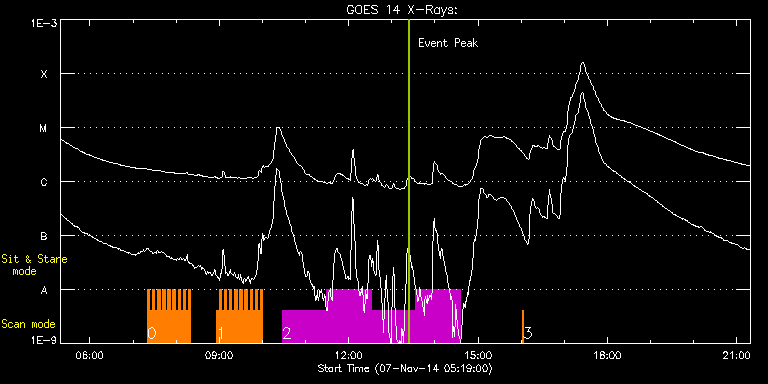 EIS Observation timeline overlay to GOES-Xray curve Code 1" 2" 40" 266" EIS Observations list for this event: STUDY ACRONYM ID DATE OBSERVED DESCRIPTION NOAA# TARGET 0 HH_Flare_raster_v6 | 43683 | 2014/11/07 07:19:43 | Flare study | 2205 | Flare TIMELINE ID DATE OBSERVED FITS FILE XCEN (+W/-E) YCEN (+N/-S) DUR ----------------------------------------------------------------------------------------------------------------- 43683 | 2014/11/07 07:19:43.000 | eis_l0_20141107_071943.fits.gz | -646.02 | 214.72 | 3m32s 43683 | 2014/11/07 07:23:18.000 | eis_l0_20141107_072318.fits.gz | -645.56 | 214.57 | 3m31s 43683 | 2014/11/07 07:26:52.000 | eis_l0_20141107_072652.fits.gz | -645.17 | 214.72 | 3m32s 43683 | 2014/11/07 07:30:26.000 | eis_l0_20141107_073026.fits.gz | -644.79 | 214.64 | 3m32s 43683 | 2014/11/07 07:34:01.000 | eis_l0_20141107_073401.fits.gz | -644.48 | 214.72 | 3m31s 43683 | 2014/11/07 07:37:35.000 | eis_l0_20141107_073735.fits.gz | -644.01 | 214.64 | 3m31s 43683 | 2014/11/07 07:41:09.000 | eis_l0_20141107_074109.fits.gz | -643.63 | 214.64 | 3m32s 43683 | 2014/11/07 07:44:43.000 | eis_l0_20141107_074443.fits.gz | -643.24 | 214.57 | 3m32s 43683 | 2014/11/07 07:48:18.000 | eis_l0_20141107_074818.fits.gz | -642.85 | 214.41 | 3m32s 43683 | 2014/11/07 07:51:53.000 | eis_l0_20141107_075153.fits.gz | -642.47 | 214.49 | 3m31s 43683 | 2014/11/07 07:55:27.000 | eis_l0_20141107_075527.fits.gz | -642.01 | 214.41 | 3m31s 43683 | 2014/11/07 07:59:01.000 | eis_l0_20141107_075901.fits.gz | -641.70 | 214.49 | 3m31s 43683 | 2014/11/07 08:02:35.000 | eis_l0_20141107_080235.fits.gz | -641.23 | 214.49 | 3m31s 43683 | 2014/11/07 08:06:09.000 | eis_l0_20141107_080609.fits.gz | -640.92 | 214.41 | 3m31s 43683 | 2014/11/07 08:09:43.000 | eis_l0_20141107_080943.fits.gz | -640.38 | 214.26 | 3m32s 43683 | 2014/11/07 08:13:18.000 | eis_l0_20141107_081318.fits.gz | -640.07 | 214.26 | 3m31s 43683 | 2014/11/07 08:16:52.000 | eis_l0_20141107_081652.fits.gz | -639.69 | 214.33 | 3m31s 1 HH_Flare_raster_v6 | 43684 | 2014/11/07 08:56:13 | Flare study | | Flare TIMELINE ID DATE OBSERVED FITS FILE XCEN (+W/-E) YCEN (+N/-S) DUR ----------------------------------------------------------------------------------------------------------------- 43684 | 2014/11/07 08:56:13.000 | eis_l0_20141107_085613.fits.gz | -635.28 | 214.33 | 3m32s 43684 | 2014/11/07 08:59:48.000 | eis_l0_20141107_085948.fits.gz | -634.90 | 214.10 | 3m31s 43684 | 2014/11/07 09:03:22.000 | eis_l0_20141107_090322.fits.gz | -634.51 | 214.18 | 3m31s 43684 | 2014/11/07 09:06:56.000 | eis_l0_20141107_090656.fits.gz | -634.05 | 214.02 | 3m32s 43684 | 2014/11/07 09:10:30.000 | eis_l0_20141107_091030.fits.gz | -633.74 | 214.10 | 3m32s 43684 | 2014/11/07 09:14:04.000 | eis_l0_20141107_091404.fits.gz | -633.28 | 214.02 | 3m32s 43684 | 2014/11/07 09:17:38.000 | eis_l0_20141107_091738.fits.gz | -632.89 | 213.95 | 3m32s 43684 | 2014/11/07 09:21:13.000 | eis_l0_20141107_092113.fits.gz | -632.50 | 214.10 | 3m31s 43684 | 2014/11/07 09:24:47.000 | eis_l0_20141107_092447.fits.gz | -632.12 | 213.95 | 3m32s 43684 | 2014/11/07 09:28:21.000 | eis_l0_20141107_092821.fits.gz | -631.73 | 213.87 | 3m32s 43684 | 2014/11/07 09:31:56.000 | eis_l0_20141107_093156.fits.gz | -631.27 | 214.02 | 3m31s 43684 | 2014/11/07 09:35:30.000 | eis_l0_20141107_093530.fits.gz | -630.96 | 213.87 | 3m32s 43684 | 2014/11/07 09:39:05.000 | eis_l0_20141107_093905.fits.gz | -630.49 | 213.87 | 3m31s 43684 | 2014/11/07 09:42:39.000 | eis_l0_20141107_094239.fits.gz | -630.03 | 213.87 | 3m31s 43684 | 2014/11/07 09:46:13.000 | eis_l0_20141107_094613.fits.gz | -629.72 | 213.79 | 3m32s 43684 | 2014/11/07 09:49:47.000 | eis_l0_20141107_094947.fits.gz | -629.26 | 213.79 | 3m32s 43684 | 2014/11/07 09:53:22.000 | eis_l0_20141107_095322.fits.gz | -628.87 | 213.64 | 3m32s 43684 | 2014/11/07 09:56:57.000 | eis_l0_20141107_095657.fits.gz | -628.49 | 213.79 | 3m31s 2 HPW021_VEL_120x512v1 | 43671 | 2014/11/07 10:27:27 | Flare study | | Active Region TIMELINE ID DATE OBSERVED FITS FILE XCEN (+W/-E) YCEN (+N/-S) DUR ----------------------------------------------------------------------------------------------------------------- 43671 | 2014/11/07 10:27:27.000 | eis_l0_20141107_102727.fits.gz | -484.33 | 93.64 | 1h1m53s 43671 | 2014/11/07 11:29:27.000 | eis_l0_20141107_112927.fits.gz | -477.22 | 93.25 | 1h1m51s 43671 | 2014/11/07 12:31:25.000 | eis_l0_20141107_123125.fits.gz | -470.19 | 92.94 | 1h1m52s 43671 | 2014/11/07 13:33:24.000 | eis_l0_20141107_133324.fits.gz | -463.01 | 92.63 | 1h1m52s 3 HH_Flare_raster_v6 | 43685 | 2014/11/07 16:02:27 | Flare study | | Flare TIMELINE ID DATE OBSERVED FITS FILE XCEN (+W/-E) YCEN (+N/-S) DUR ----------------------------------------------------------------------------------------------------------------- 43685 | 2014/11/07 16:02:27.000 | eis_l0_20141107_160227.fits.gz | -586.39 | 211.86 | 1m13s : Check study information : Download file : View thumbnails For this event, also check for: