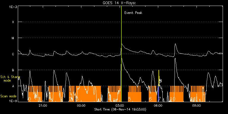 EIS Observation timeline overlay to GOES-Xray curve Code 1" 2" 40" 266" EIS Observations list for this event: STUDY ACRONYM ID DATE OBSERVED DESCRIPTION NOAA# TARGET 0 HH_Flare_raster_v6 | 43724 | 2014/11/08 19:51:13 | Major Flare Watch observation | | Flare TIMELINE ID DATE OBSERVED FITS FILE XCEN (+W/-E) YCEN (+N/-S) DUR ----------------------------------------------------------------------------------------------------------------- 43724 | 2014/11/08 19:51:13.000 | eis_l0_20141108_195113.fits.gz | -380.05 | 188.22 | 3m31s 43724 | 2014/11/08 19:54:47.000 | eis_l0_20141108_195447.fits.gz | -380.05 | 188.22 | 3m31s 43724 | 2014/11/08 19:58:21.000 | eis_l0_20141108_195821.fits.gz | -380.05 | 188.22 | 3m31s 43724 | 2014/11/08 20:01:55.000 | eis_l0_20141108_200155.fits.gz | -380.05 | 188.22 | 3m31s 43724 | 2014/11/08 20:05:29.000 | eis_l0_20141108_200529.fits.gz | -380.05 | 188.22 | 3m31s 43724 | 2014/11/08 20:09:03.000 | eis_l0_20141108_200903.fits.gz | -380.05 | 188.22 | 3m31s 43724 | 2014/11/08 20:12:37.000 | eis_l0_20141108_201237.fits.gz | -380.05 | 188.22 | 3m31s 43724 | 2014/11/08 20:16:11.000 | eis_l0_20141108_201611.fits.gz | -380.05 | 188.22 | 3m32s 43724 | 2014/11/08 20:19:45.000 | eis_l0_20141108_201945.fits.gz | -373.02 | 187.84 | 3m32s 43724 | 2014/11/08 20:23:20.000 | eis_l0_20141108_202320.fits.gz | -372.64 | 187.91 | 3m31s 43724 | 2014/11/08 20:26:54.000 | eis_l0_20141108_202654.fits.gz | -372.10 | 187.99 | 3m31s 43724 | 2014/11/08 20:30:27.000 | eis_l0_20141108_203027.fits.gz | -371.55 | 187.91 | 3m32s 43724 | 2014/11/08 20:34:02.000 | eis_l0_20141108_203402.fits.gz | -370.70 | 187.84 | 3m31s 43724 | 2014/11/08 20:37:36.000 | eis_l0_20141108_203736.fits.gz | -370.70 | 187.99 | 3m31s 43724 | 2014/11/08 20:41:10.000 | eis_l0_20141108_204110.fits.gz | -370.24 | 187.91 | 3m31s 43724 | 2014/11/08 20:44:44.000 | eis_l0_20141108_204444.fits.gz | -369.70 | 187.91 | 3m32s 43724 | 2014/11/08 20:48:19.000 | eis_l0_20141108_204819.fits.gz | -369.08 | 187.99 | 3m31s 43724 | 2014/11/08 20:51:53.000 | eis_l0_20141108_205153.fits.gz | -380.05 | 188.22 | 3m31s 1 HH_Flare_raster_v6 | 43725 | 2014/11/08 21:28:13 | Major Flare Watch observation | | Flare TIMELINE ID DATE OBSERVED FITS FILE XCEN (+W/-E) YCEN (+N/-S) DUR ----------------------------------------------------------------------------------------------------------------- 43725 | 2014/11/08 21:28:13.000 | eis_l0_20141108_212813.fits.gz | -363.37 | 187.76 | 3m31s 43725 | 2014/11/08 21:31:47.000 | eis_l0_20141108_213147.fits.gz | -363.06 | 187.91 | 3m31s 43725 | 2014/11/08 21:35:21.000 | eis_l0_20141108_213521.fits.gz | -362.59 | 187.84 | 3m32s 43725 | 2014/11/08 21:38:56.000 | eis_l0_20141108_213856.fits.gz | -362.05 | 187.68 | 3m30s 43725 | 2014/11/08 21:42:29.000 | eis_l0_20141108_214229.fits.gz | -367.62 | 187.91 | 3m32s 43725 | 2014/11/08 21:46:04.000 | eis_l0_20141108_214604.fits.gz | -367.62 | 187.91 | 3m32s 43725 | 2014/11/08 21:49:38.000 | eis_l0_20141108_214938.fits.gz | -360.35 | 187.68 | 3m31s 43725 | 2014/11/08 21:53:12.000 | eis_l0_20141108_215312.fits.gz | -360.05 | 187.68 | 3m32s 43725 | 2014/11/08 21:56:46.000 | eis_l0_20141108_215646.fits.gz | -359.58 | 187.68 | 3m31s 43725 | 2014/11/08 22:00:20.000 | eis_l0_20141108_220020.fits.gz | -359.12 | 187.61 | 3m32s 43725 | 2014/11/08 22:03:55.000 | eis_l0_20141108_220355.fits.gz | -358.58 | 187.61 | 3m31s 43725 | 2014/11/08 22:07:29.000 | eis_l0_20141108_220729.fits.gz | -358.11 | 187.68 | 3m32s 43725 | 2014/11/08 22:11:04.000 | eis_l0_20141108_221104.fits.gz | -357.50 | 187.68 | 3m31s 43725 | 2014/11/08 22:14:38.000 | eis_l0_20141108_221438.fits.gz | -357.03 | 187.53 | 3m32s 43725 | 2014/11/08 22:18:12.000 | eis_l0_20141108_221812.fits.gz | -356.57 | 187.68 | 3m32s 43725 | 2014/11/08 22:21:46.000 | eis_l0_20141108_222146.fits.gz | -356.11 | 187.76 | 3m32s 43725 | 2014/11/08 22:25:20.000 | eis_l0_20141108_222520.fits.gz | -355.57 | 187.76 | 3m32s 43725 | 2014/11/08 22:28:55.000 | eis_l0_20141108_222855.fits.gz | -355.10 | 187.68 | 3m31s 2 HH_Flare_raster_v6 | 43726 | 2014/11/08 23:02:13 | Major Flare Watch observation | | Flare TIMELINE ID DATE OBSERVED FITS FILE XCEN (+W/-E) YCEN (+N/-S) DUR ----------------------------------------------------------------------------------------------------------------- 43726 | 2014/11/08 23:02:13.000 | eis_l0_20141108_230213.fits.gz | -350.39 | 187.61 | 3m31s 43726 | 2014/11/08 23:05:47.000 | eis_l0_20141108_230547.fits.gz | -349.85 | 187.61 | 3m31s 43726 | 2014/11/08 23:09:21.000 | eis_l0_20141108_230921.fits.gz | -349.39 | 187.53 | 3m32s 43726 | 2014/11/08 23:12:56.000 | eis_l0_20141108_231256.fits.gz | -348.84 | 187.61 | 3m31s 43726 | 2014/11/08 23:16:30.000 | eis_l0_20141108_231630.fits.gz | -348.46 | 187.53 | 3m32s 43726 | 2014/11/08 23:20:04.000 | eis_l0_20141108_232004.fits.gz | -347.84 | 187.45 | 3m32s 43726 | 2014/11/08 23:23:39.000 | eis_l0_20141108_232339.fits.gz | -347.45 | 187.53 | 3m31s 3 Hot_loop_osci_1 | 43700 | 2014/11/08 23:33:14 | Chromospheric dynamics in active regio | | Active Region TIMELINE ID DATE OBSERVED FITS FILE XCEN (+W/-E) YCEN (+N/-S) DUR ----------------------------------------------------------------------------------------------------------------- 43700 | 2014/11/08 23:33:14.000 | eis_l0_20141108_233314.fits.gz | -371.44 | 172.00 | 1m5s 43700 | 2014/11/08 23:34:21.000 | eis_l0_20141108_233421.fits.gz | -371.29 | 171.85 | 1m5s 43700 | 2014/11/08 23:35:29.000 | eis_l0_20141108_233529.fits.gz | -371.06 | 171.93 | 1m5s 43700 | 2014/11/08 23:36:37.000 | eis_l0_20141108_233637.fits.gz | -370.90 | 171.77 | 1m5s 43700 | 2014/11/08 23:37:45.000 | eis_l0_20141108_233745.fits.gz | -370.67 | 171.85 | 1m5s 43700 | 2014/11/08 23:38:52.000 | eis_l0_20141108_233852.fits.gz | -370.59 | 171.85 | 1m5s 43700 | 2014/11/08 23:40:00.000 | eis_l0_20141108_234000.fits.gz | -370.44 | 171.93 | 1m6s 43700 | 2014/11/08 23:41:08.000 | eis_l0_20141108_234108.fits.gz | -370.28 | 171.85 | 1m5s 43700 | 2014/11/08 23:42:16.000 | eis_l0_201